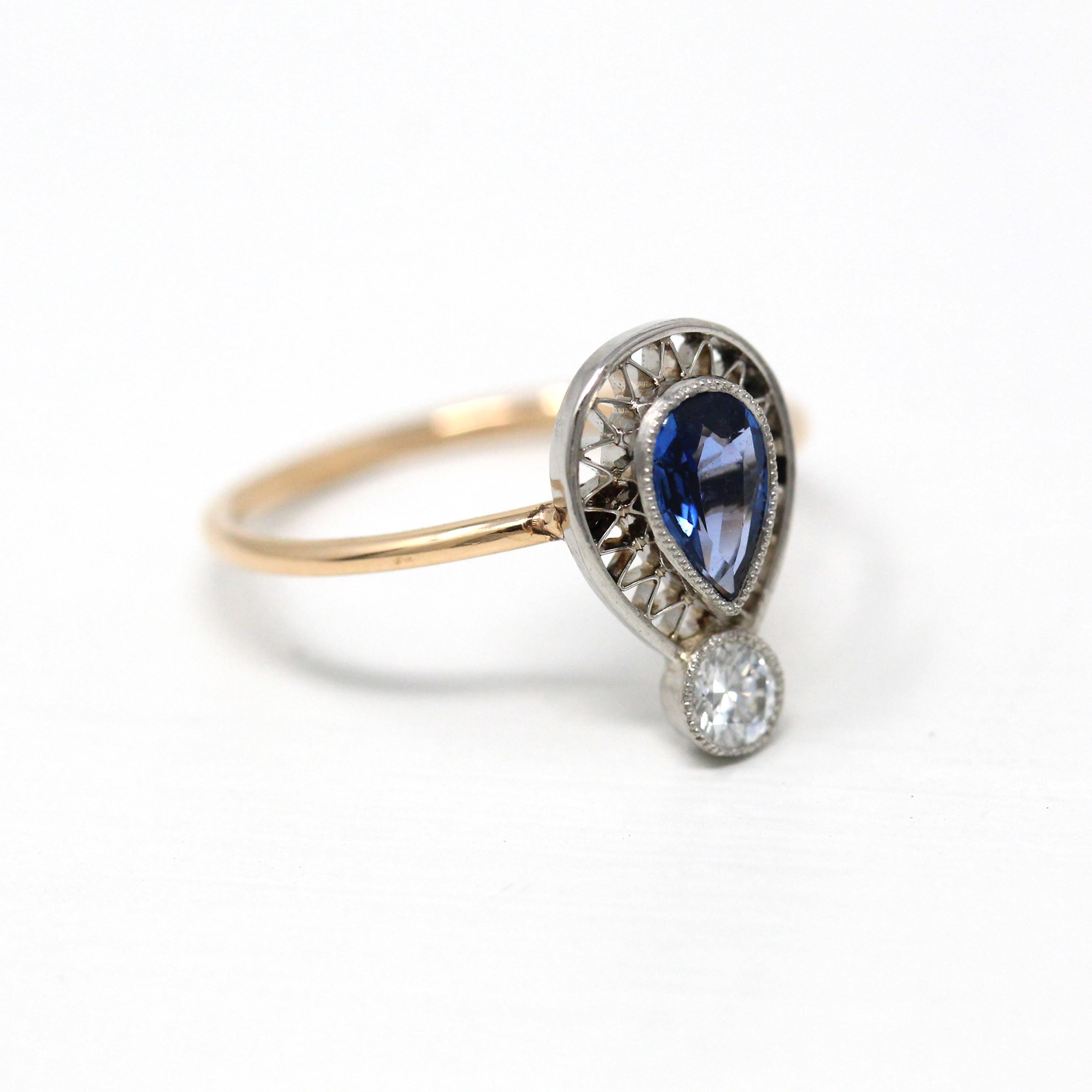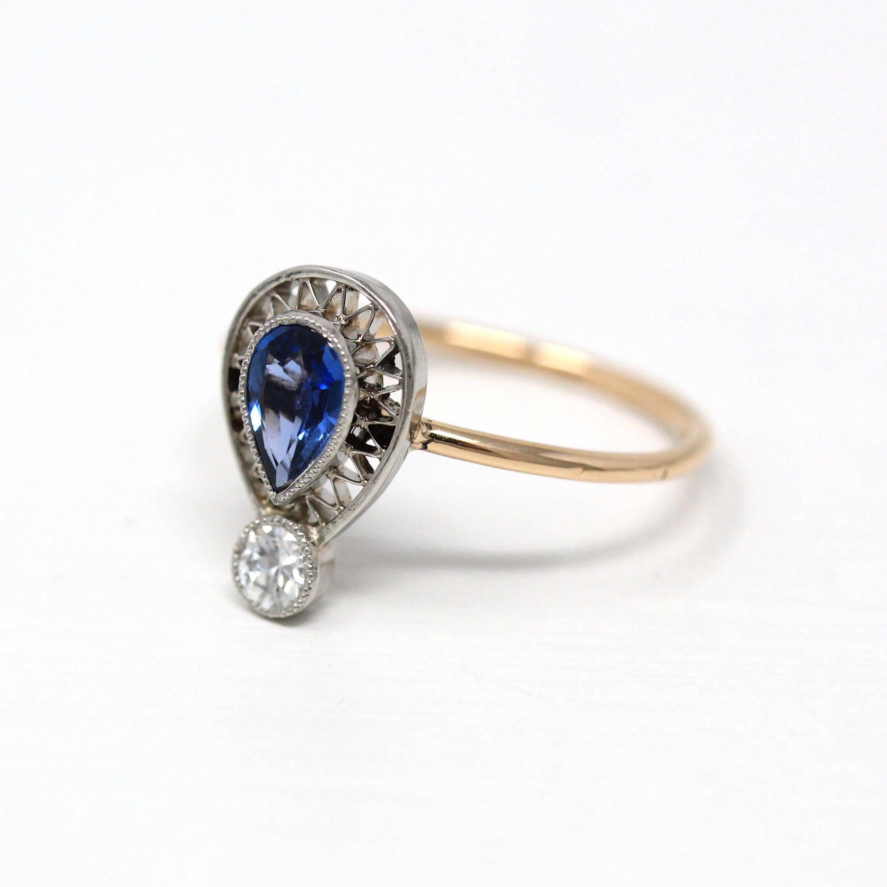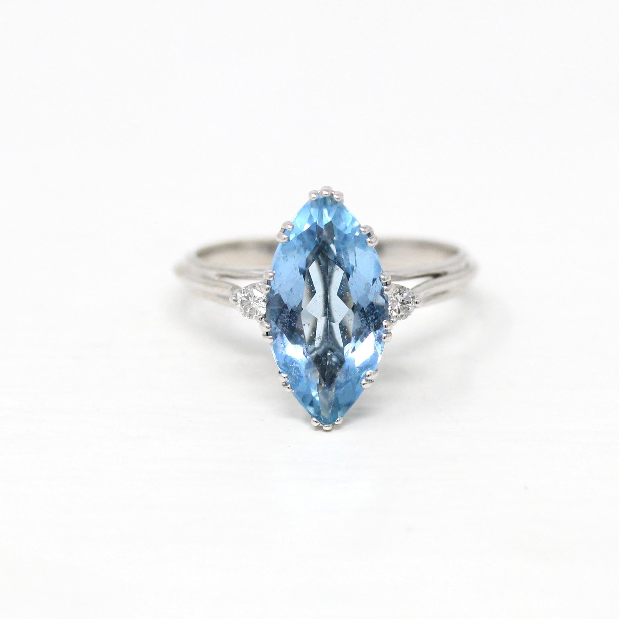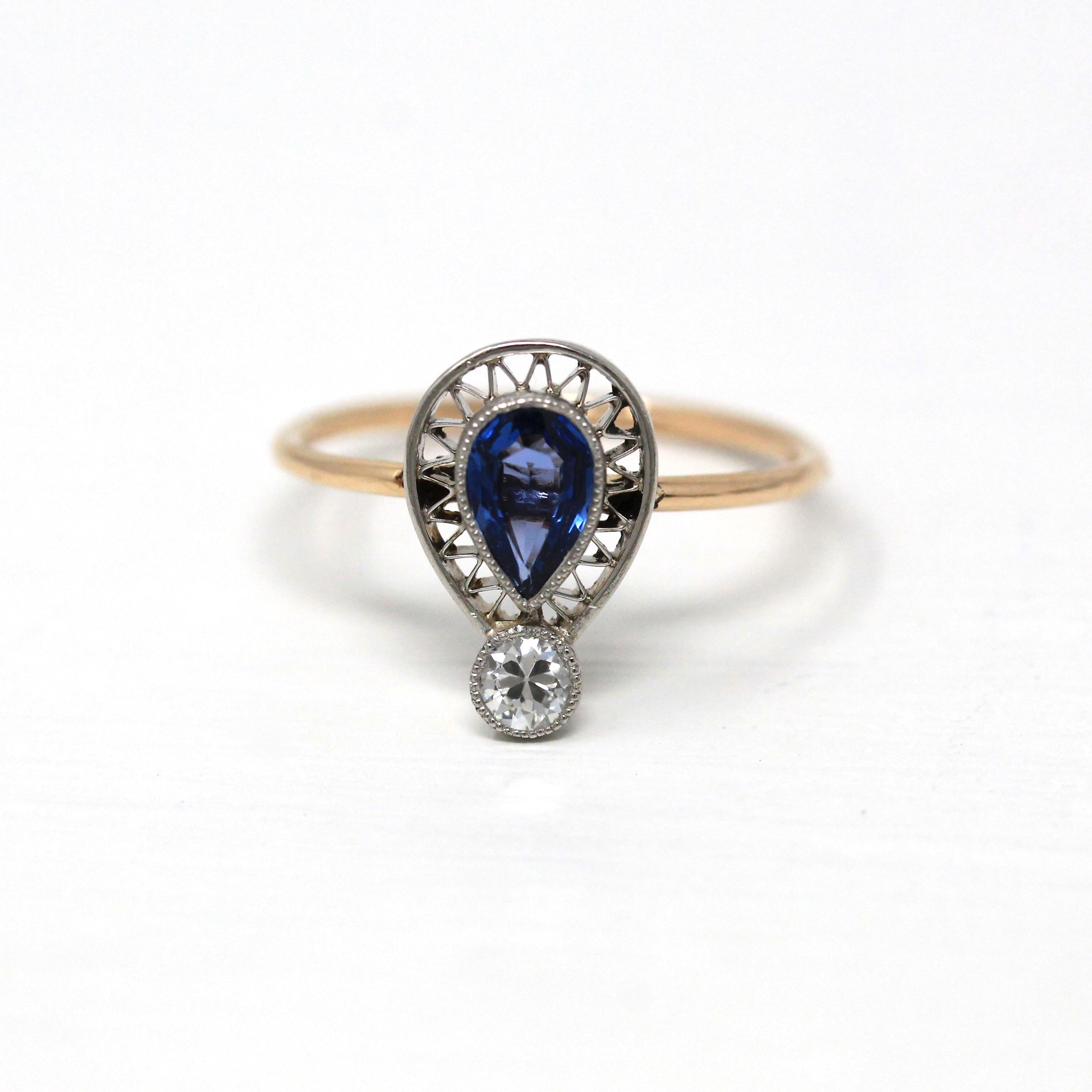 Marquise Halo Ring - Modern 14k Yellow Gold Created Sapphire Natural Diamond Gemstones - Estate Circa 1990s Size 6 Engagement Fine Jewelry