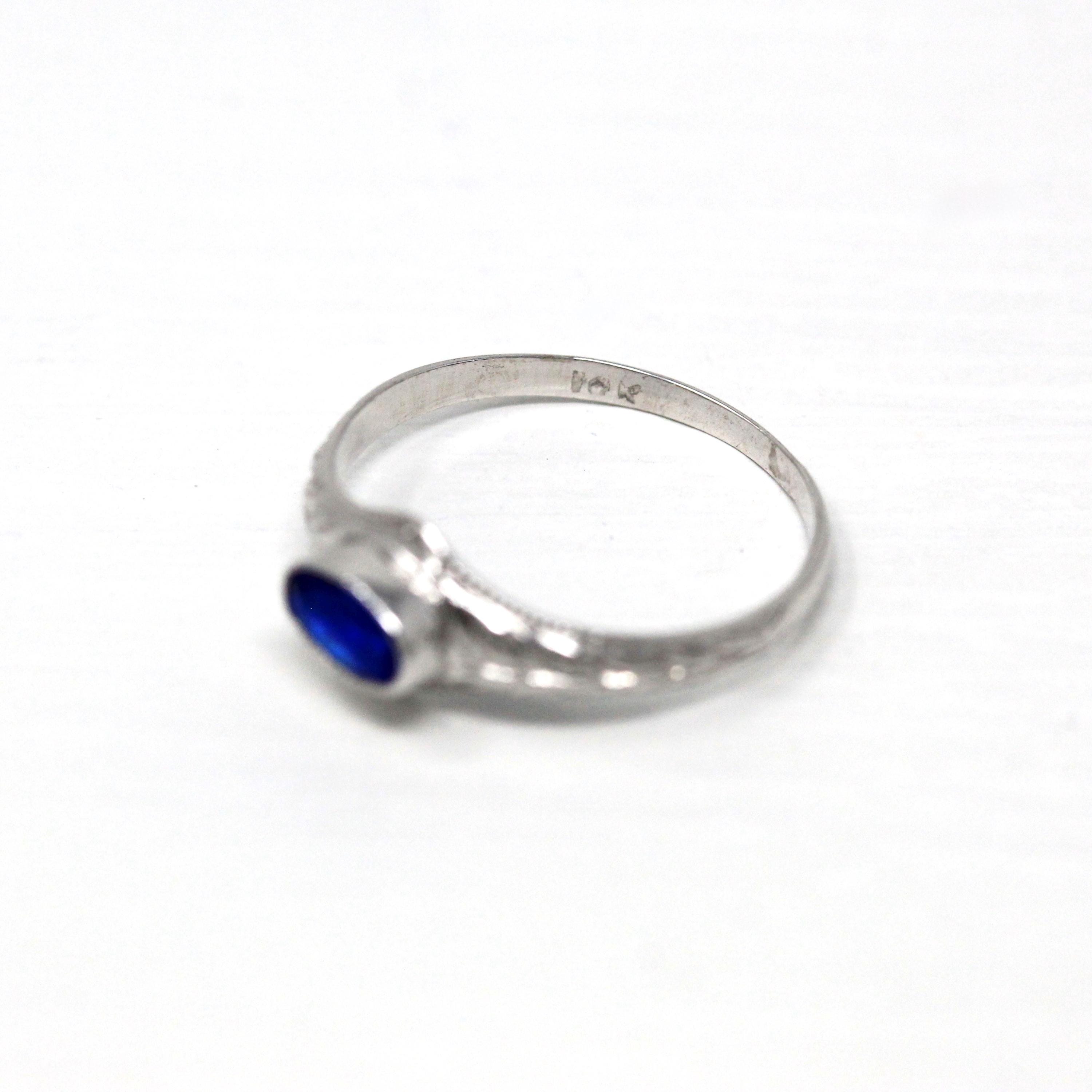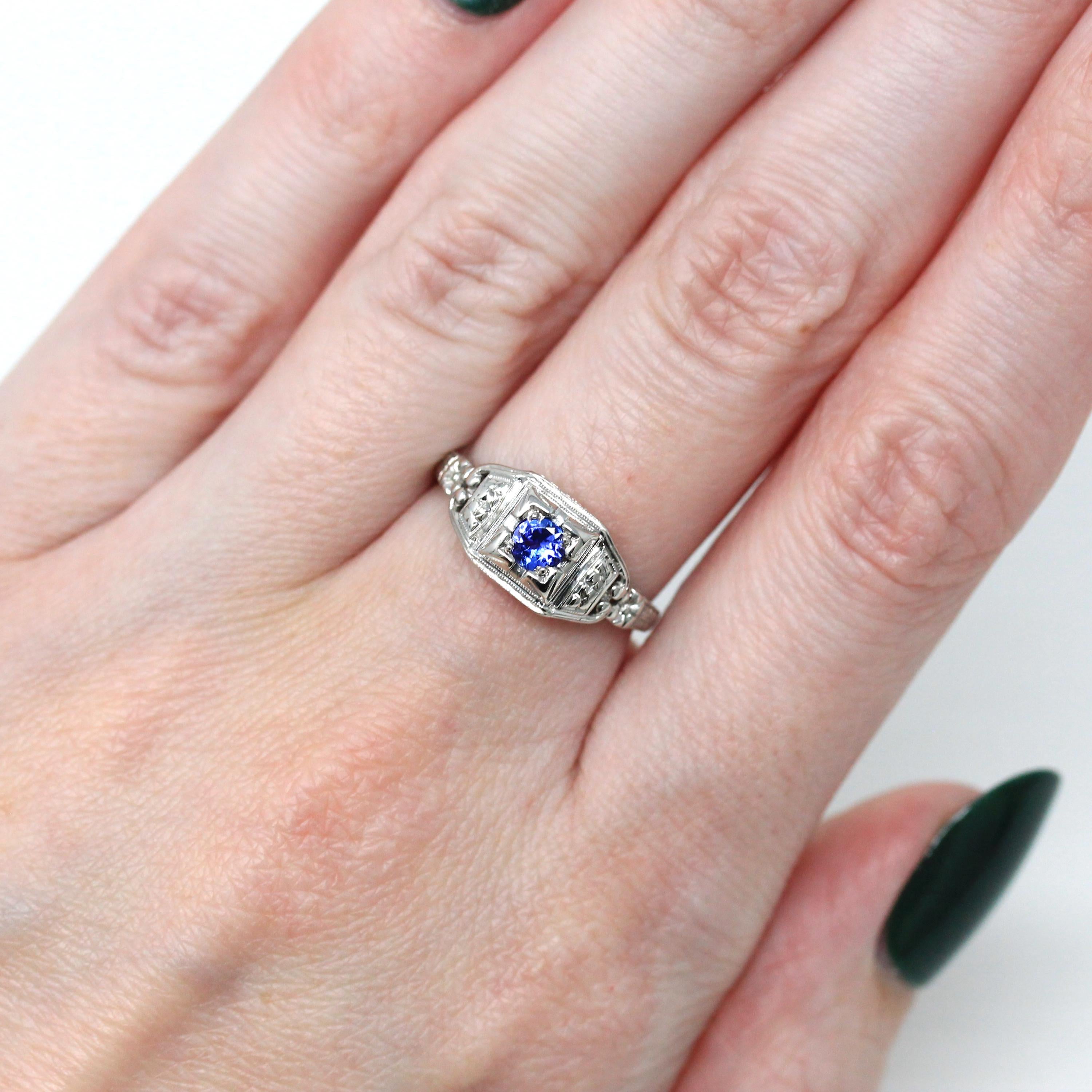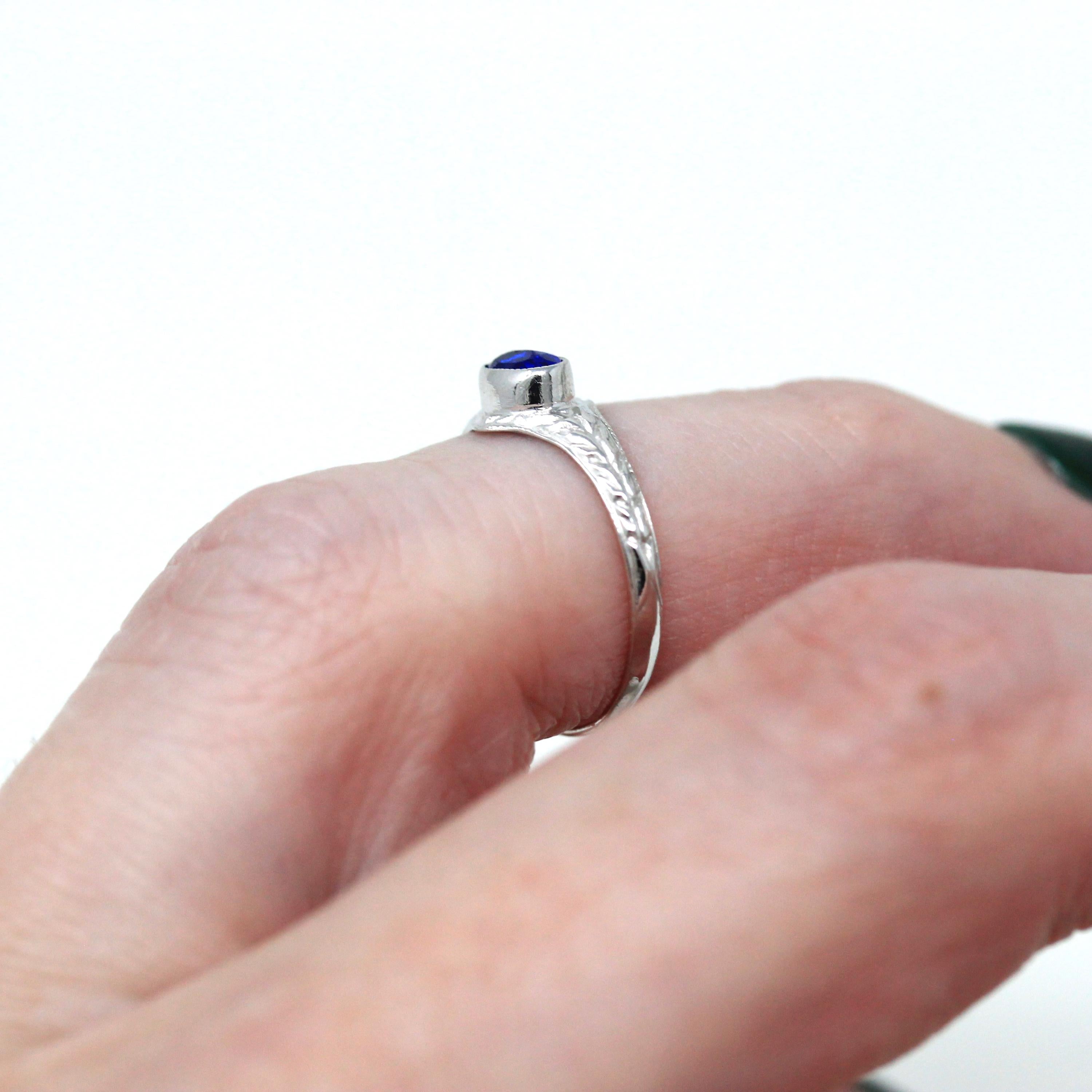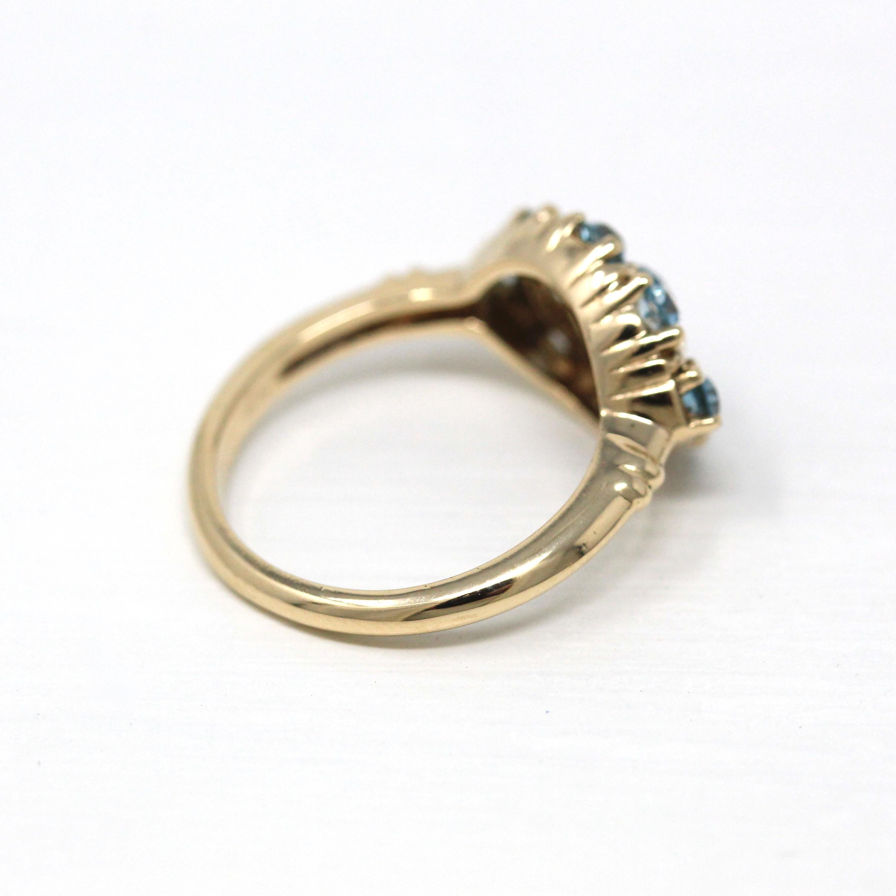 Modern Three Stone Ring - Estate 9k Yellow Gold Created Blue Sapphire & White Spinel Gemstones - Hallmarked 1989 Size 7 3/4 Fine 80s Jewelry