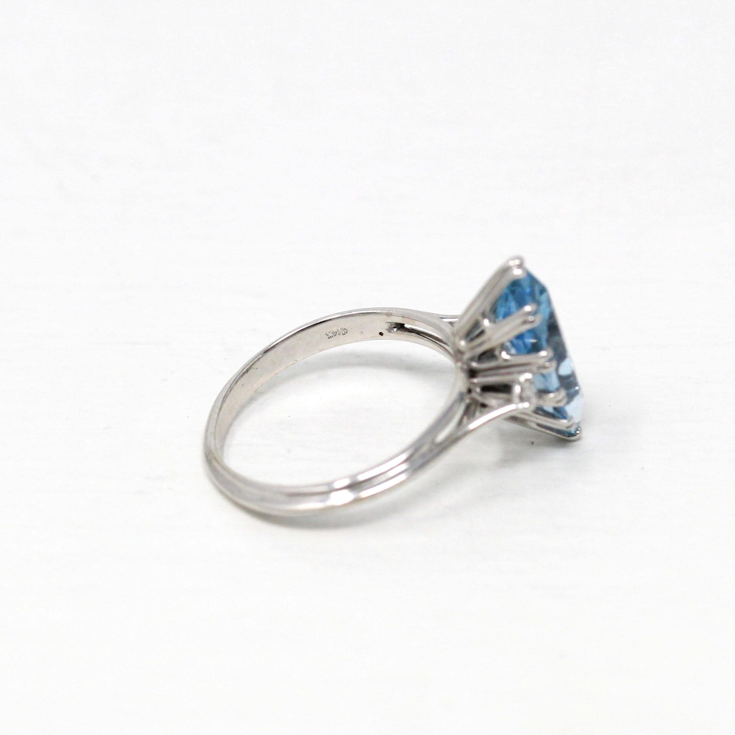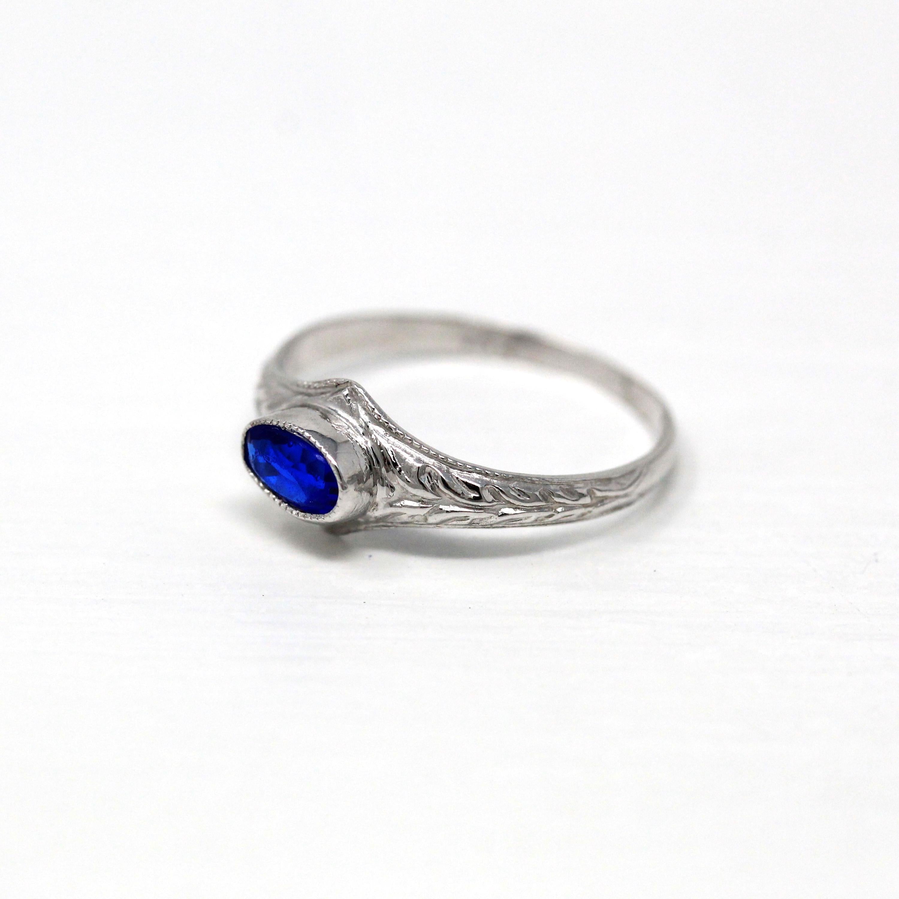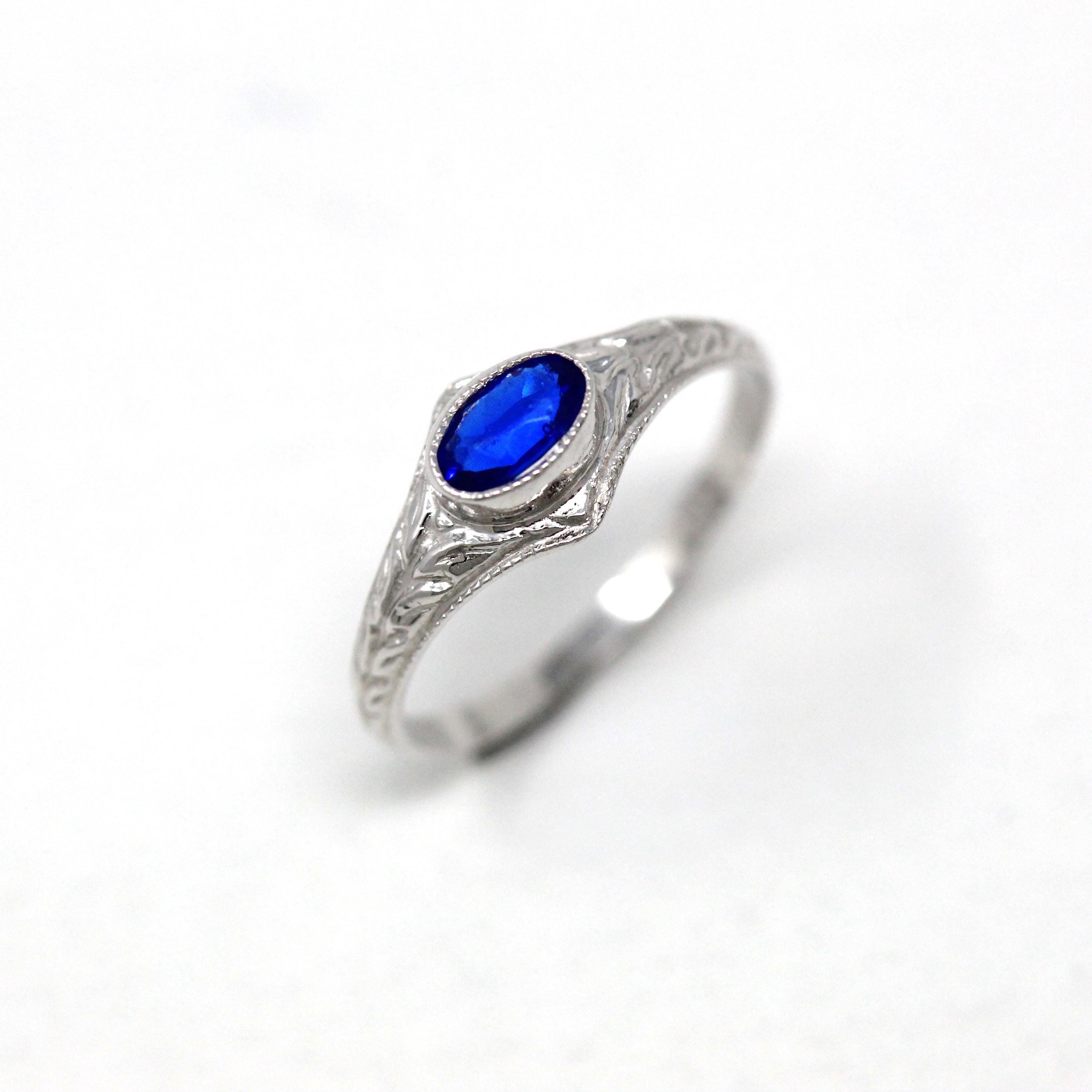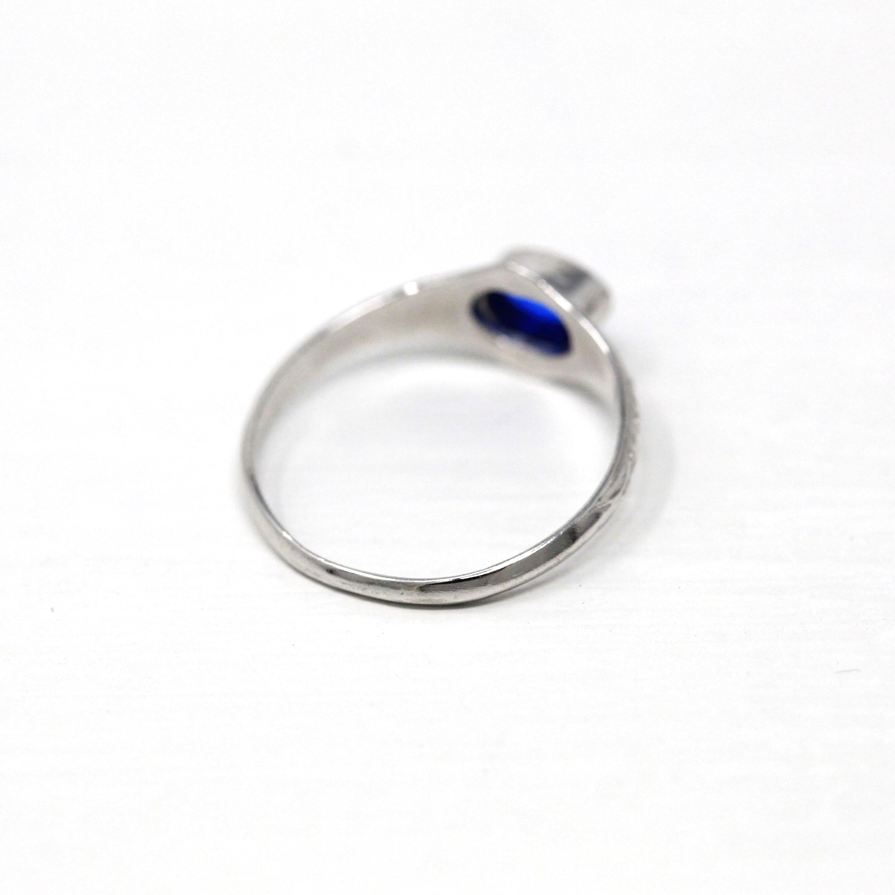 Modern Three Stone Ring - Estate 9k Yellow Gold Created Blue Sapphire & White Spinel Gemstones - Hallmarked 1989 Size 7 3/4 Fine 80s Jewelry