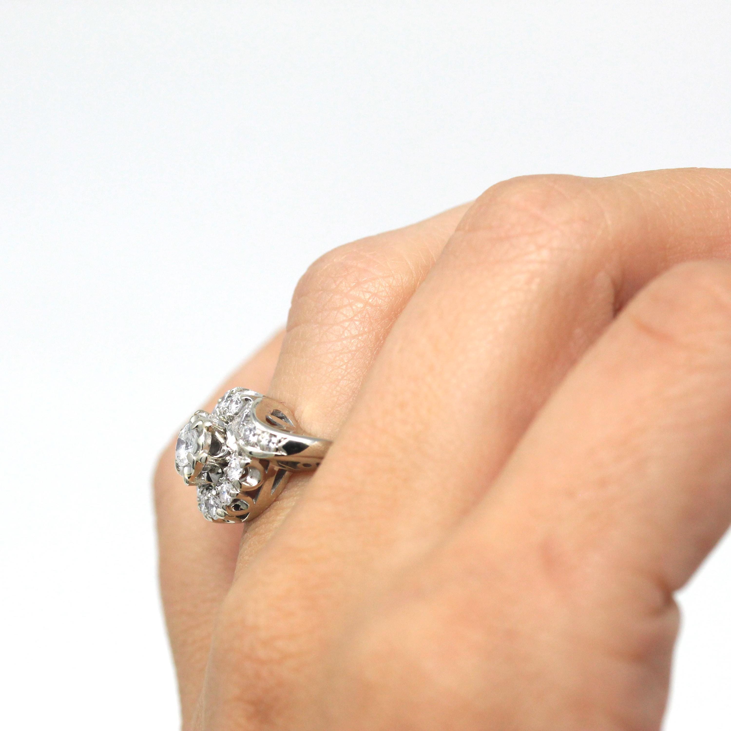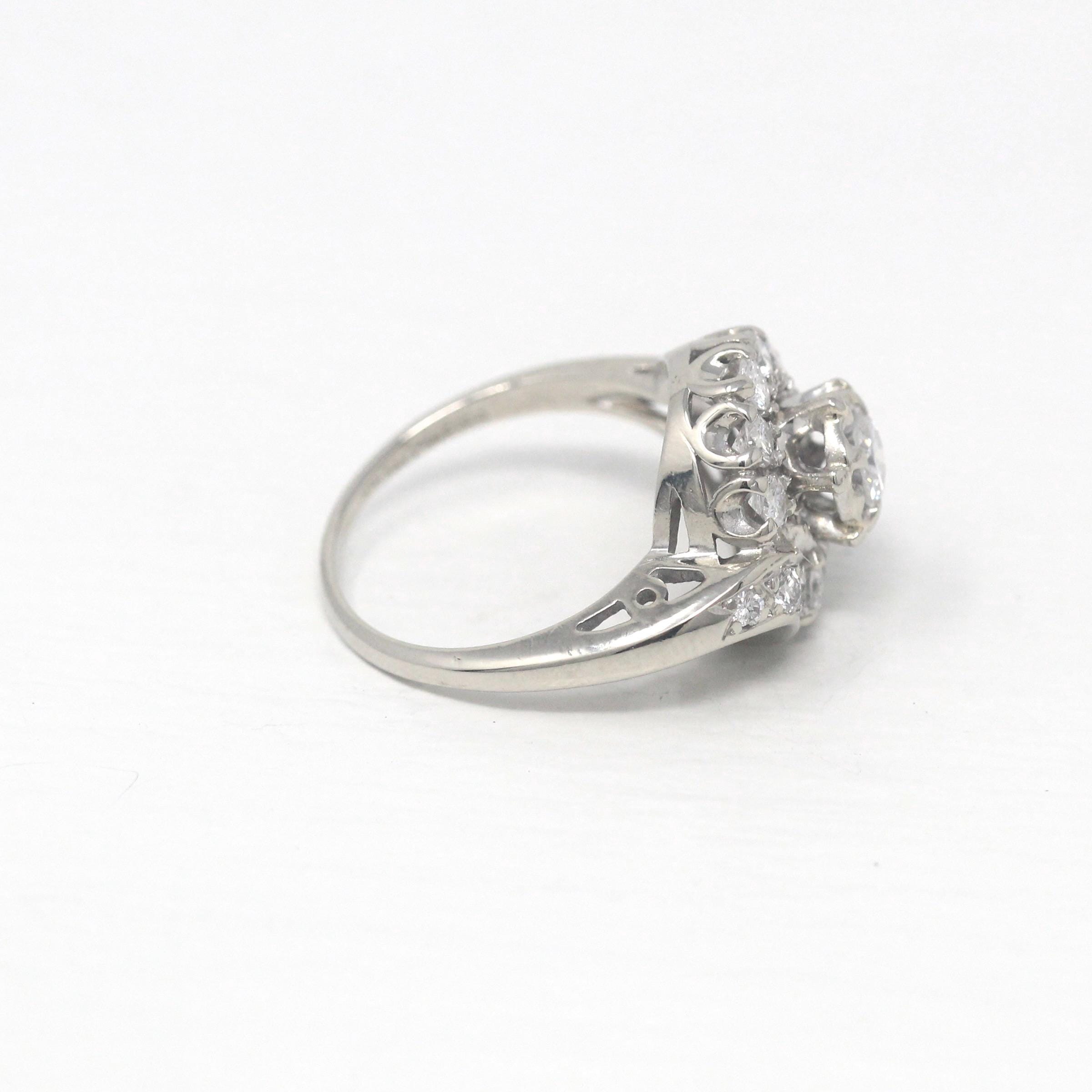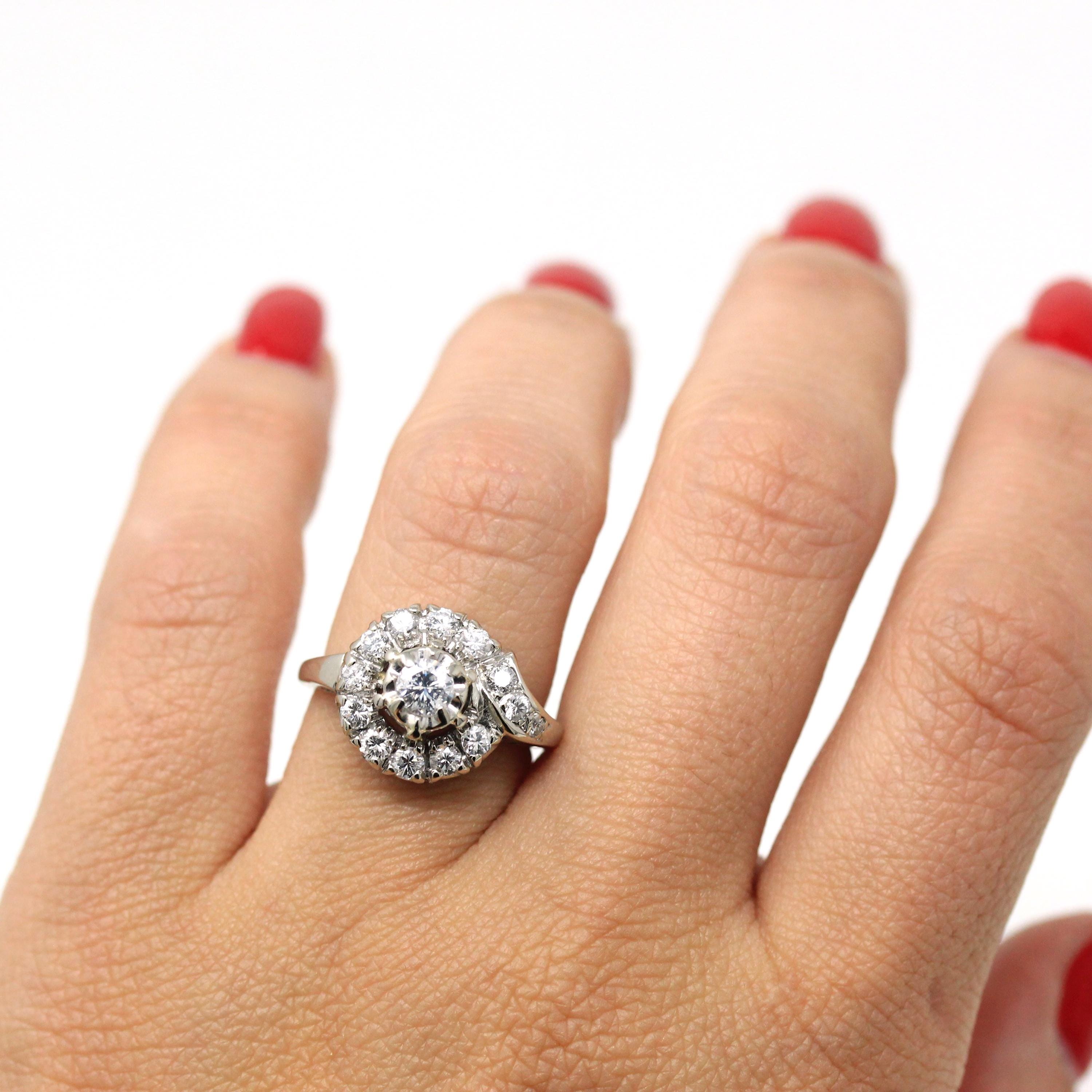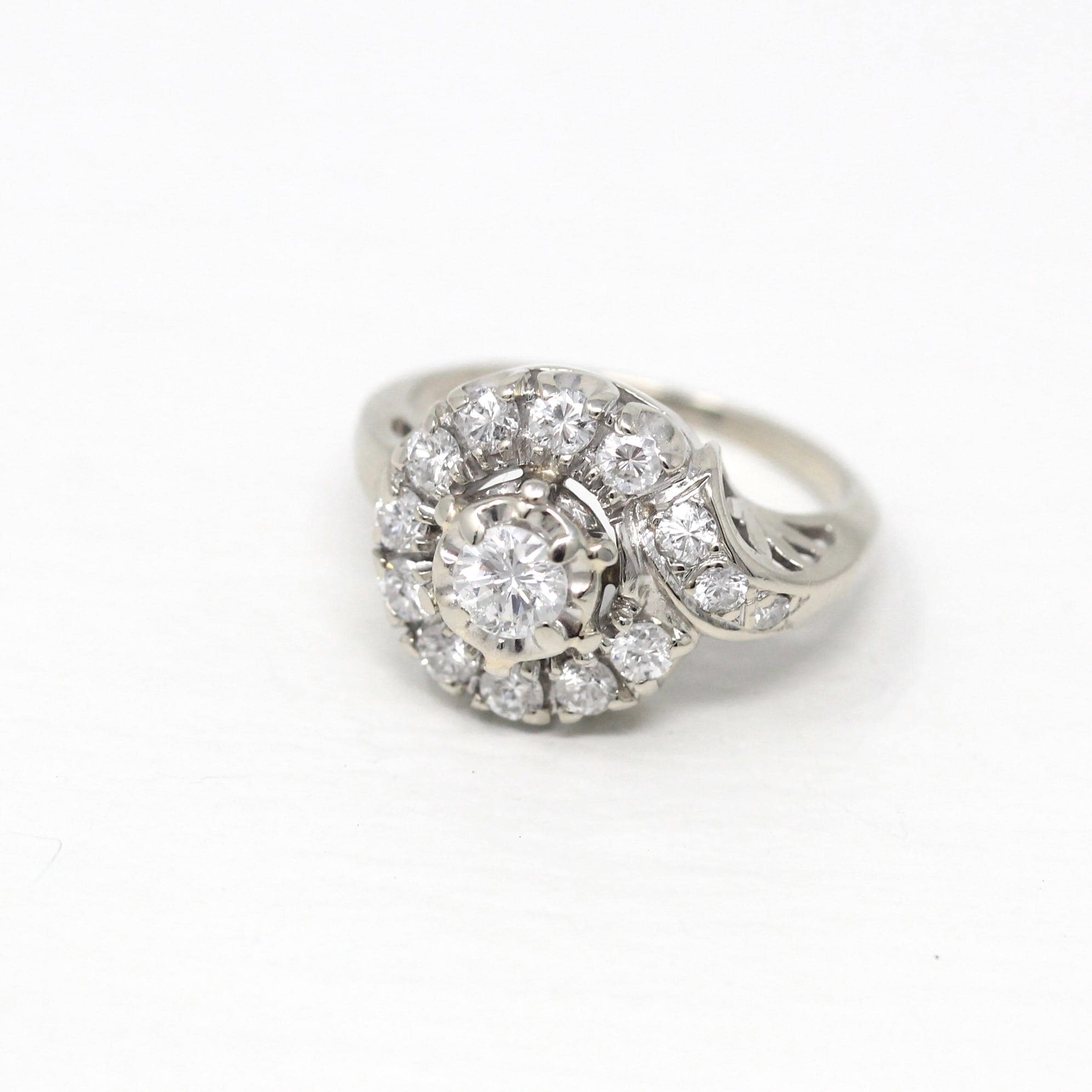 Vintage Opal & Diamond Halo Ring - Mid Century 14k White Gold Natural Gems - Retro Circa 1950s Era Size 6 1/2 Rainbow Cluster Fine Jewelry