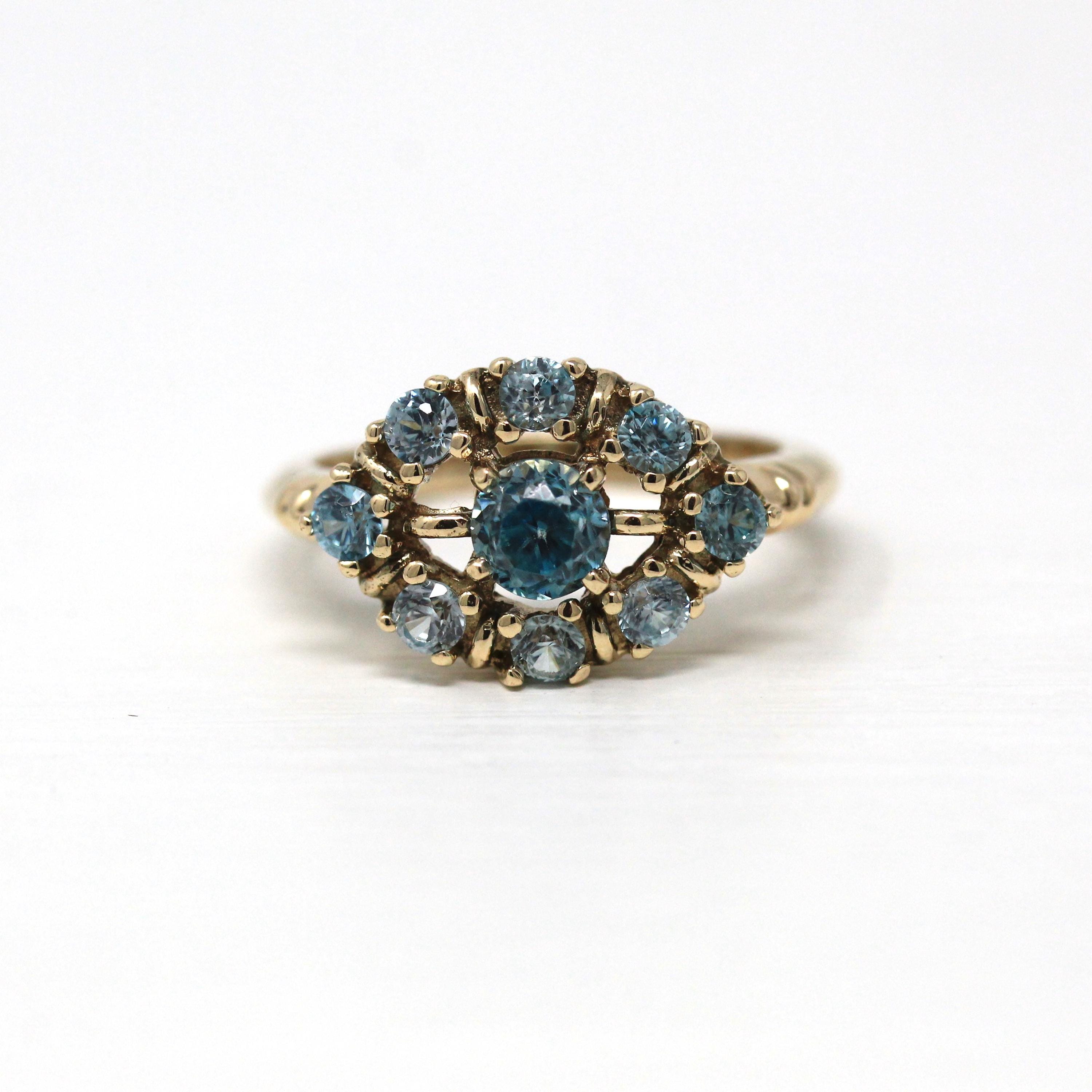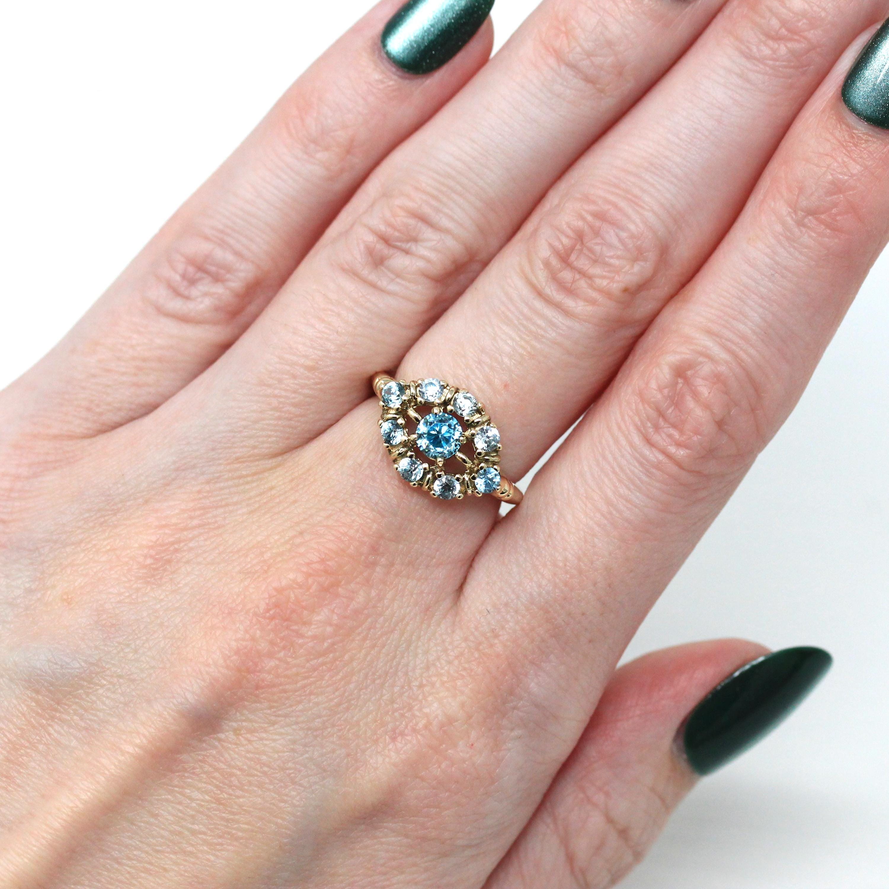 Retro Halo Ring - 9k Yellow & White Gold Oval Natural Sapphire And Diamond Gems - Hallmarked 1976 Size 5 3/4 Engagement Fine Bridal Jewelry