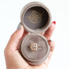 Absolut atemberaubende, Vintage-inspirierte Maejean Vintage-Ringschachtel aus plüschigem grauem Samt. Diese große und weiche graue Schachtel verfügt über einen einzigen Schlitz, in dem Sie Ihren wertvollsten Ring aufbewahren können. Der Innendeckel ist in Goldfolie mit unserem klassischen Logo MJV geprägt. Diese hübsche Schmuckschatulle wird komplett mit einer quadratischen äußeren Schutzschachtel geliefert, die ebenfalls mit unserem Logo geprägt ist. Dies wäre eine perfekte Ringschachtel für Heiratsanträge, Fotoshootings oder einfach zum Aufbewahren und Schützen Ihres wertvollen Verlobungsrings!