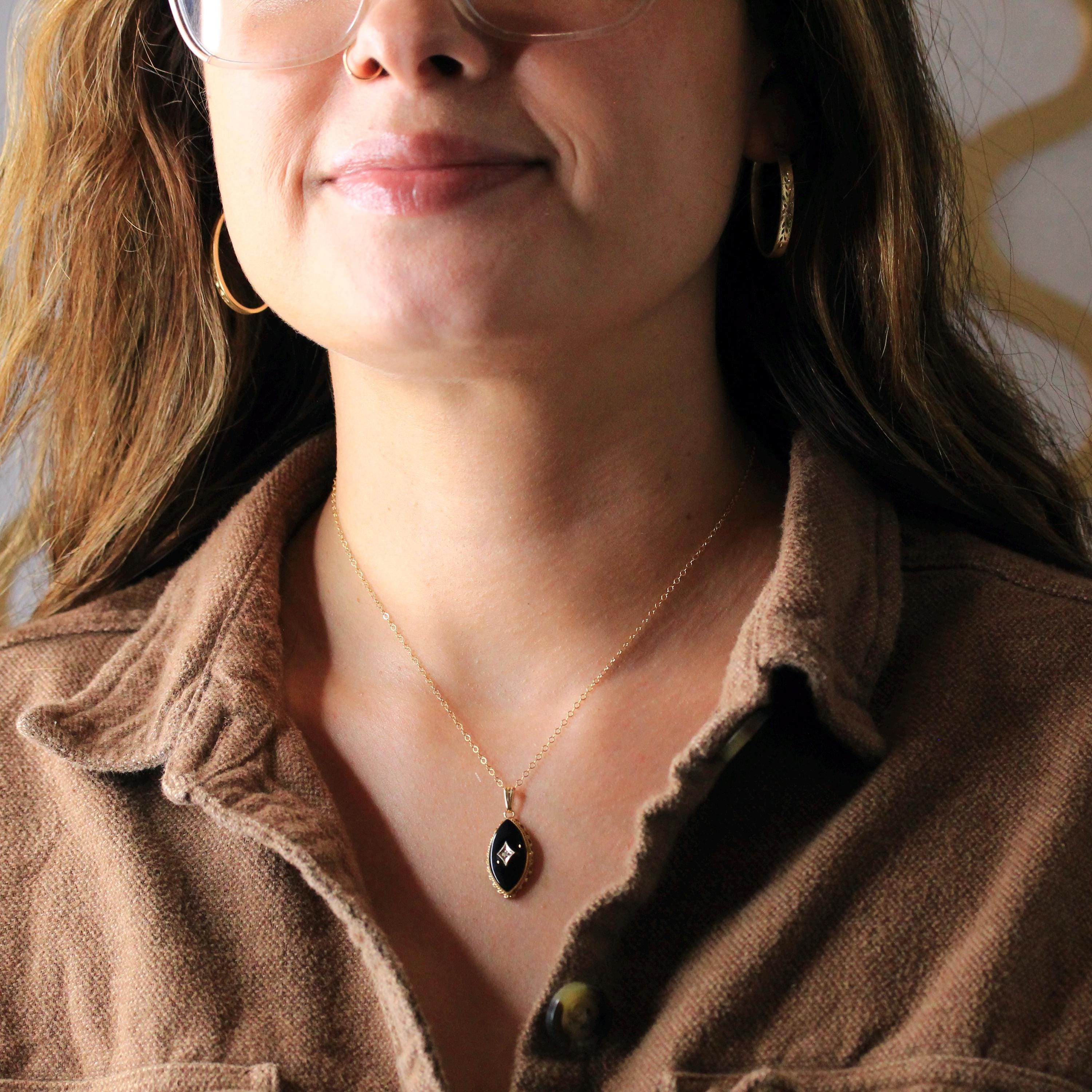 Onyx & Diamond Necklace - Retro 14k Yellow Gold Natural Black Chalcedony Gemstone Pendant Charm - Vintage 1970s Era Navette Fine 70s Jewelry