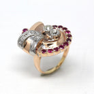 Gorgeous vintage circa 1940s Retro era 14k rose and white gold genuine ruby and genuine diamond ring! This swirl motif dinner ring is accented by 15 genuine faceted ruby gemstones which weigh approx. 1.35 carats total. In the center of the design are two genuine round brilliant cut diamonds bezel set in white gold totaling 0.48 carats. A stunning piece of fine mid century modern Retro era jewelry, from the fabulous 40s!