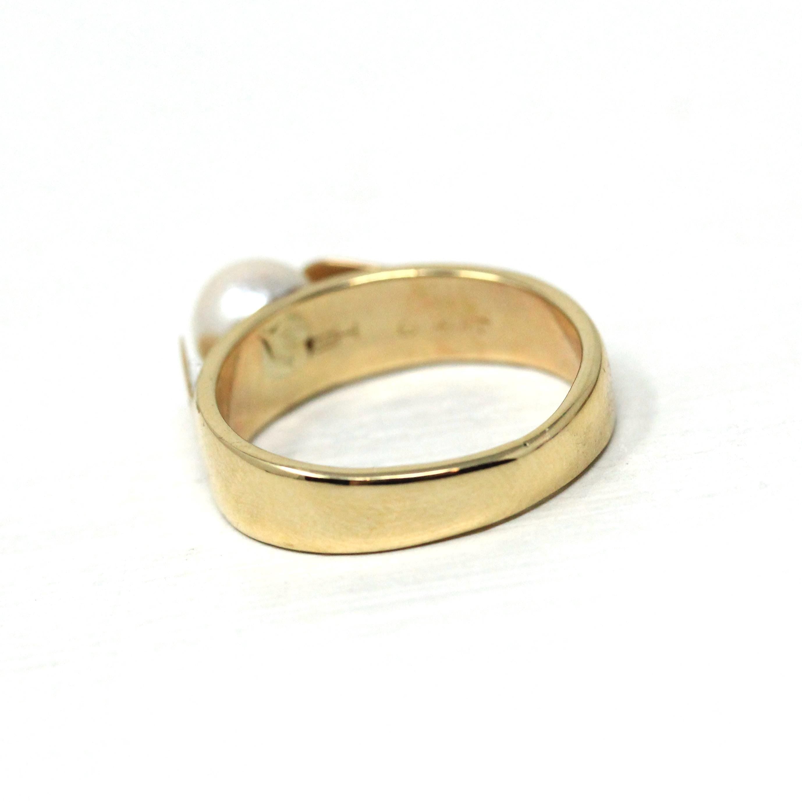 Retro Cultured Pearl Ring - Vintage 14k Yellow Gold Solitaire Style Gemstone - Circa 1970s Era Size 7 June Birthstone Fine Statement Jewelry