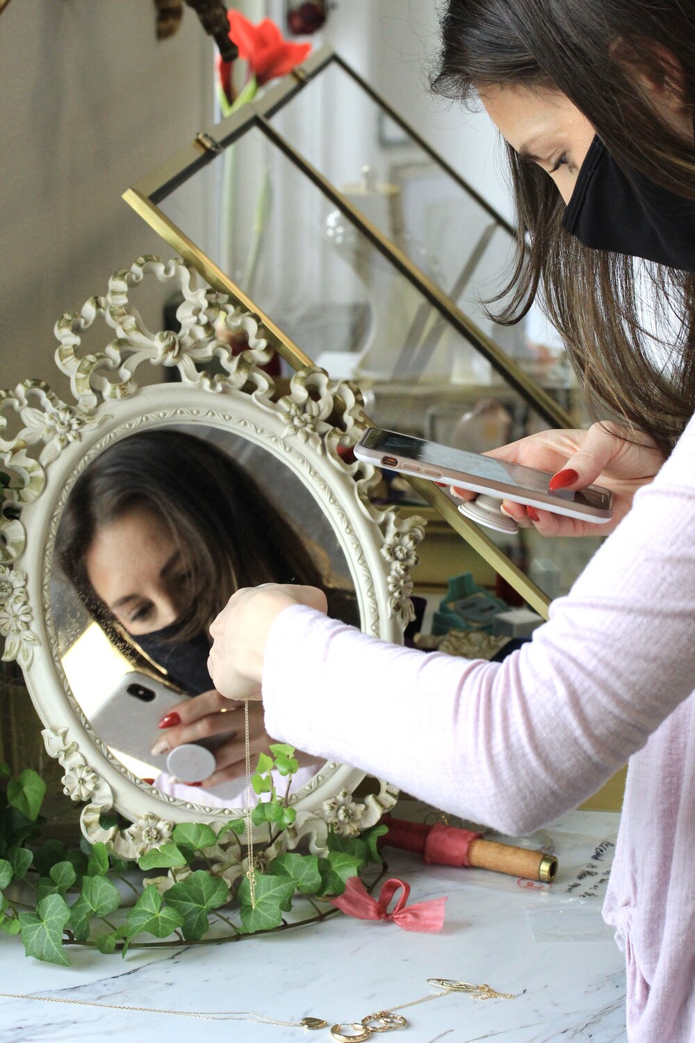 ¡Y luego estoy yo, Jess, fotógrafa de MJV! Llevo muchas funciones en Maejean (seamos honestos, ¡todos lo hacemos!), pero soy la cara amigable detrás de la cámara en todas nuestras fotografías de productos y sesiones de fotos de equipo. También me encontrarás creando contenido, respondiendo tus preguntas en Etsy, escribiendo para nuestros correos electrónicos y blogs, y seleccionando tu dosis diaria de inspiración de joyería vintage en el feed de Pinterest de Maejean. ¡Me encanta encontrar nuevas formas de capturar un brillo vintage en la cámara para compartir con todos ustedes!
