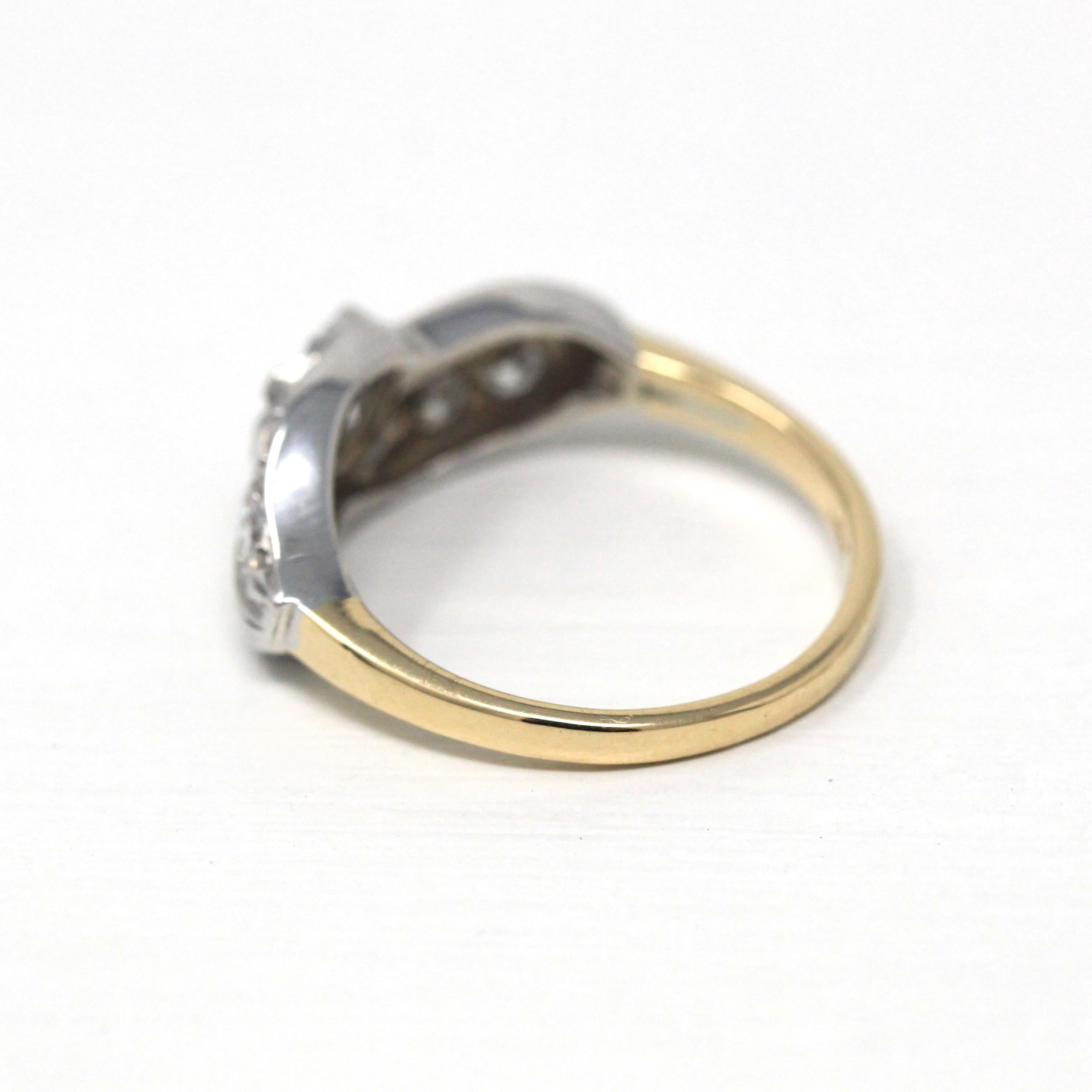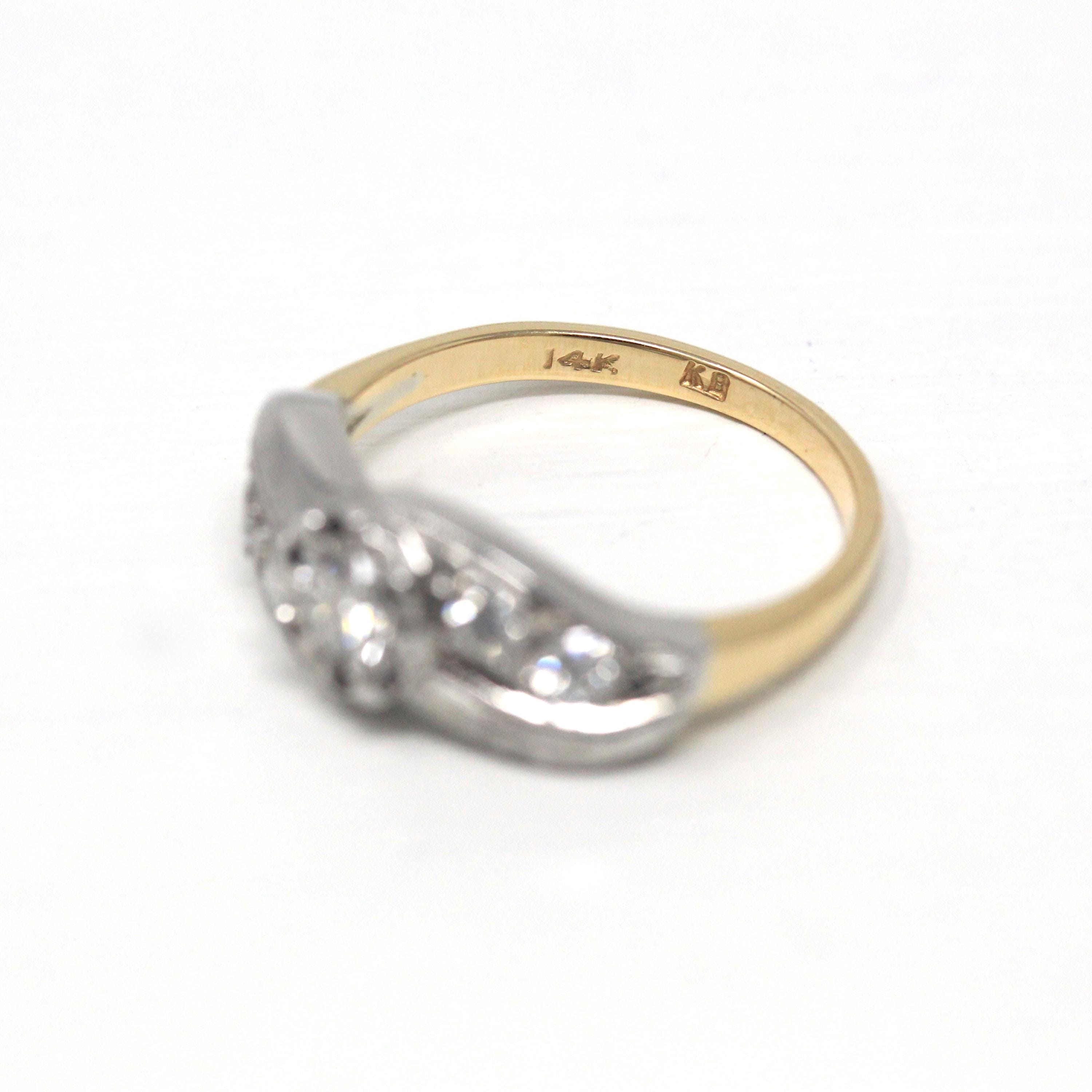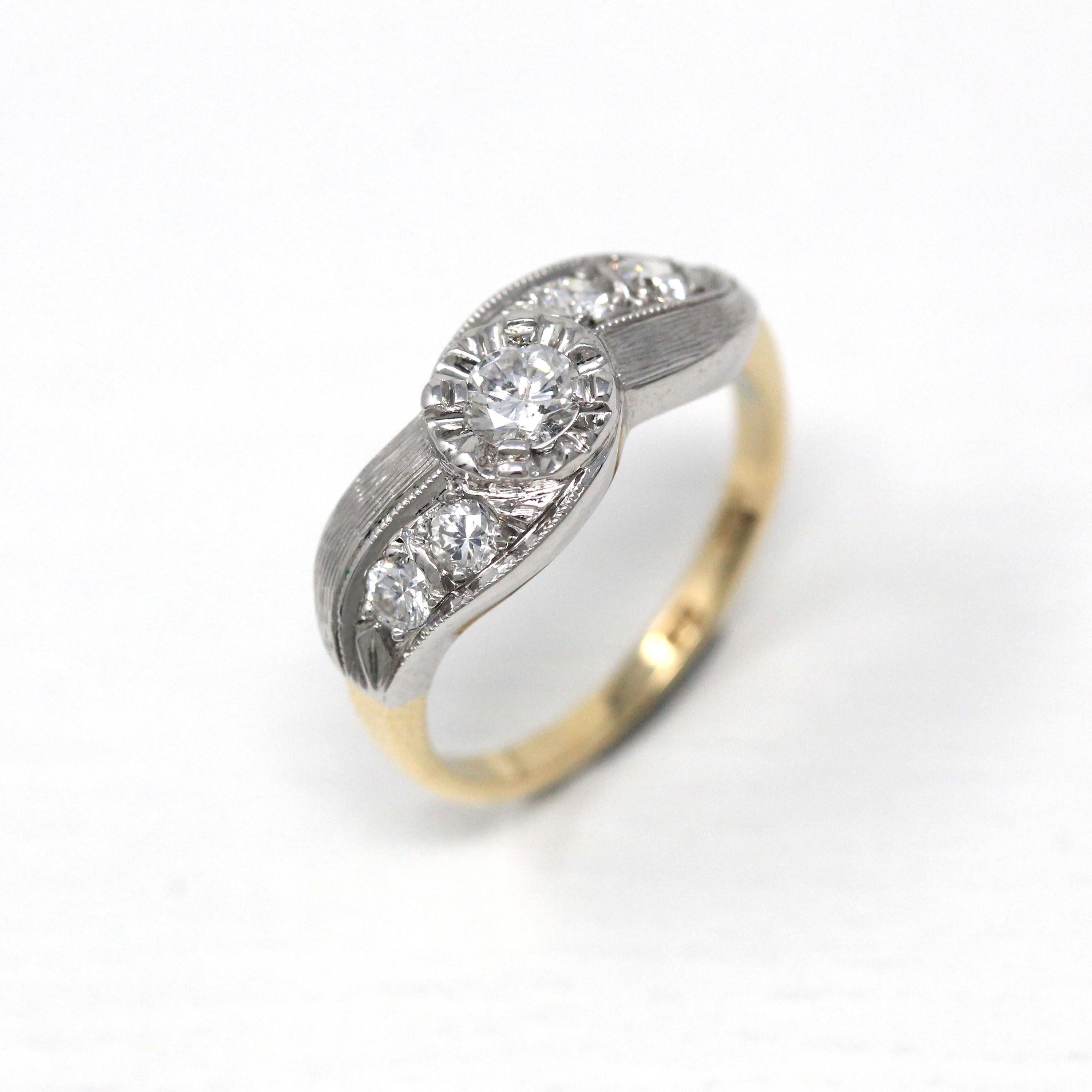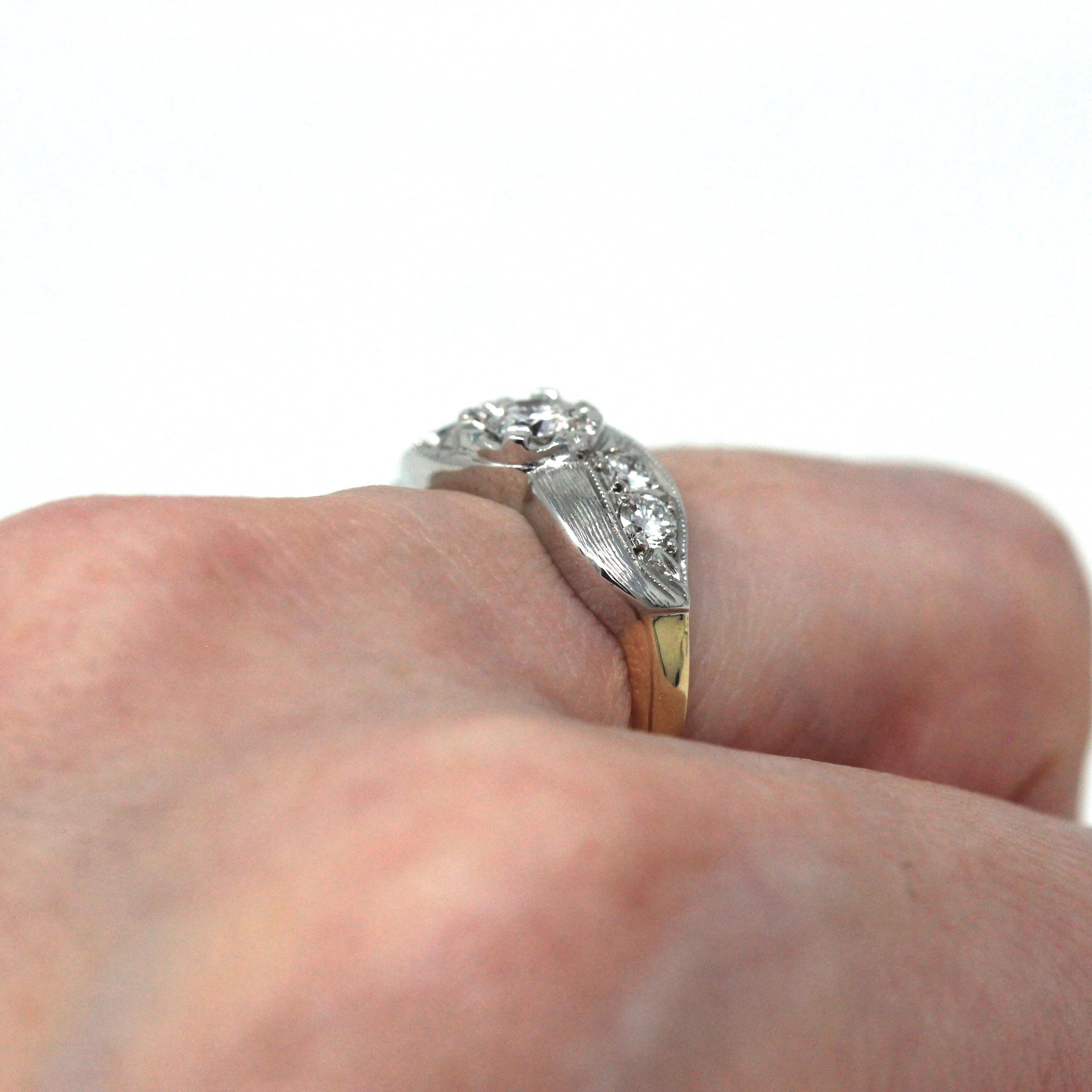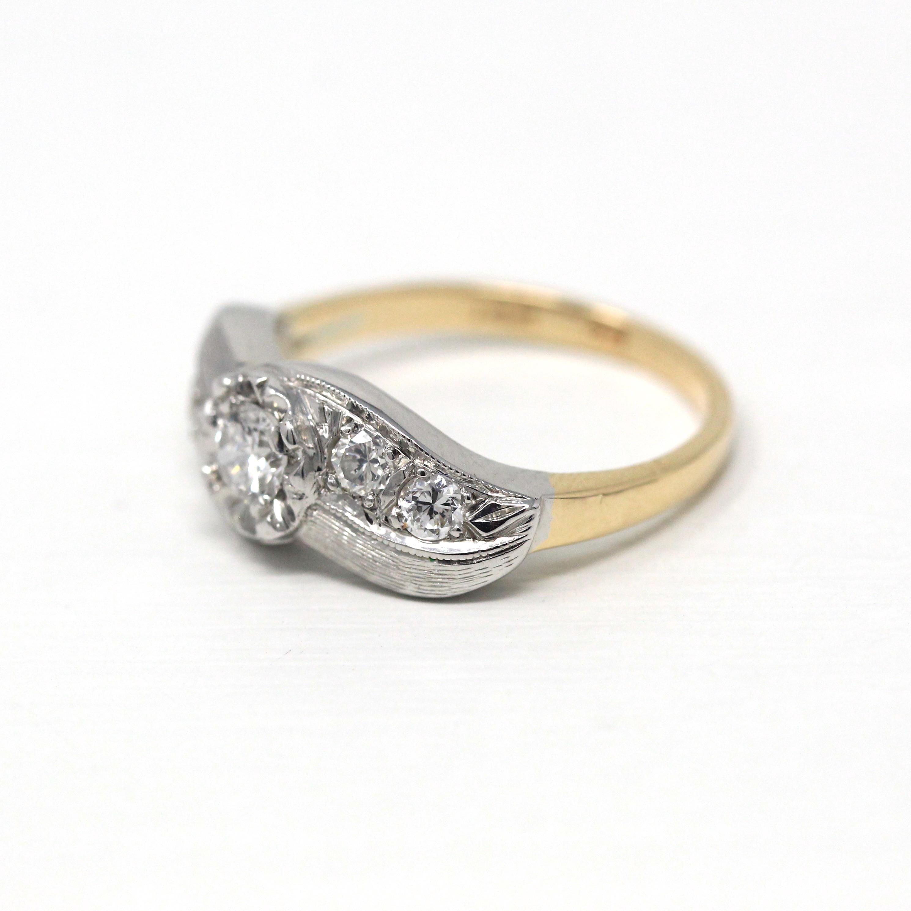 Three Stone Ring - Retro 18k Yellow Gold & Platinum Diamond Ring - Vintage Circa 1960s Era Size 6 1/4 Engagement Anniversary Fine Jewelry