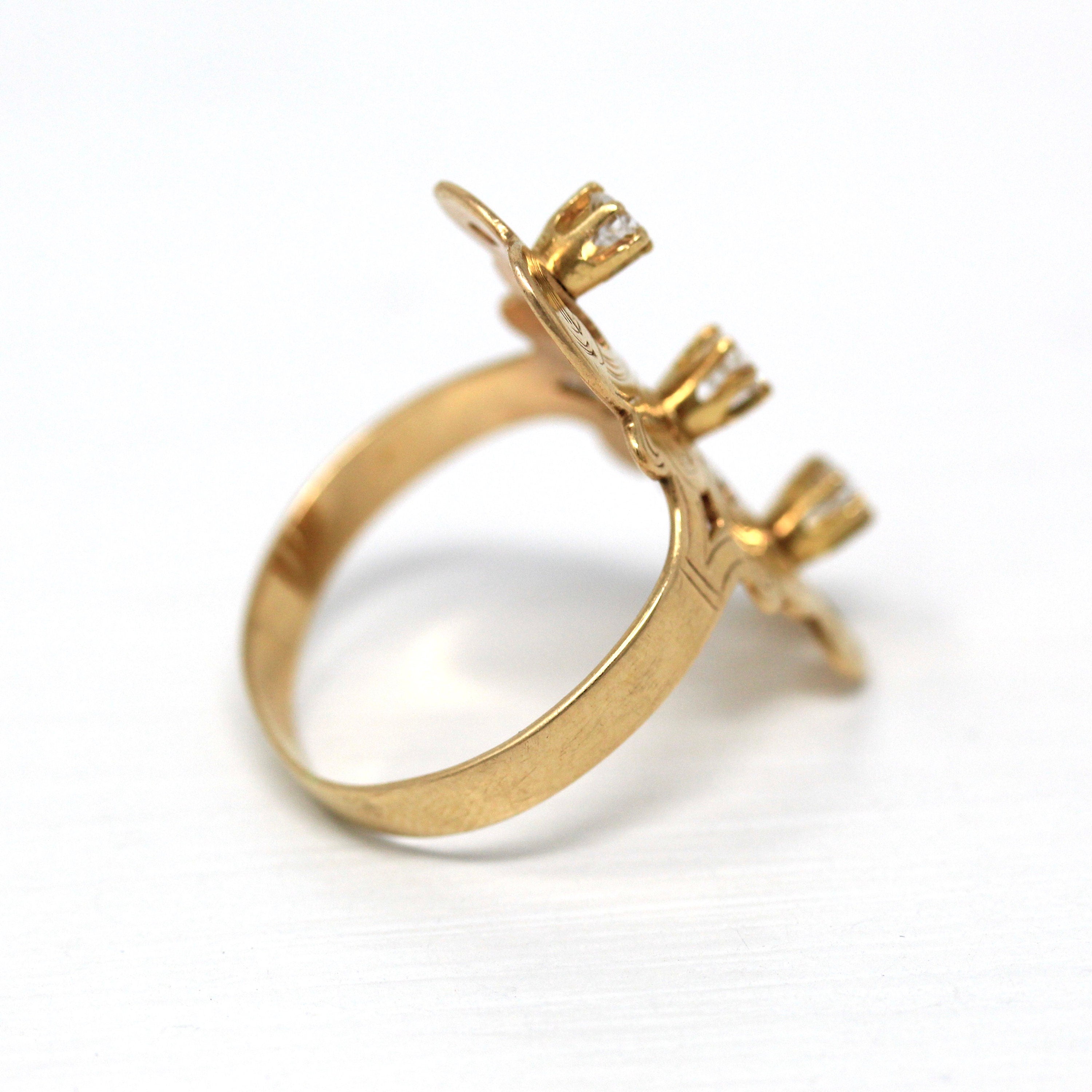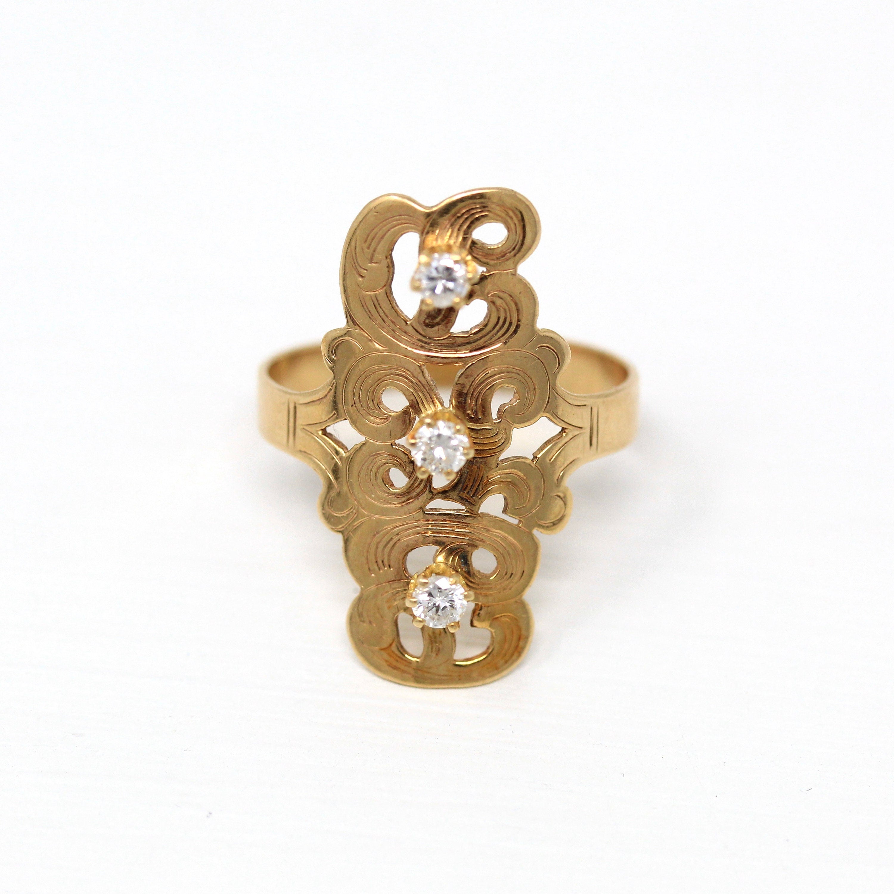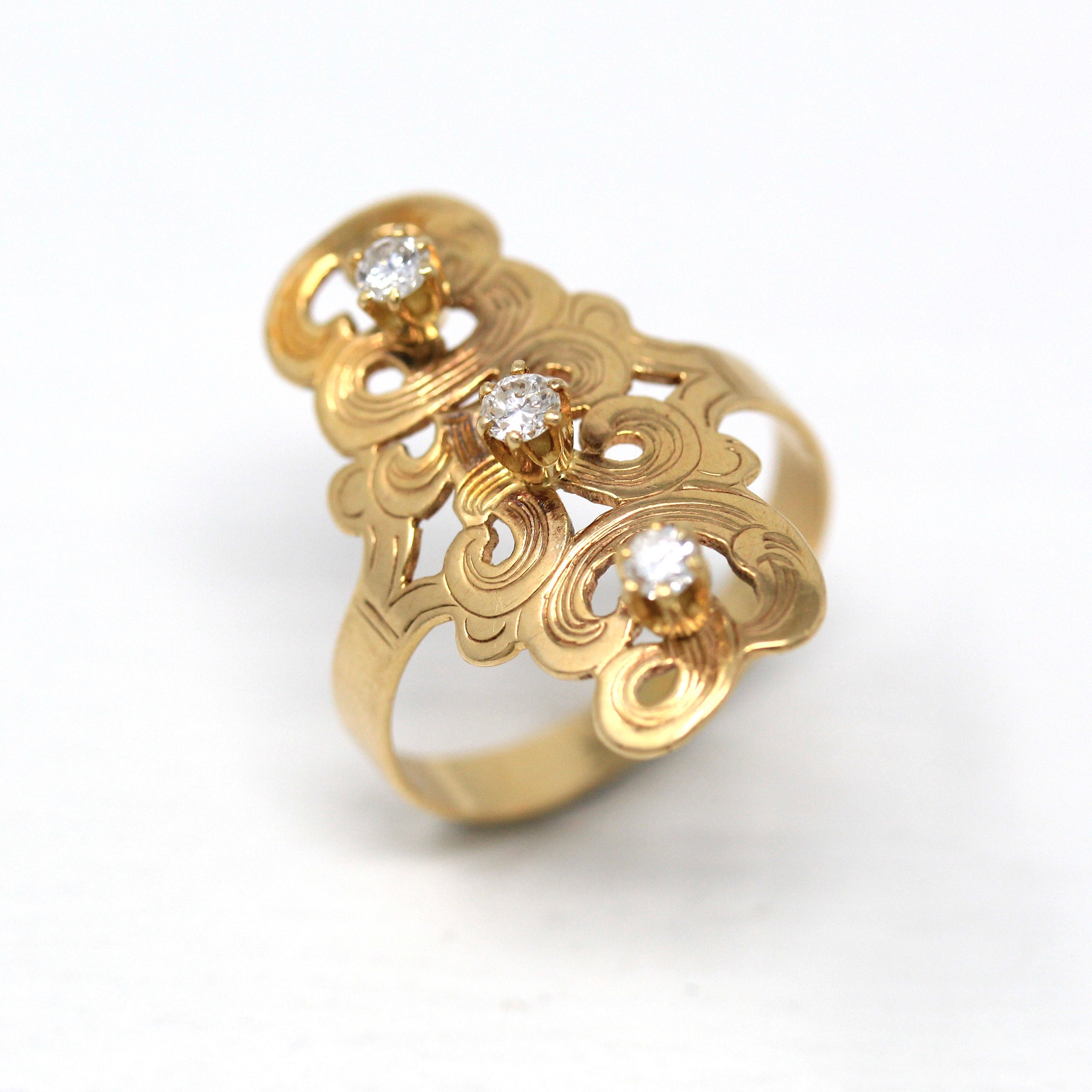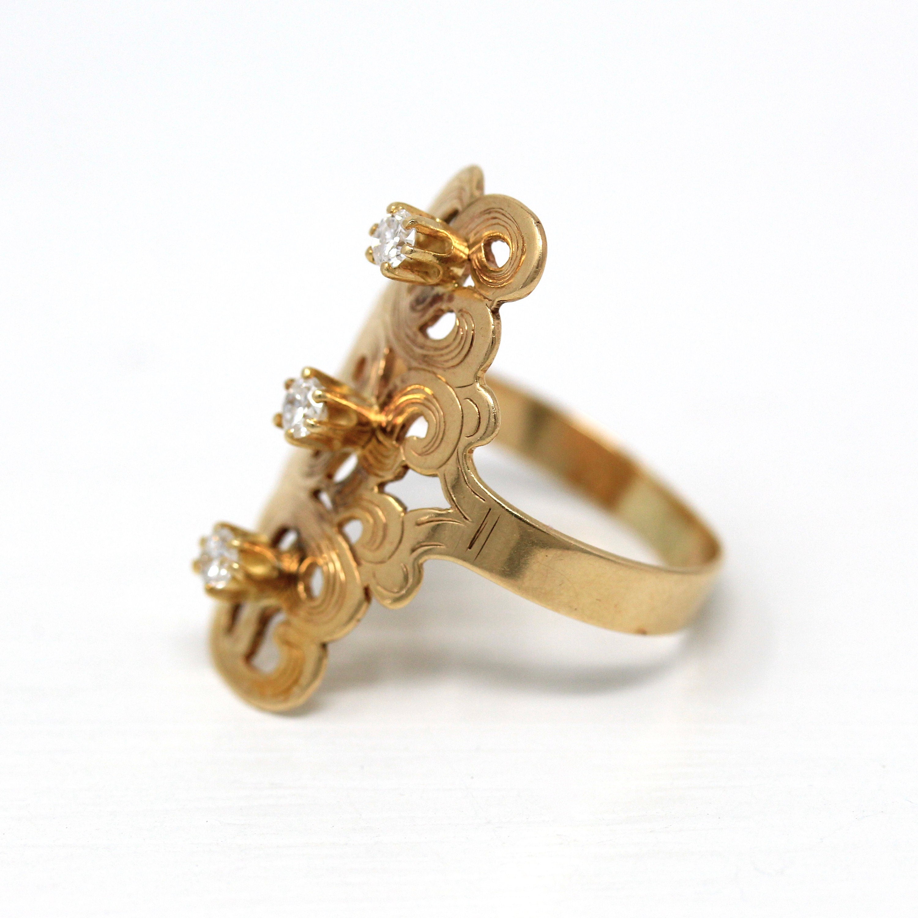 Three Stone Ring - Retro 18k Yellow Gold & Platinum Diamond Ring - Vintage Circa 1960s Era Size 6 1/4 Engagement Anniversary Fine Jewelry