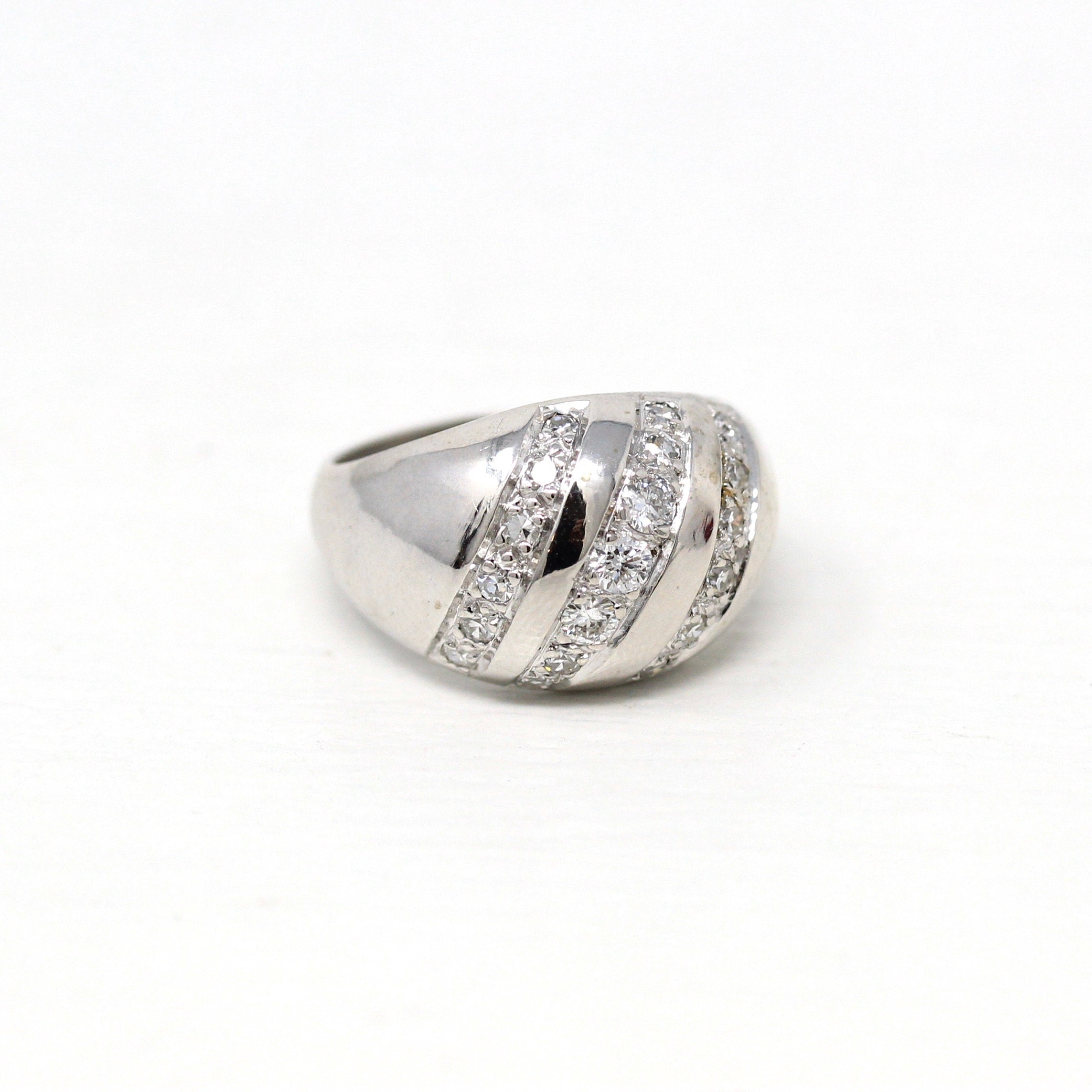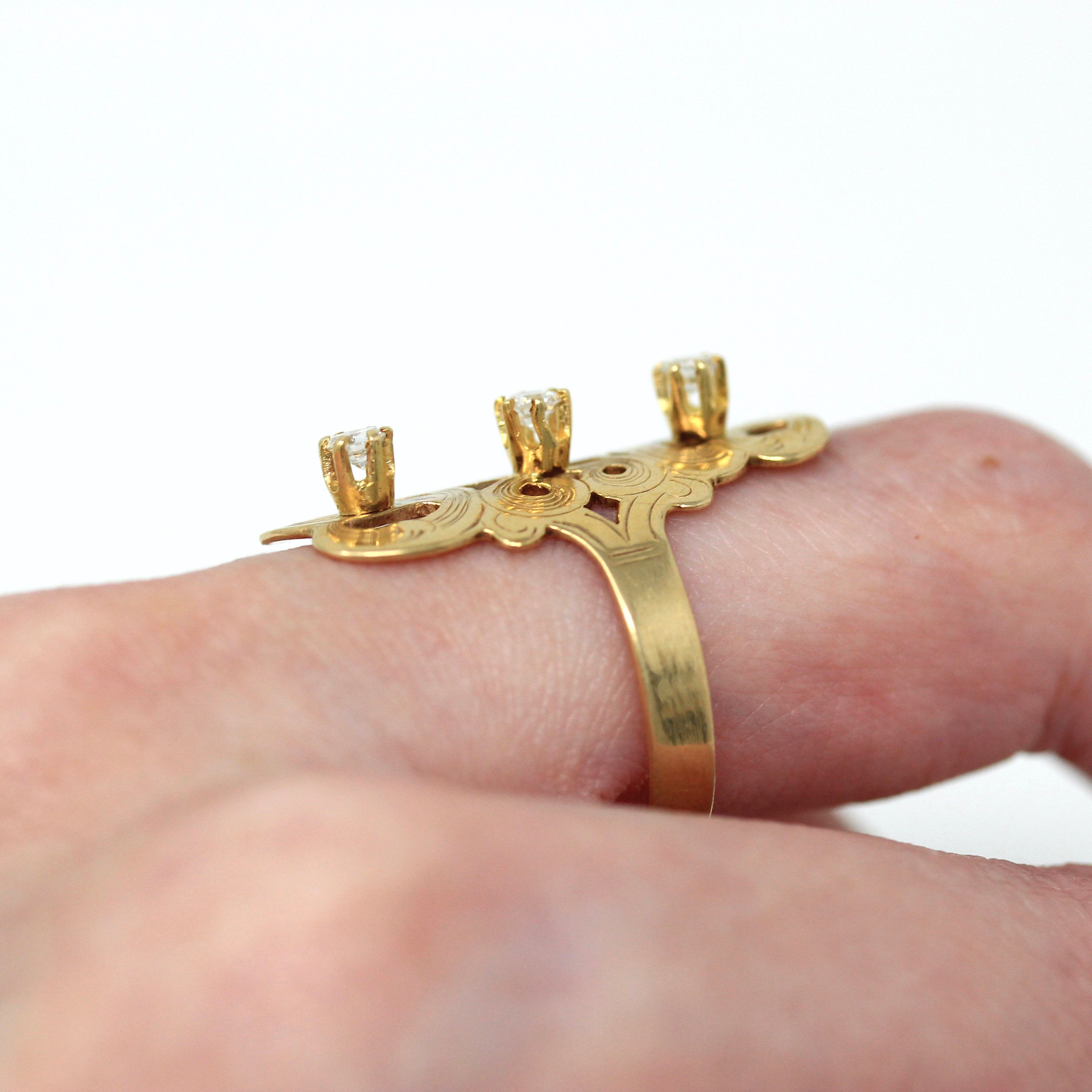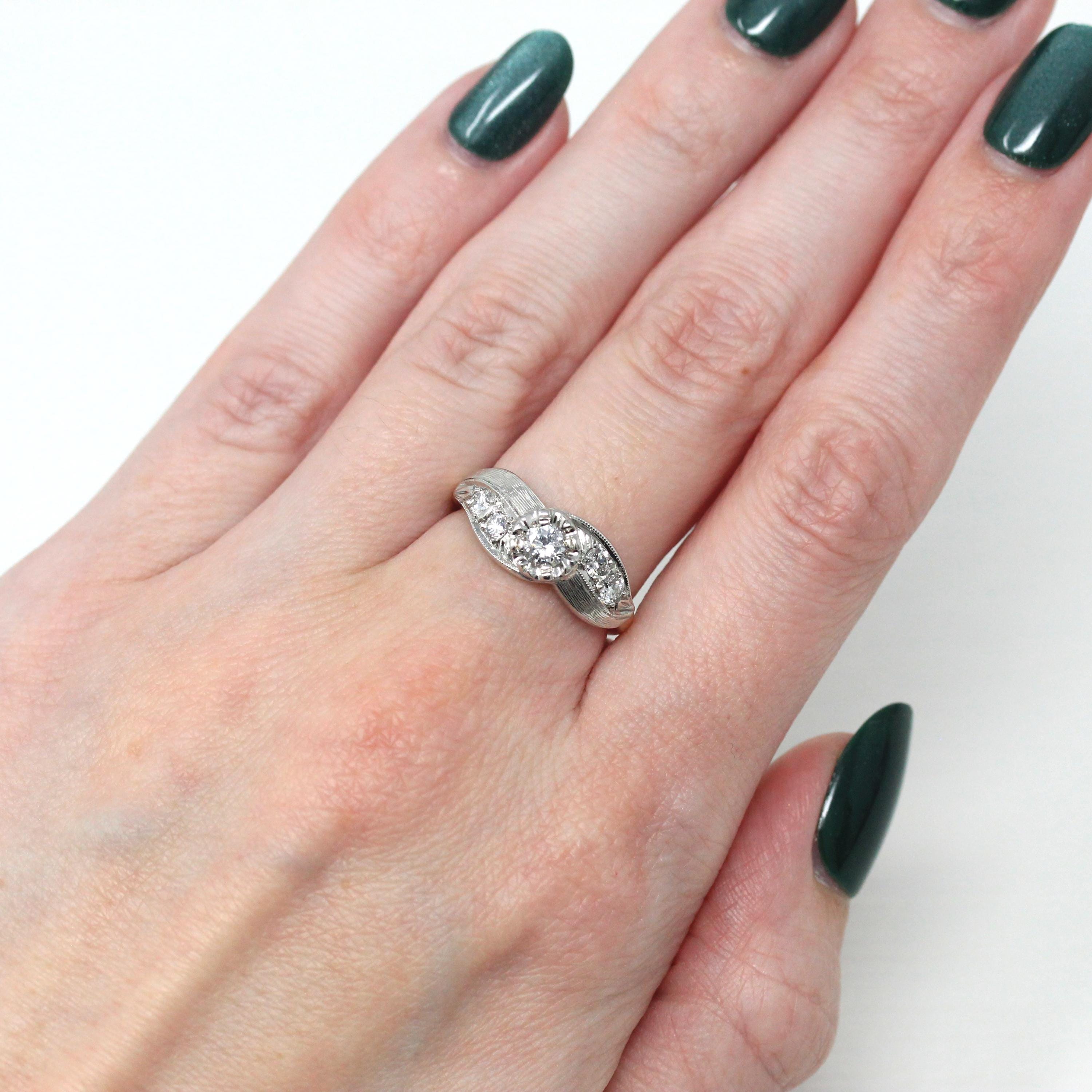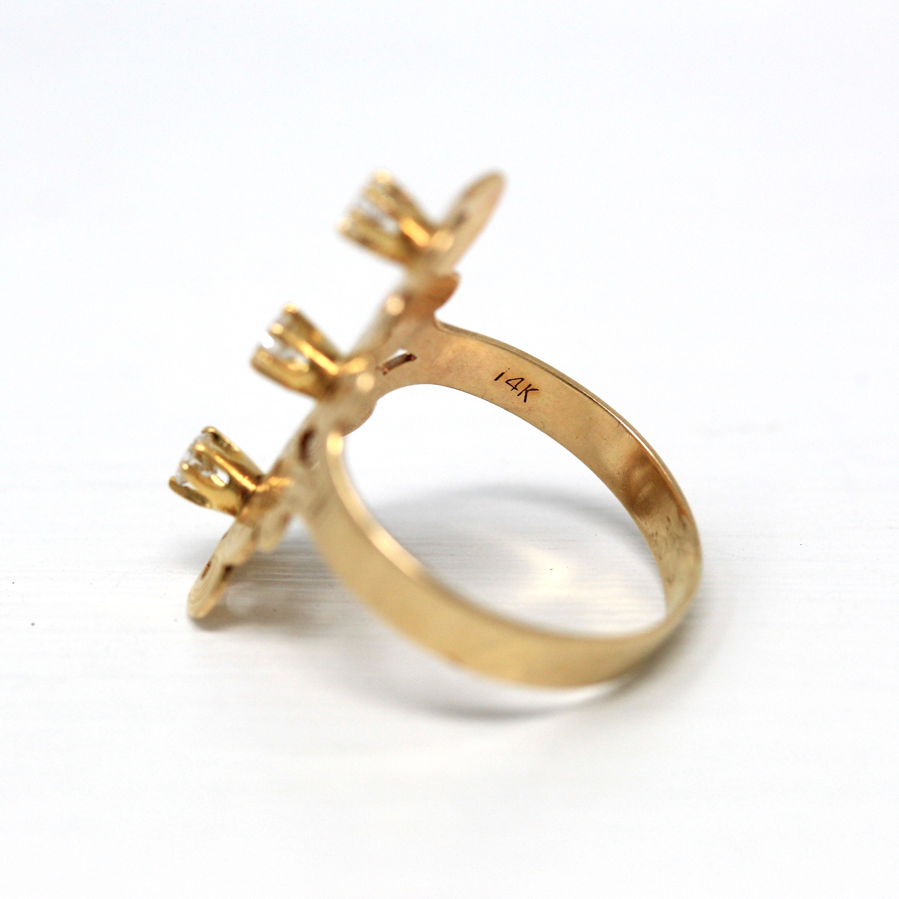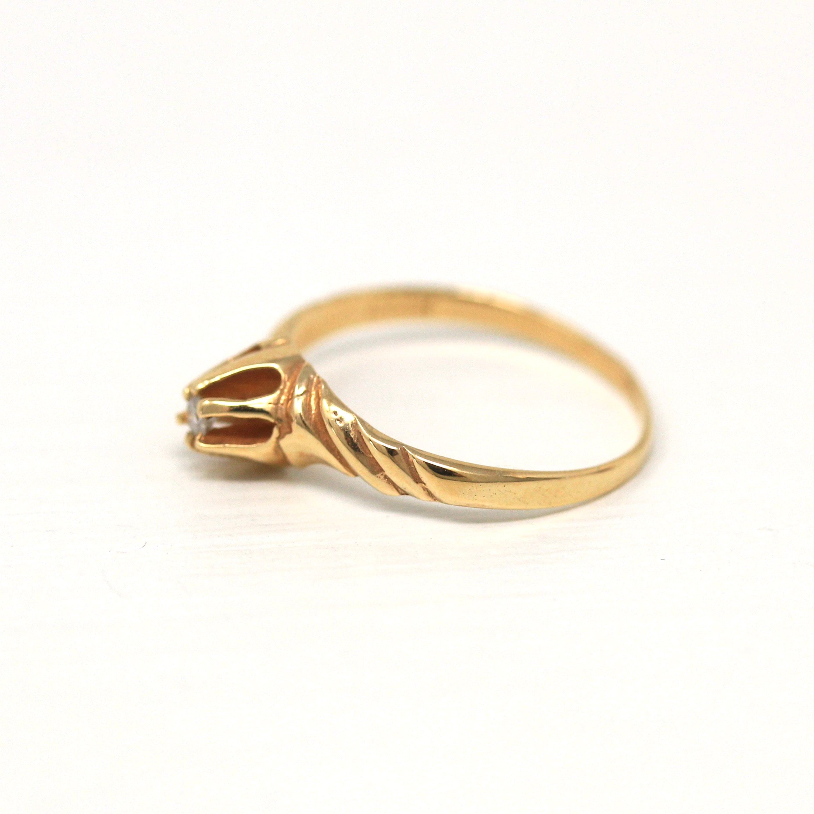 Three Stone Ring - Retro 18k Yellow Gold & Platinum Diamond Ring - Vintage Circa 1960s Era Size 6 1/4 Engagement Anniversary Fine Jewelry