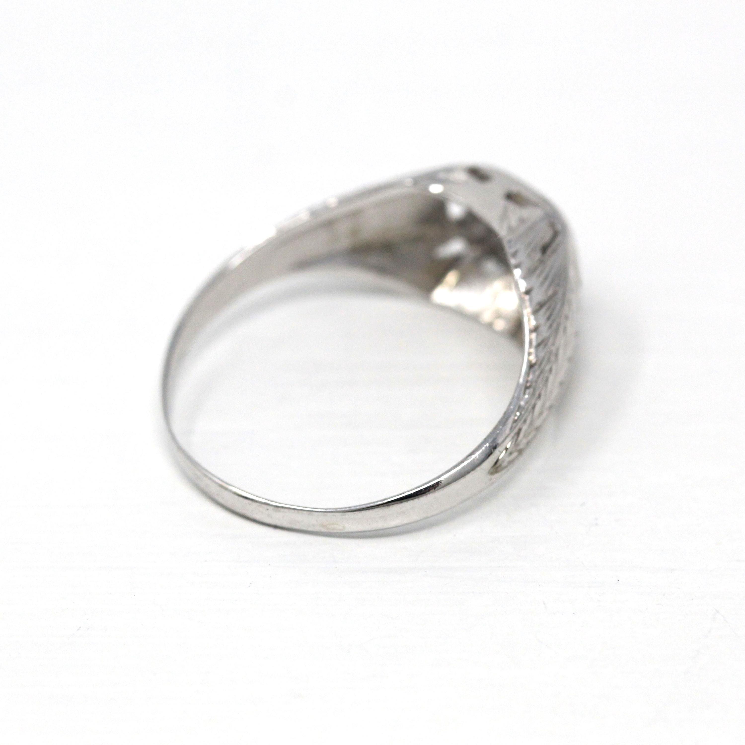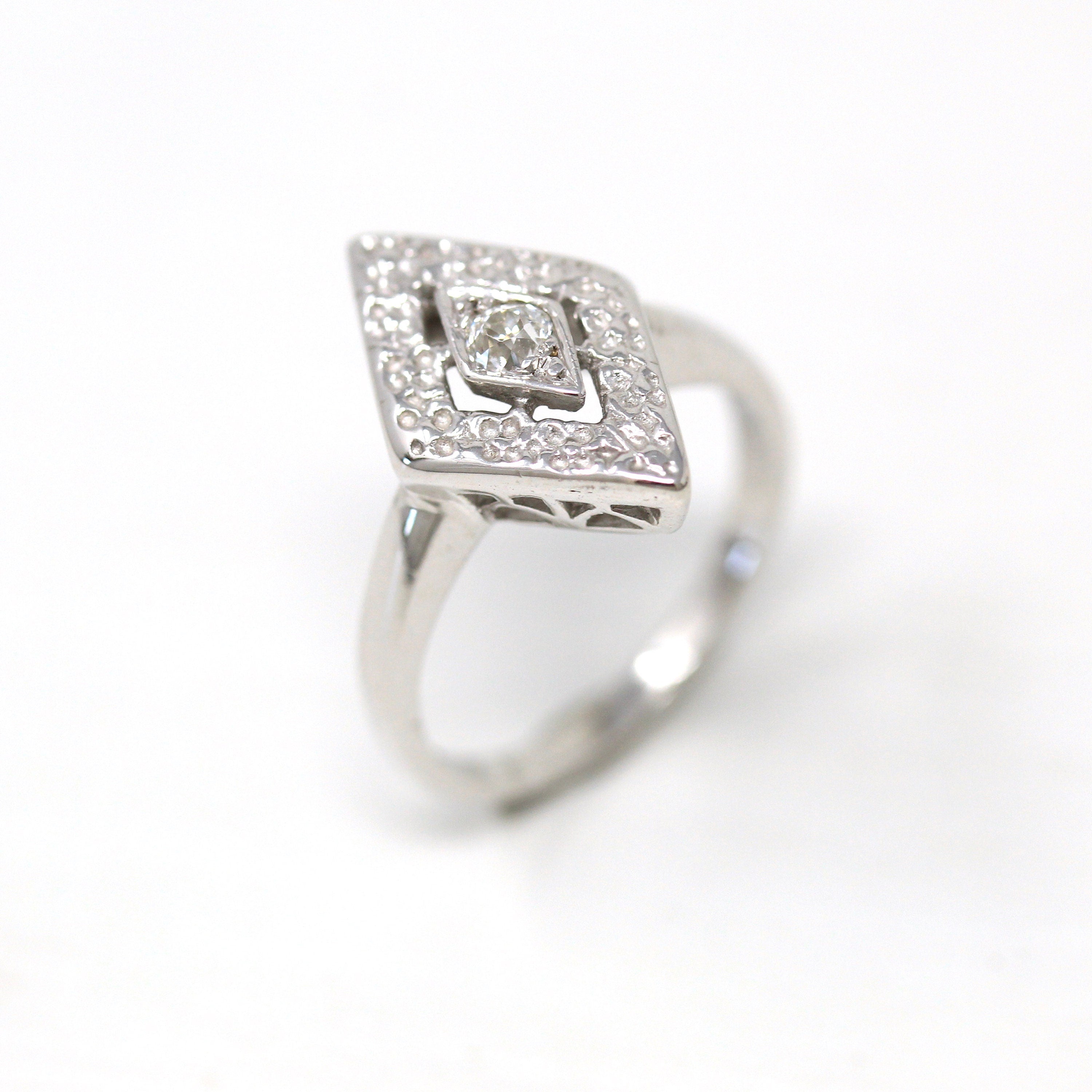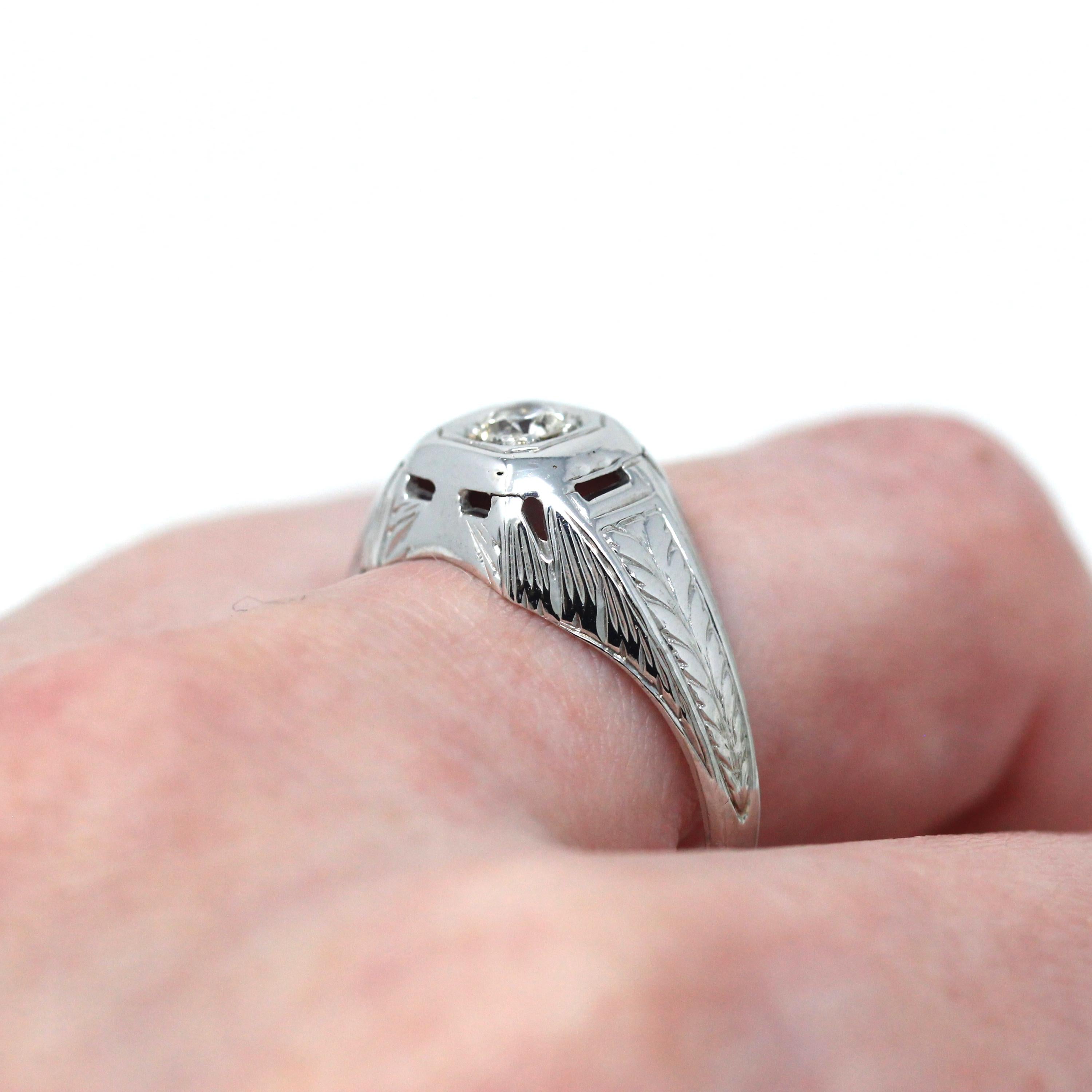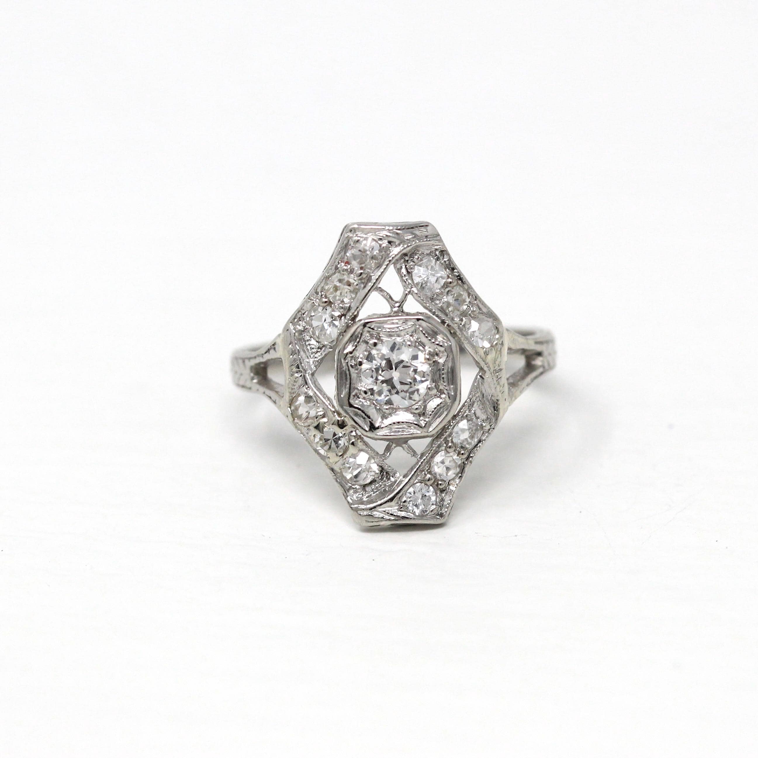 Venta - Broche Art Déco - Filigrana antigua de oro blanco de 14 k Genuino .02 CT Antiguo Pin de diamante europeo - Circa 1920s Era Joyería de accesorios de moda