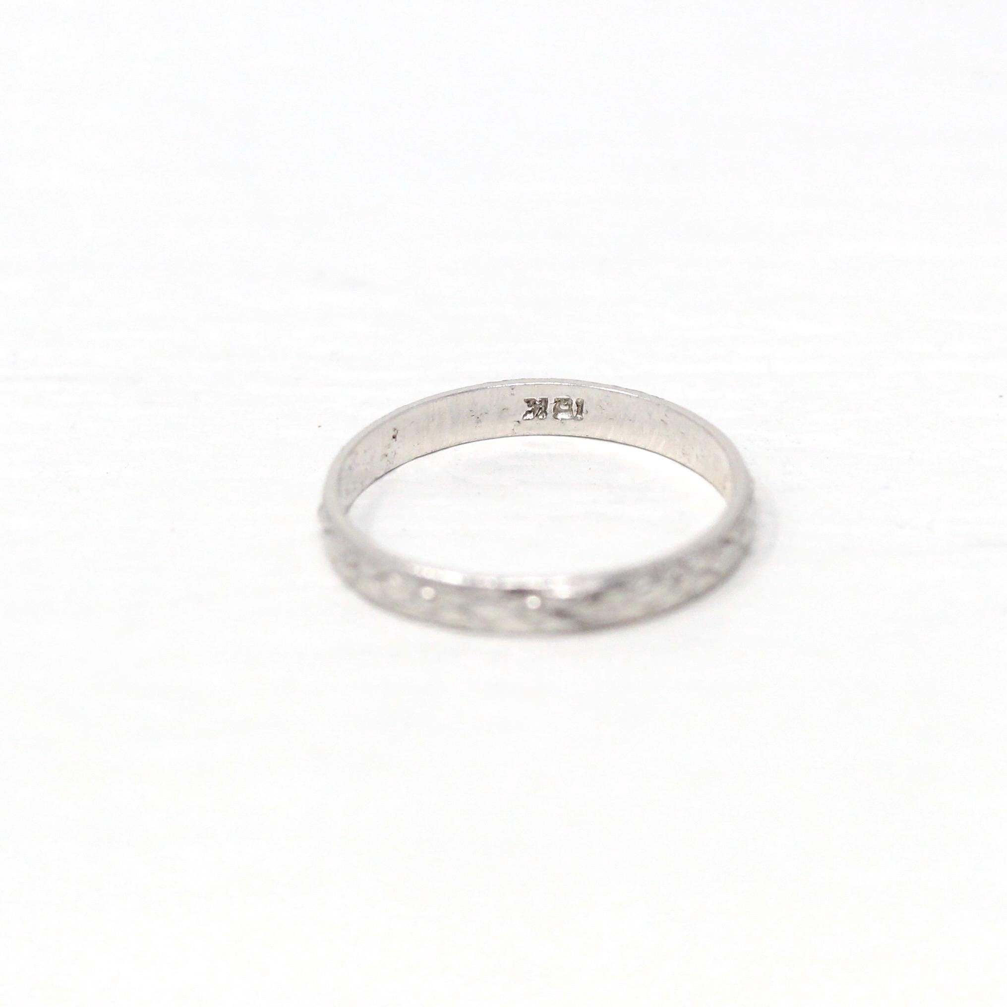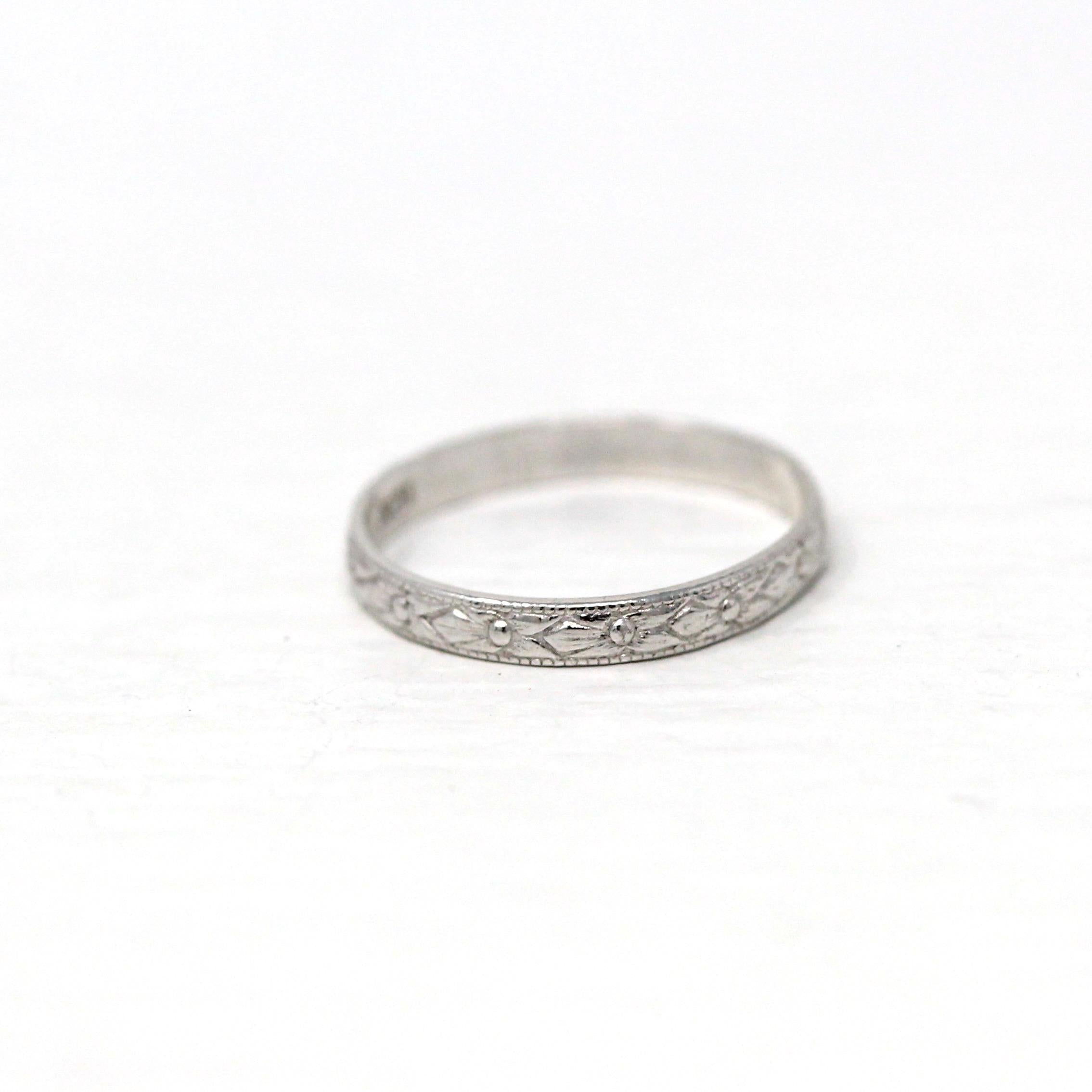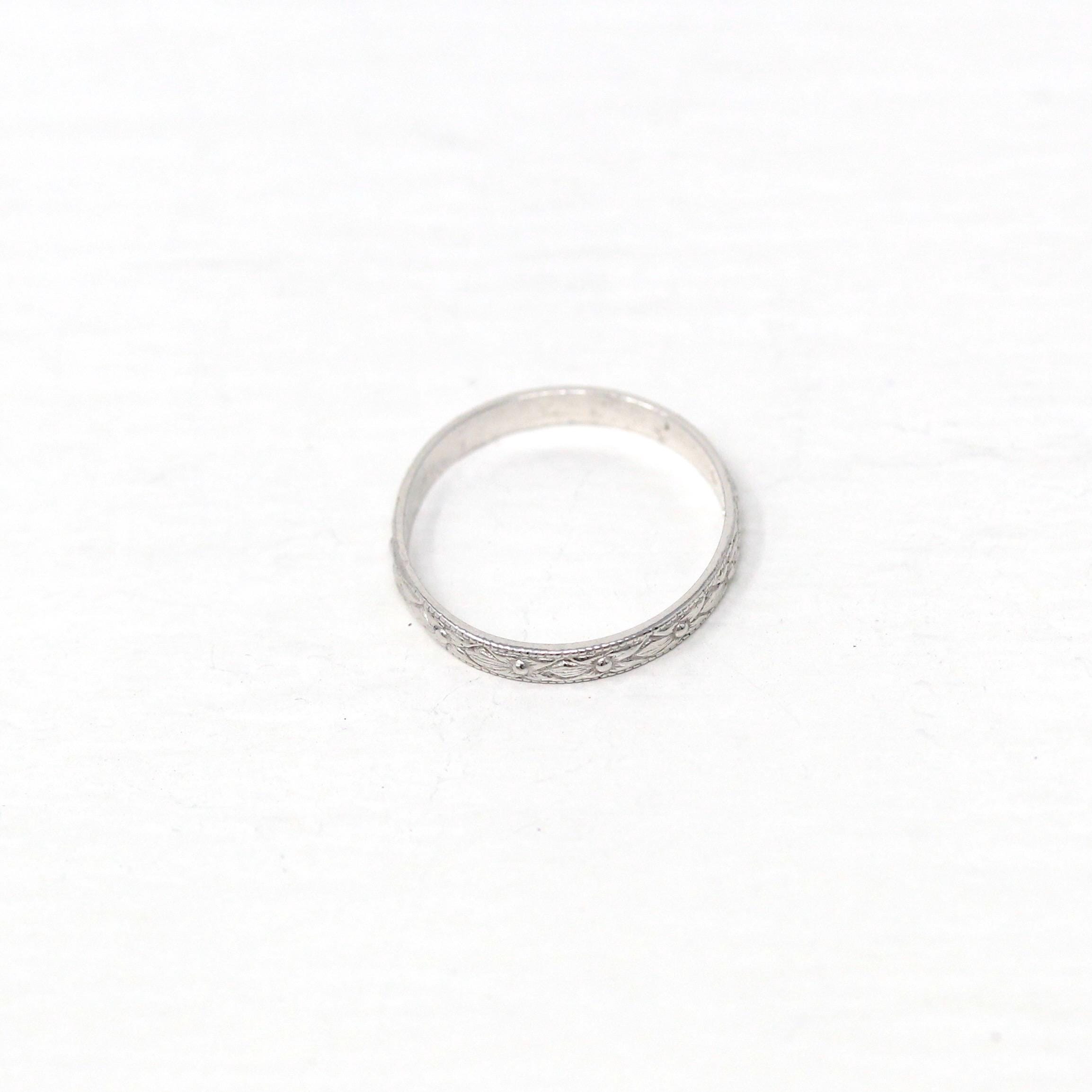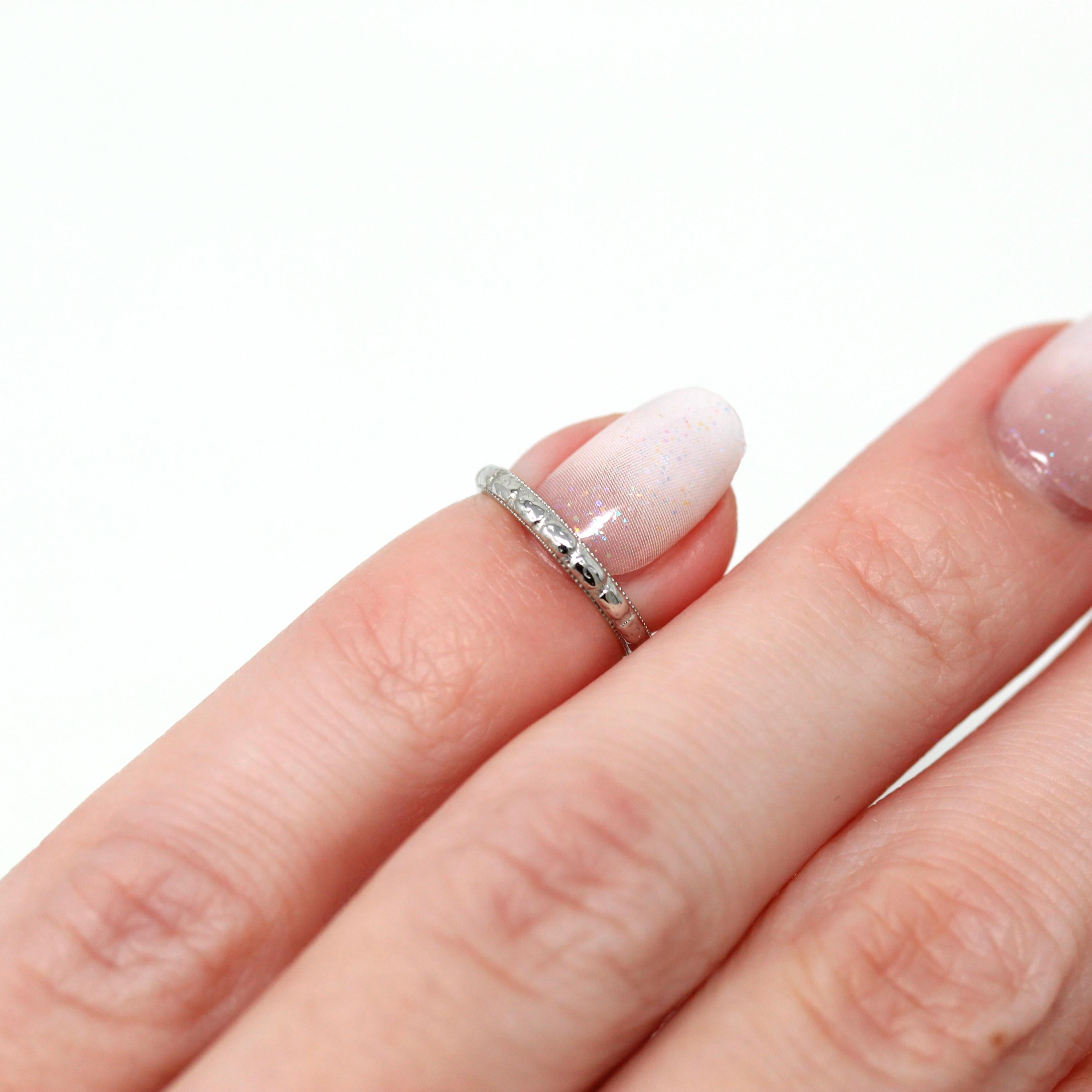 Vintage Baby Band - Art Deco 10k White Gold Orange Blossom Eternity Patterned Ring - Circa 1930s Era Size 1/2 Dainty Fine 30s Fine Jewelry