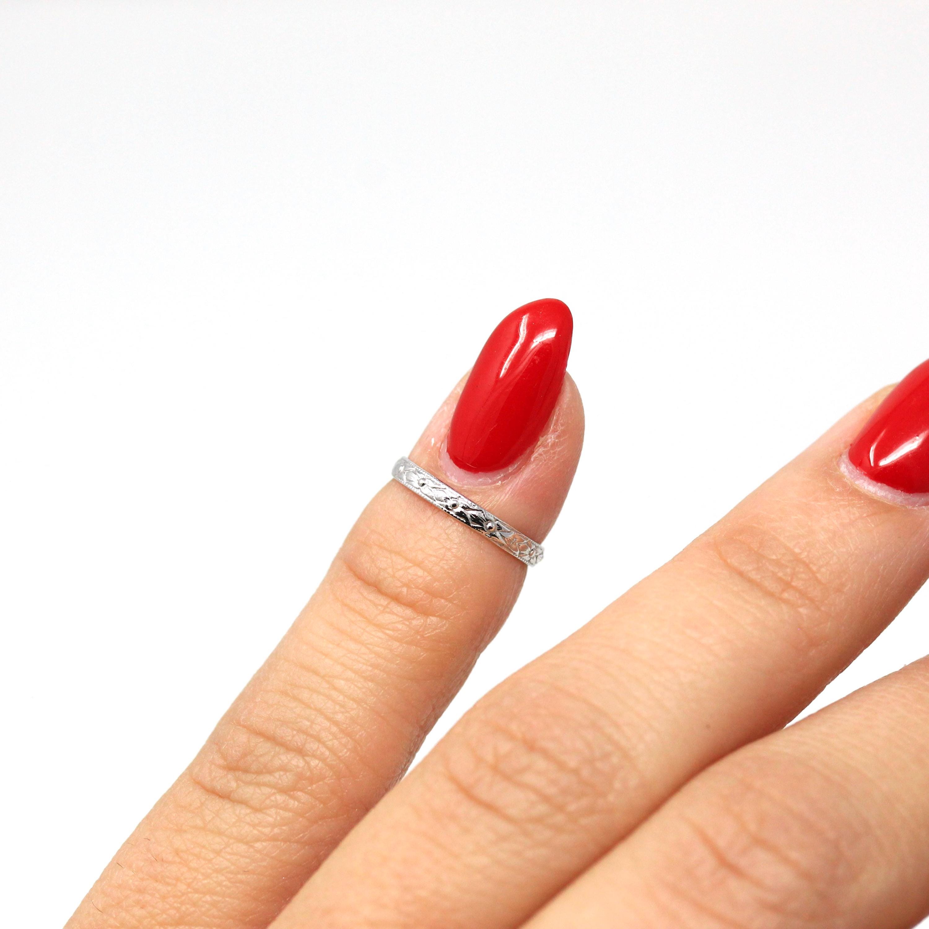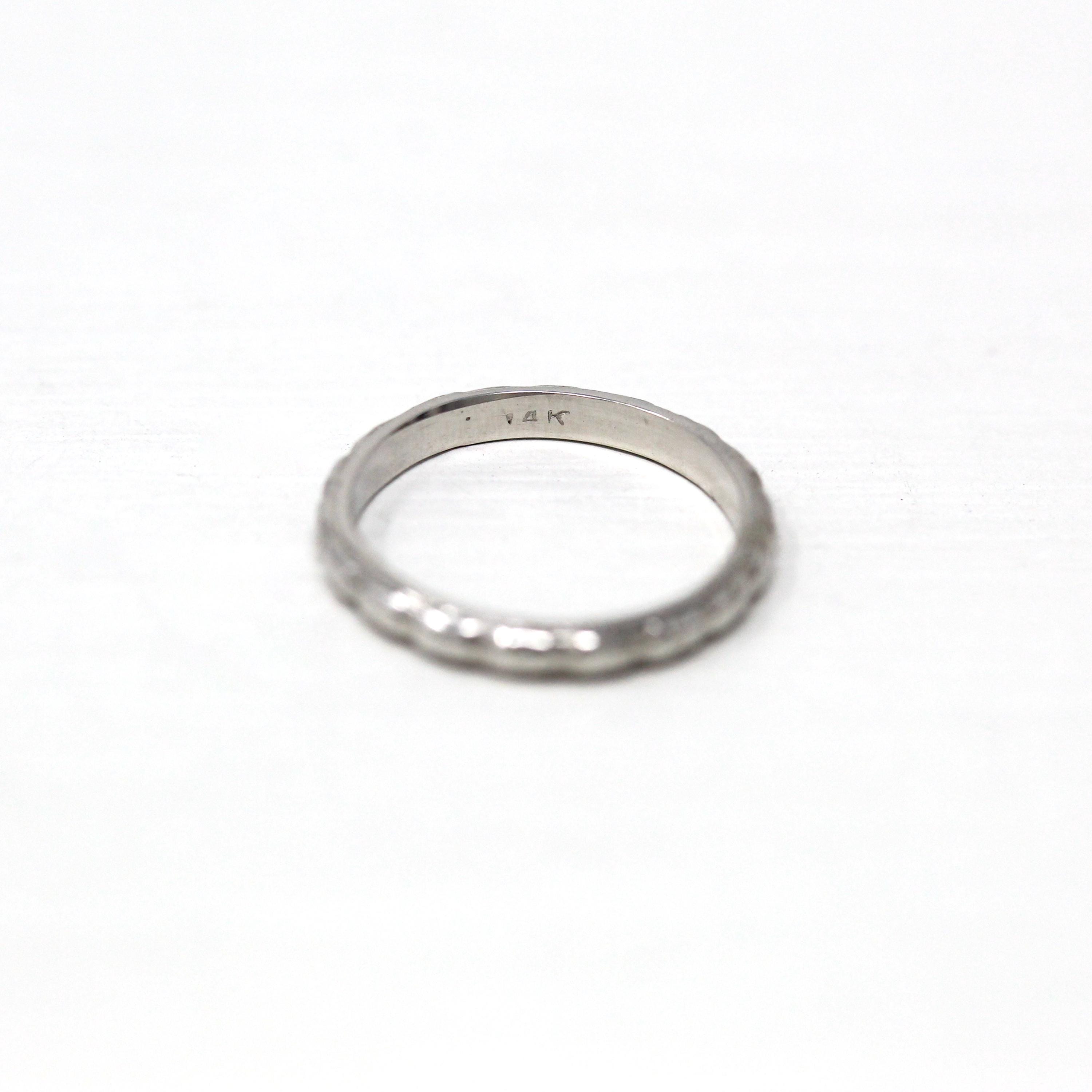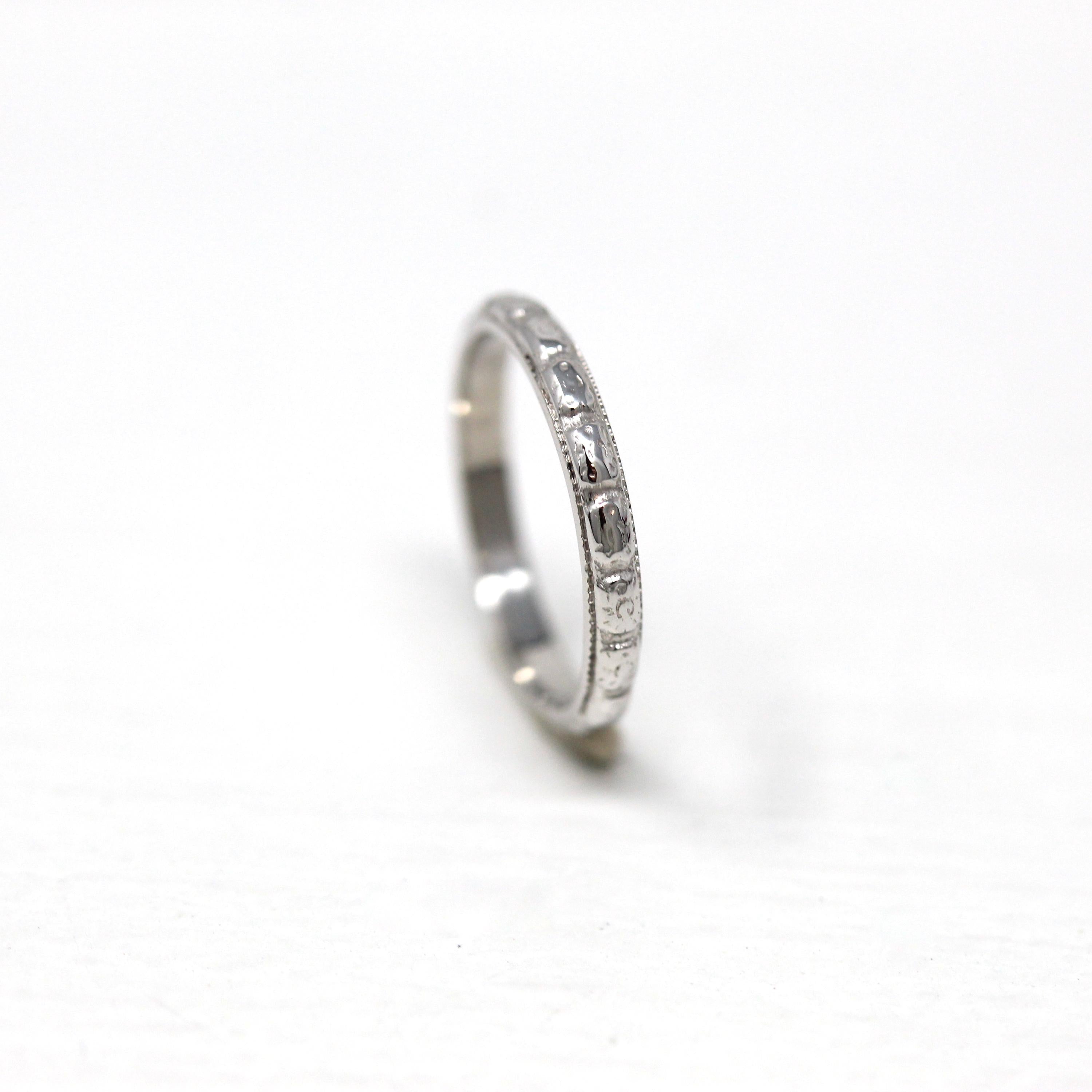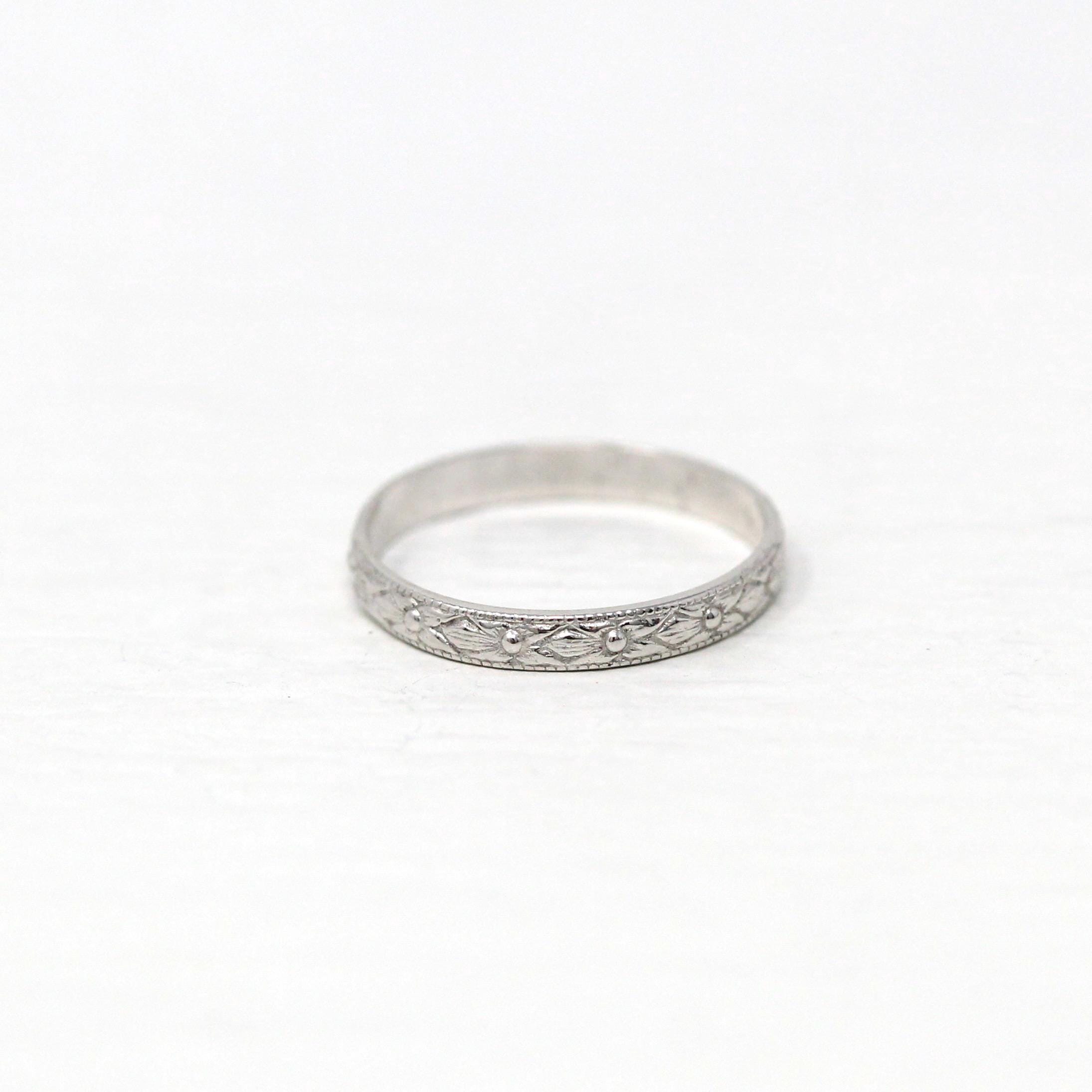 Vintage Baby Band - Art Deco 10k White Gold Orange Blossom Eternity Patterned Ring - Circa 1930s Era Size 1/2 Dainty Fine 30s Fine Jewelry