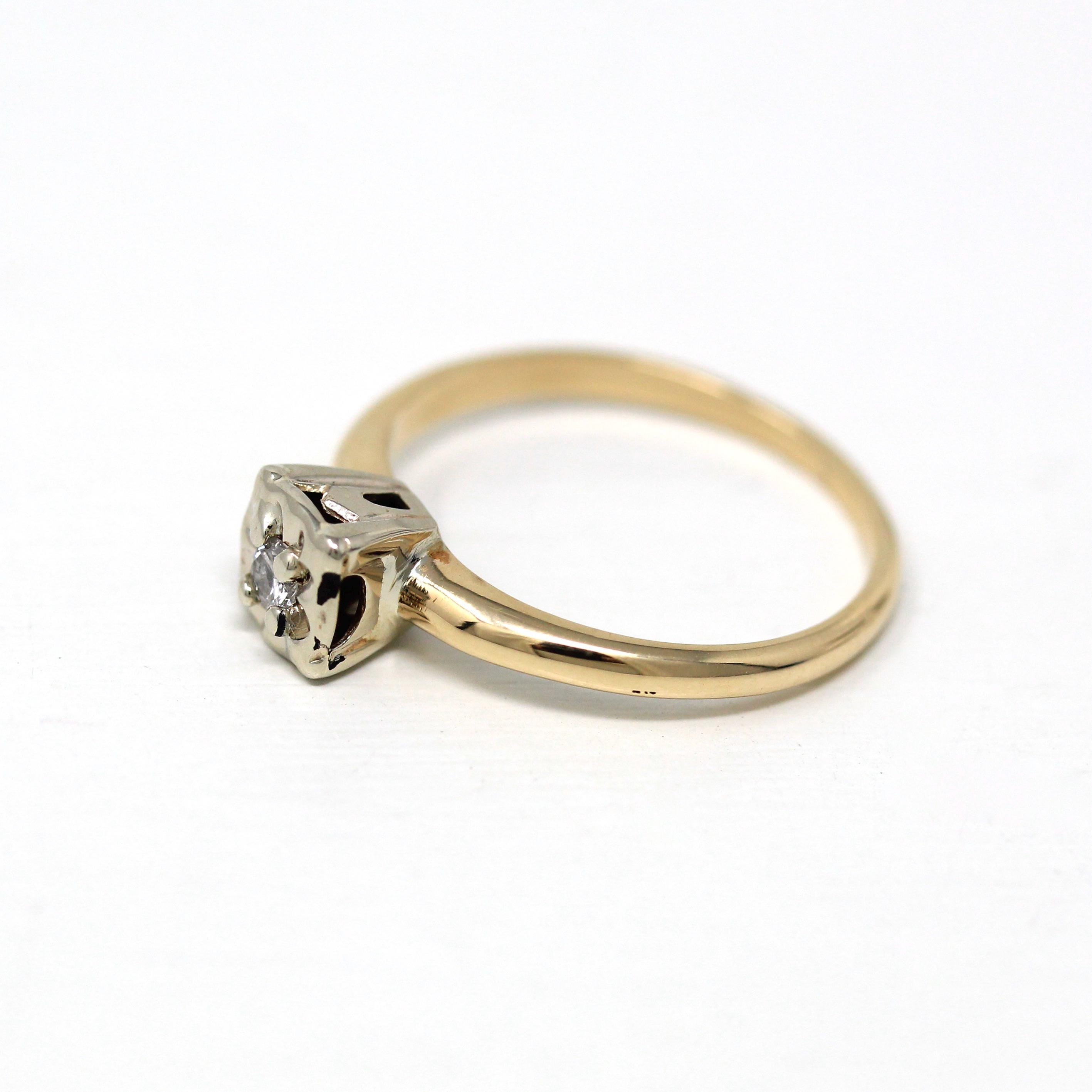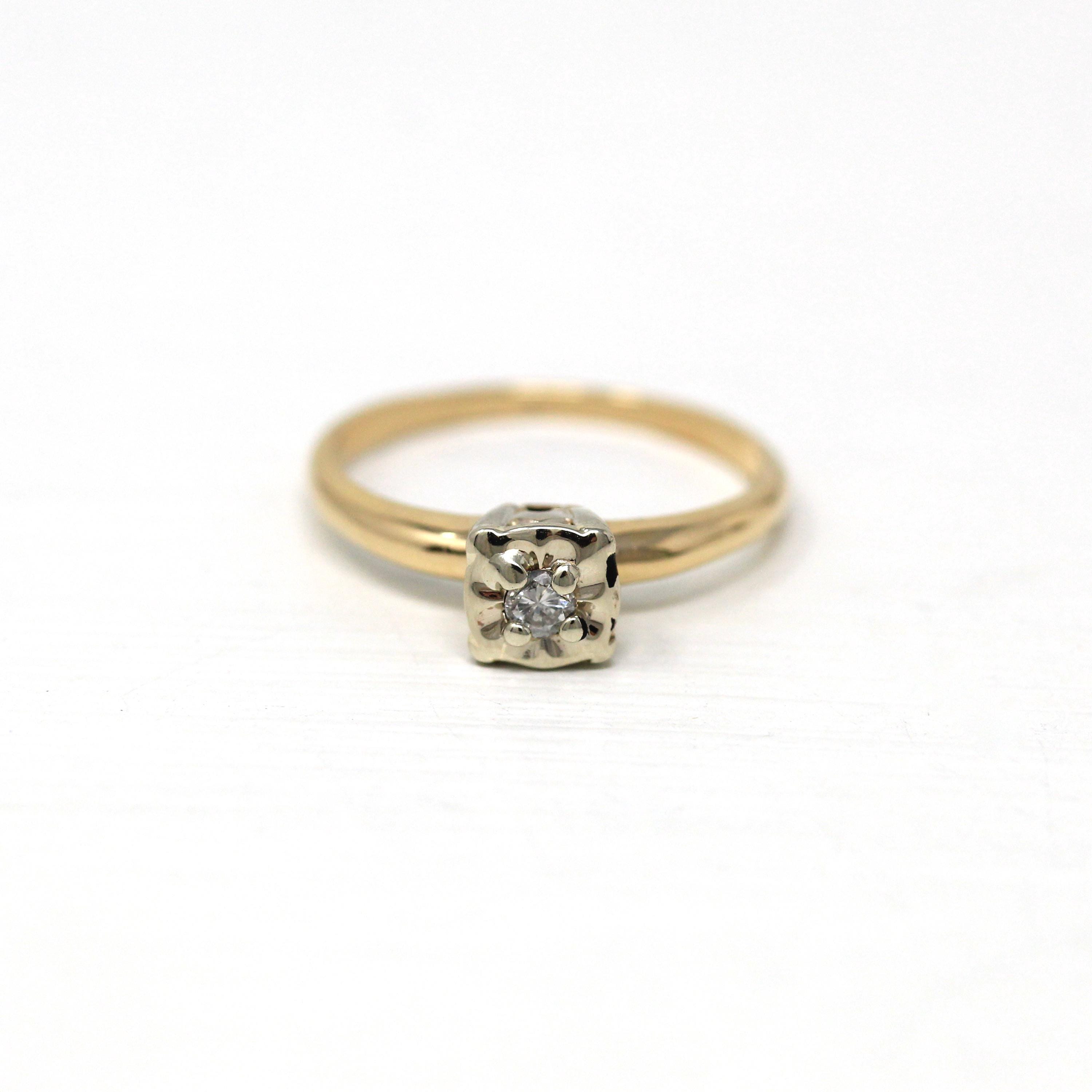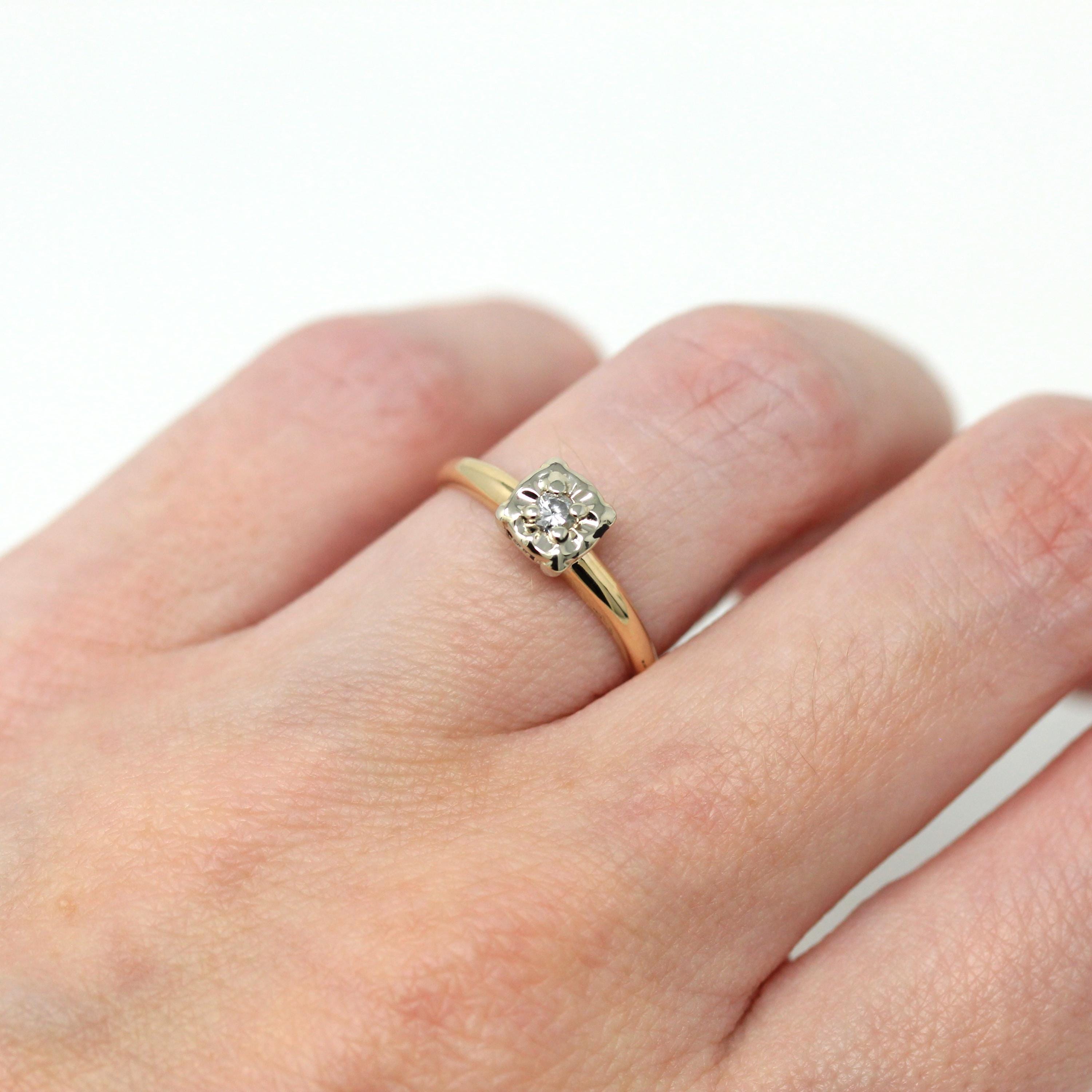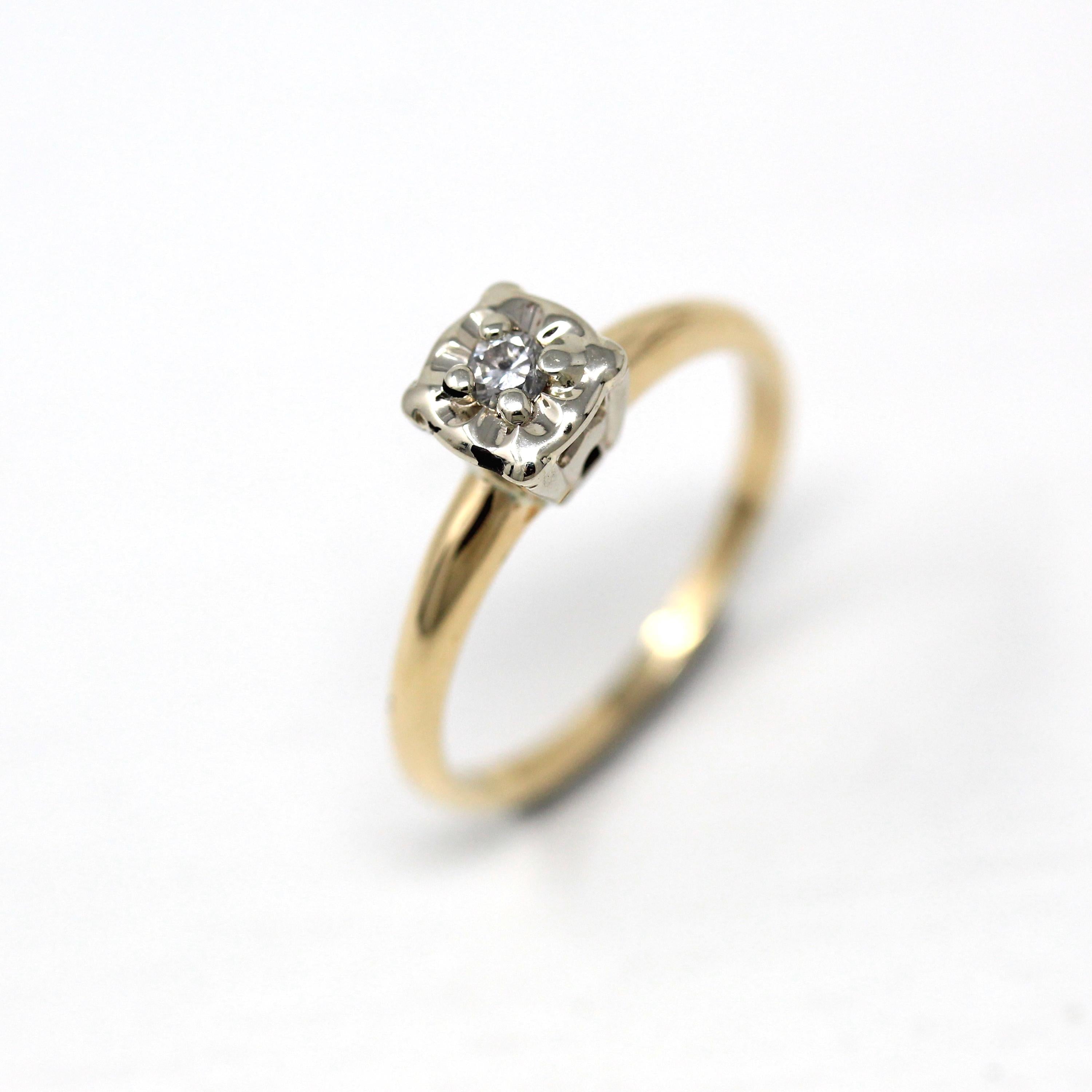Vintage Diamond Ring - 14k Yellow & White Gold Round .17 CT Solitaire Engagement - Size 8 Retro Era 1990s Illusion Head Fine Wheat Jewelry
