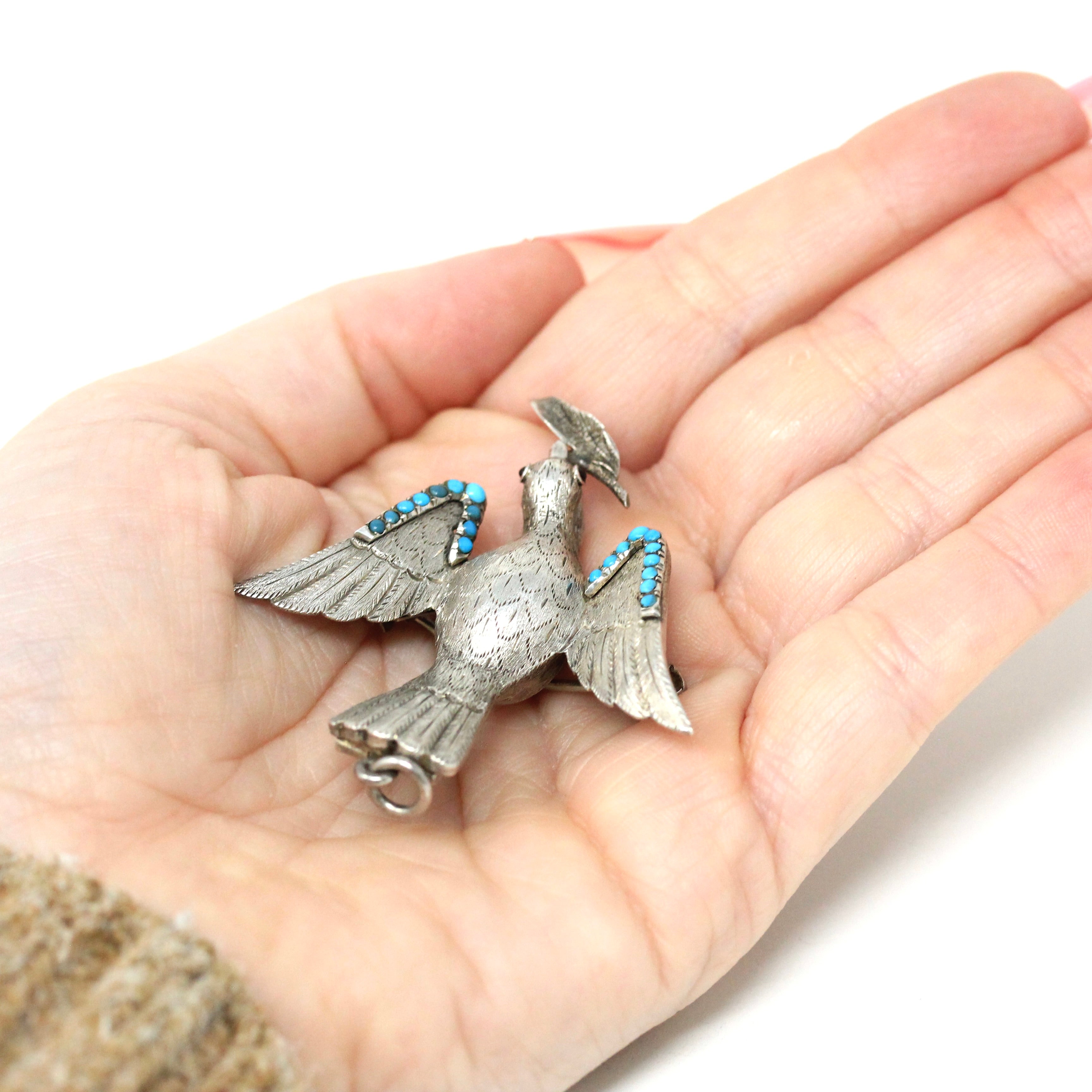 Silver Bird Brooch - Retro Era Handmade Silver & Turquoise Gemstones Avian Pendant - Vintage Circa 1940s Perfume Compartment Fine Jewelry