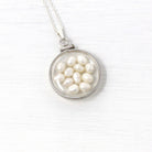 ¡Relicario agitador de perlas barrocas de plata de ley hecho a mano inspirado en sirenas! Este llamativo colgante tiene el tamaño de una moneda de níquel y tiene biseles estilo moneda y cubiertas de lucita transparente. El dije redondo se muestra modelado sobre una nueva cadena de plata esterlina y está relleno con 12 perlas barrocas. ¡Una pieza de joyería nueva de estilo acuático que presenta la piedra natal de junio!