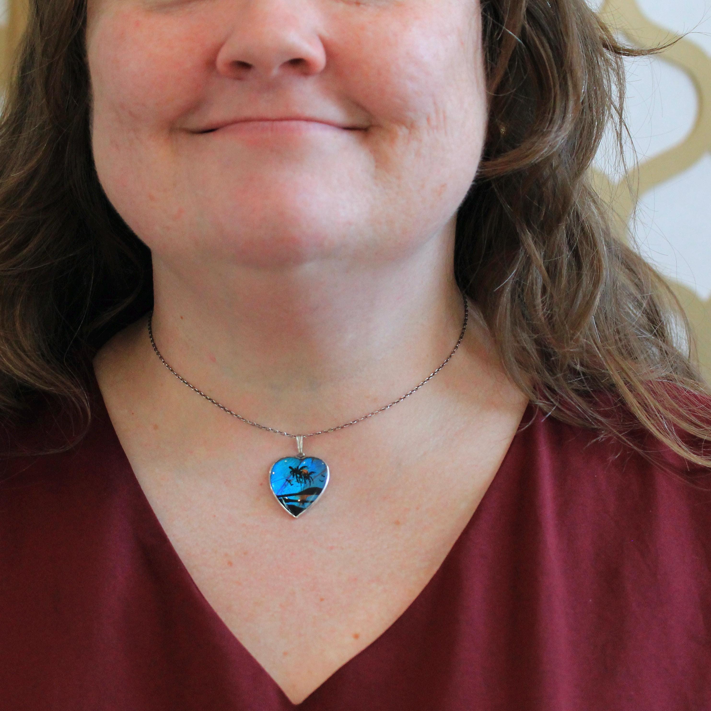 Morpho Butterfly Pendant - Art Deco Sterling Silver Blue Wing Heart Necklace - Vintage Circa 1930s Era Palm Tree Beach Sunset Insect Jewelry
