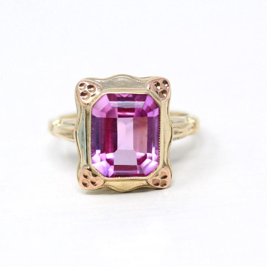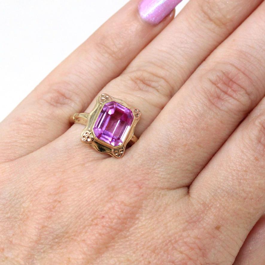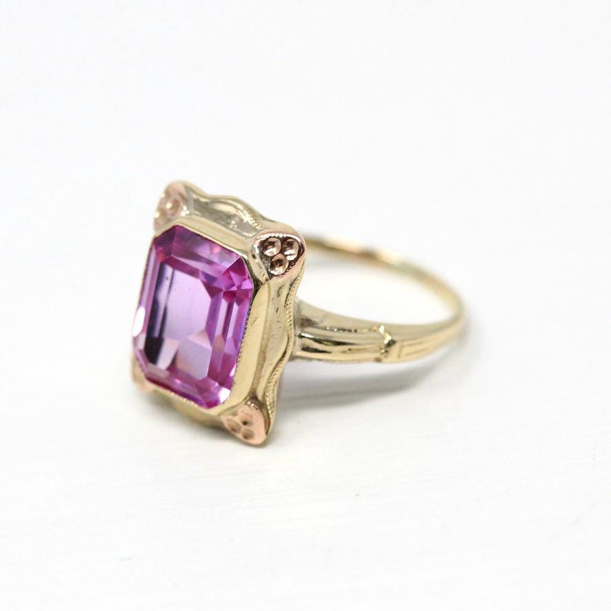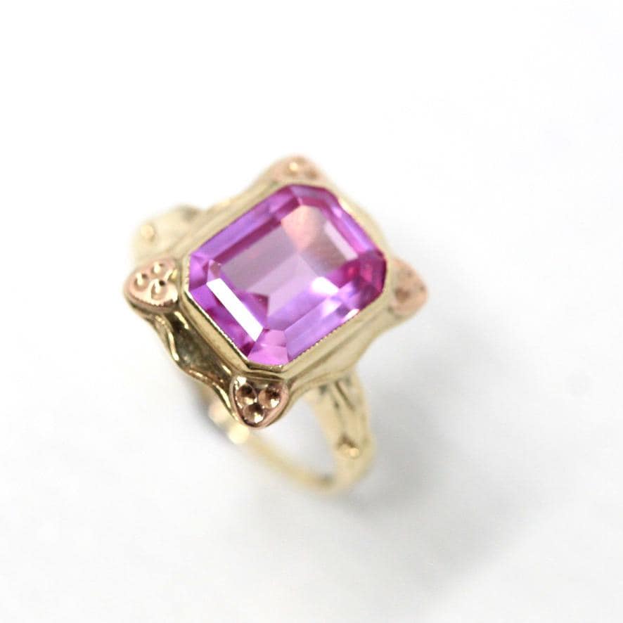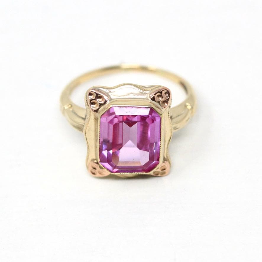 Simulated Pink Sapphire Necklace - Retro Era 10k Yellow & Rose Gold Glass Pendant - Vintage Circa 1940s September Birthstone Fine Jewelry
