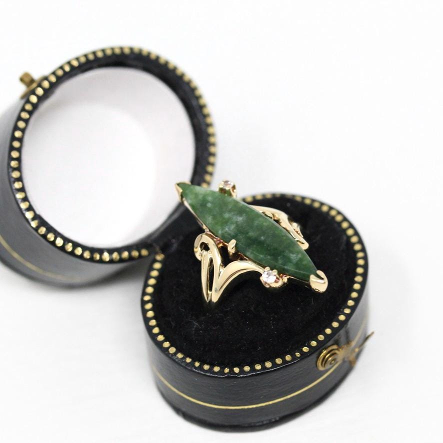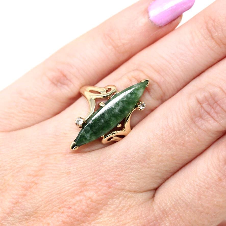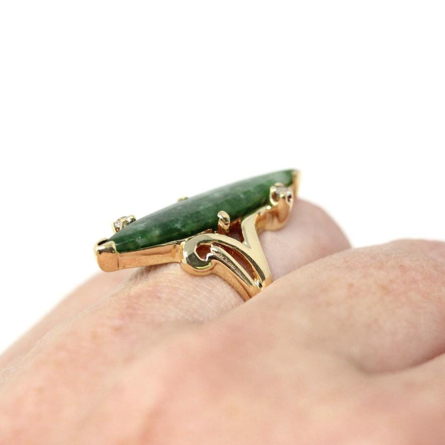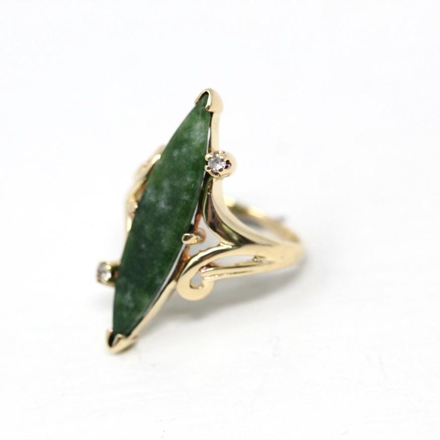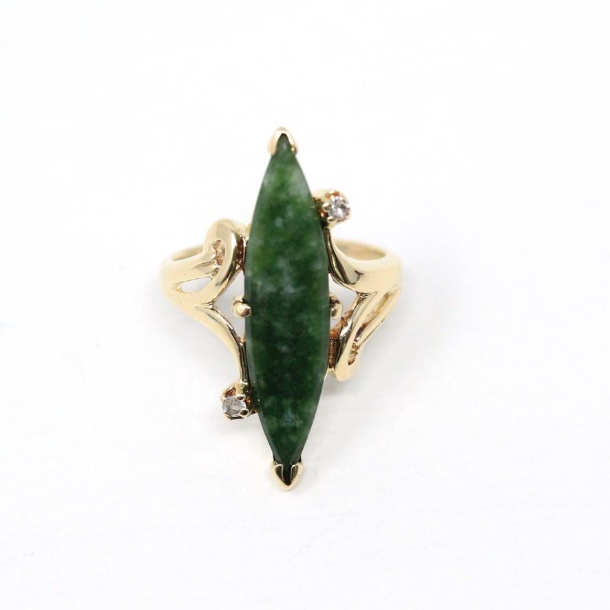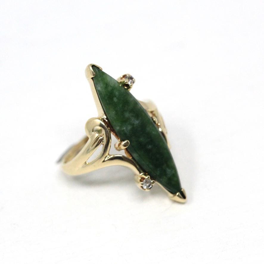 Nephrite Jade Ring - Retro 10k Yellow Gold Marquise Cut Natural Green Gemstone - Vintage 1960s Era Size 5 Navette Statement Fine 60s Jewelry