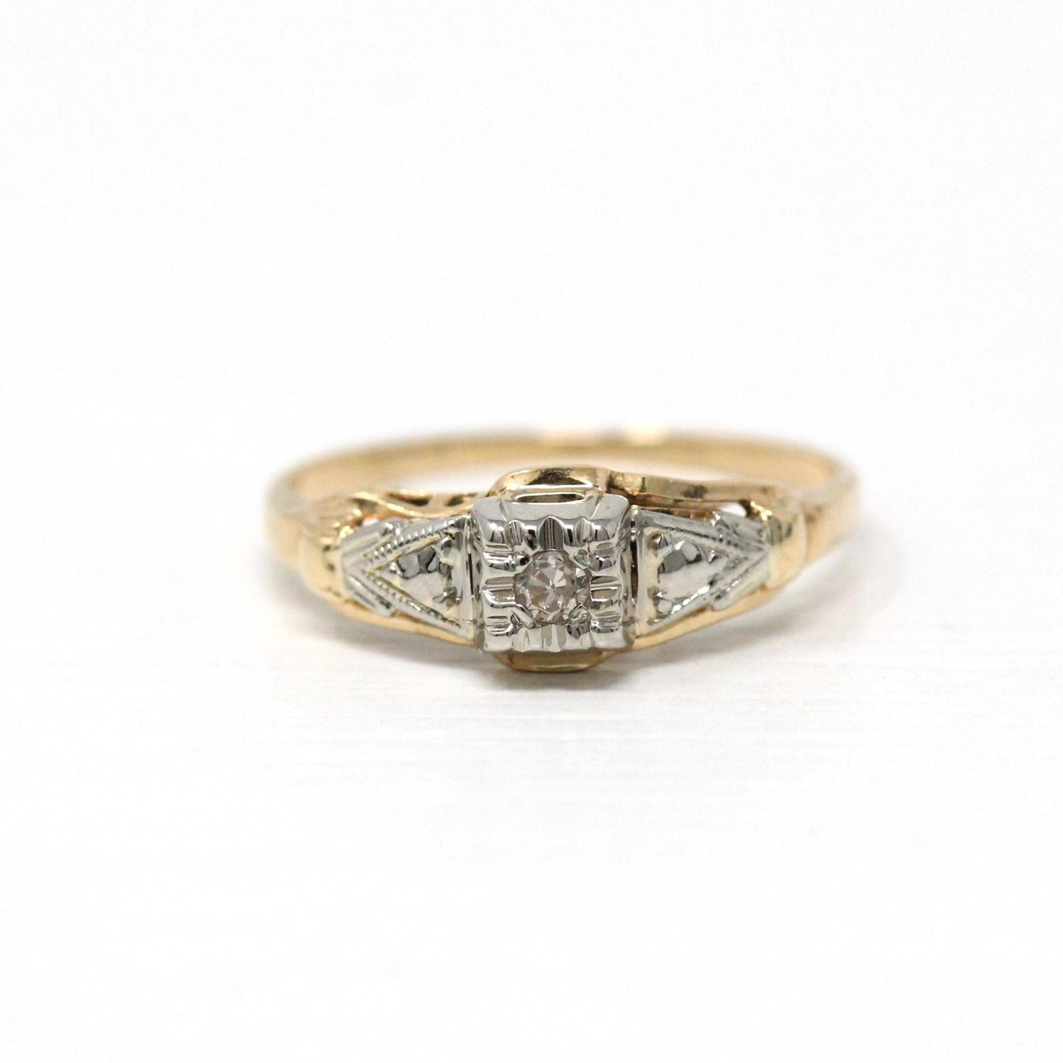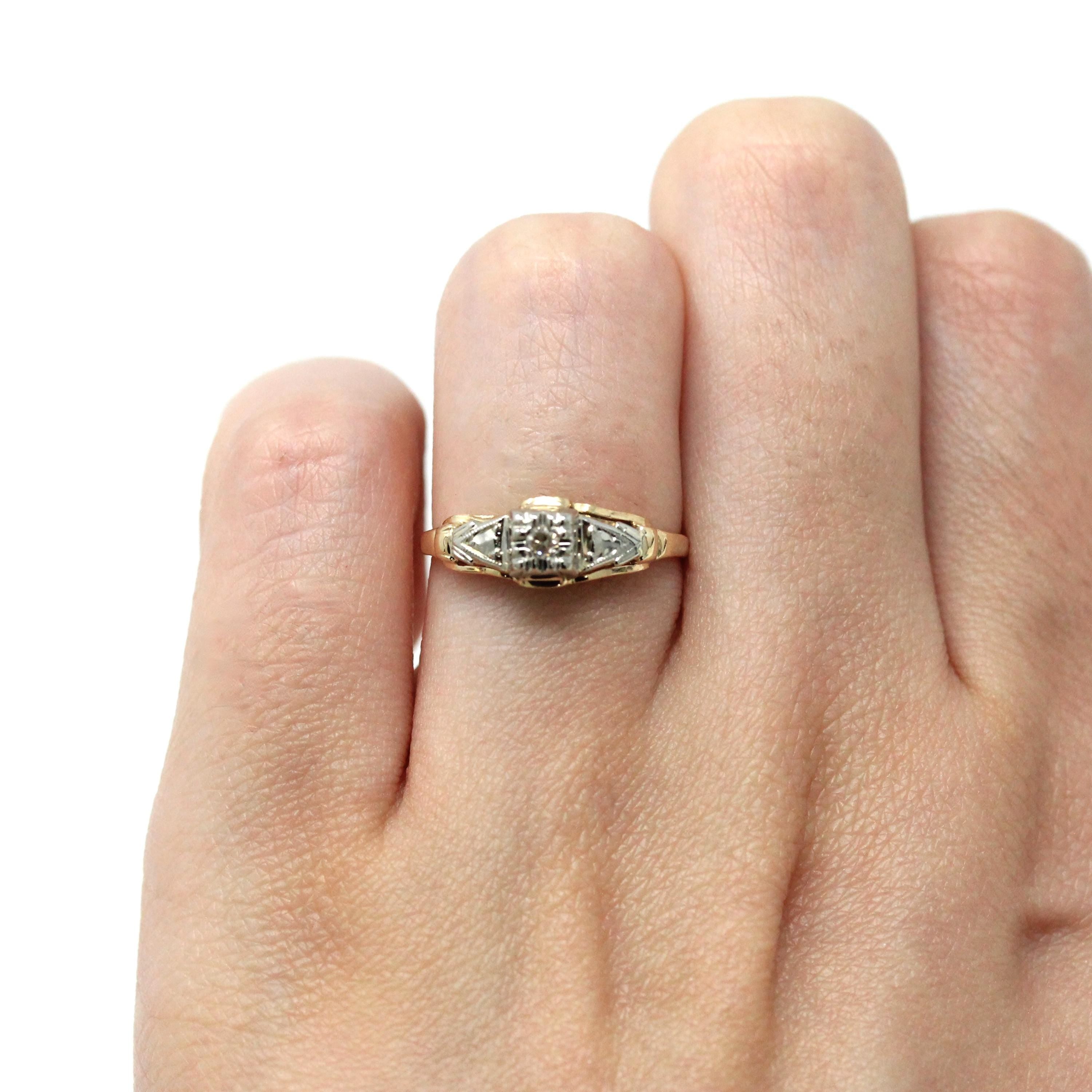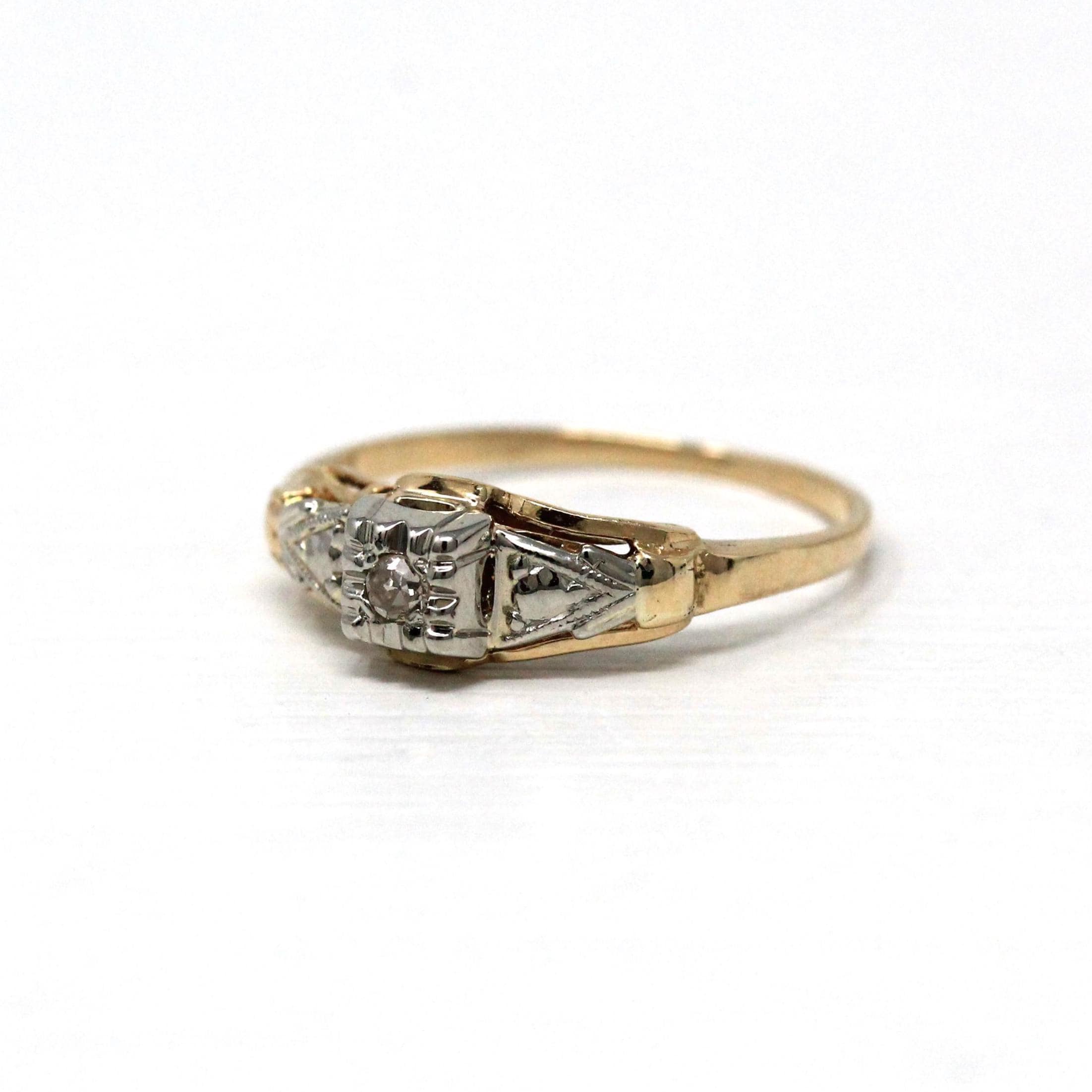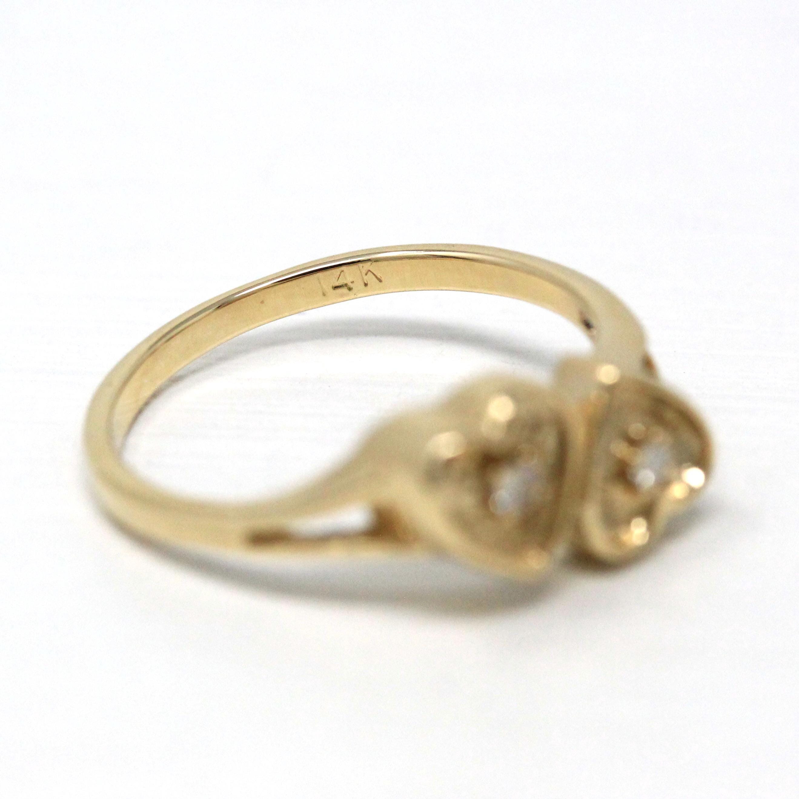 Diamond Pinky Ring - Retro 14k Yellow & White Gold Midi Baby Band Round Clear Gem - Vintage 1970s Era Size 1 3/4 April Birthstone Jewelry