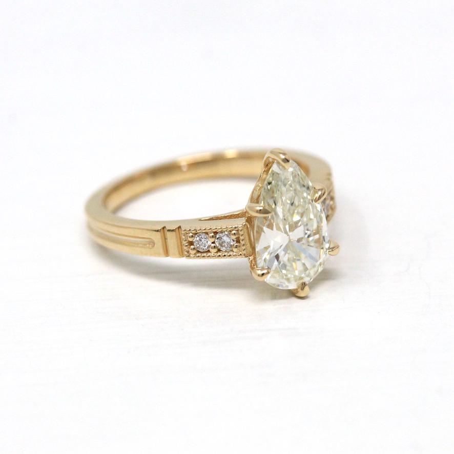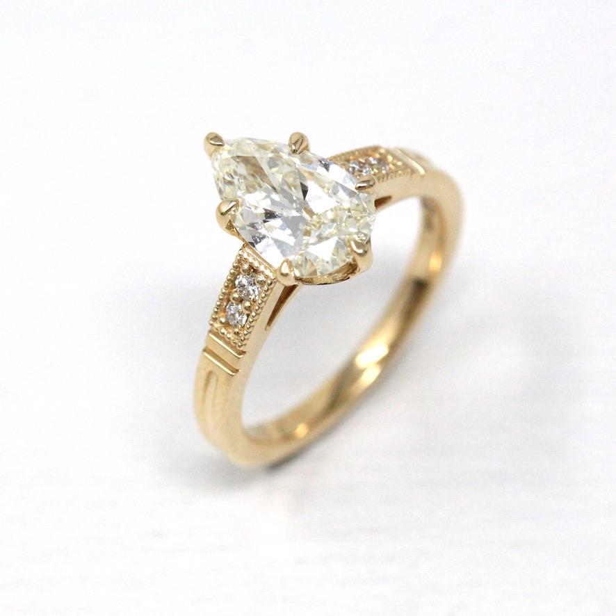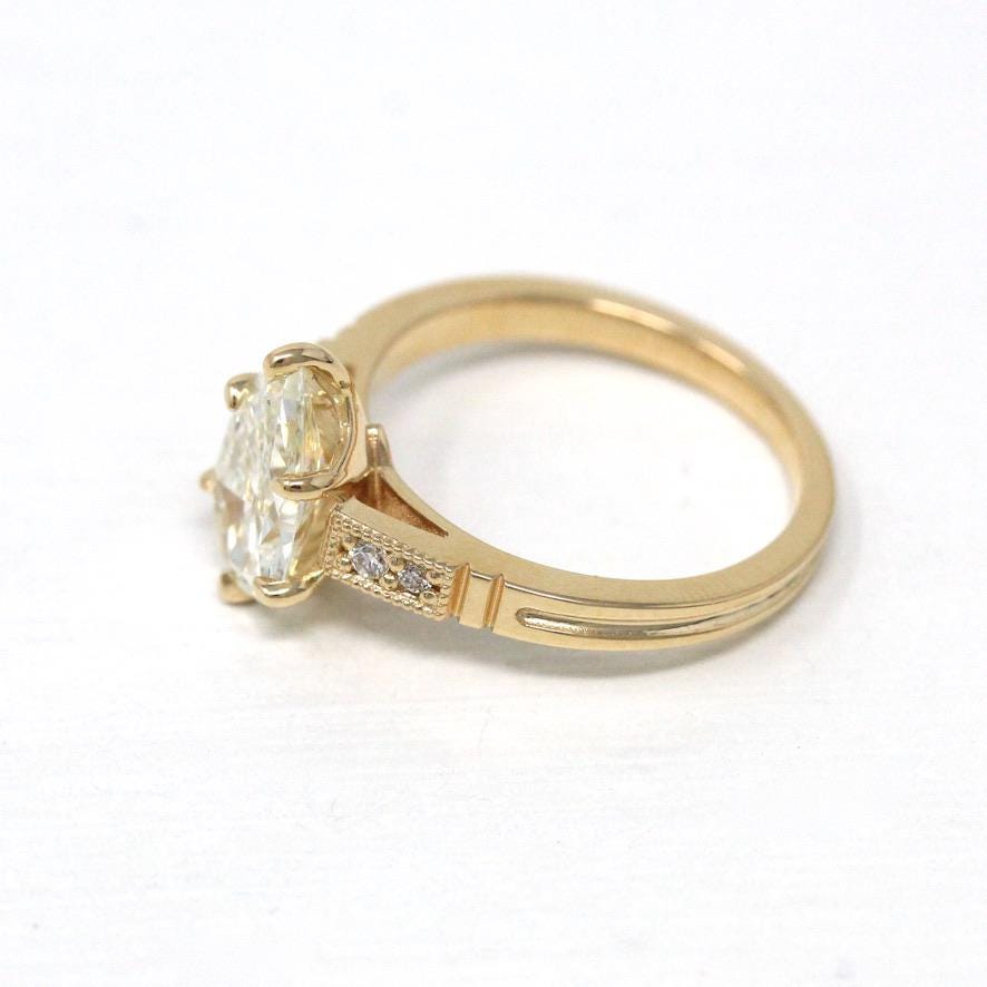 Marquise Halo Ring - Modern 14k Yellow Gold Created Sapphire Natural Diamond Gemstones - Estate Circa 1990s Size 6 Engagement Fine Jewelry