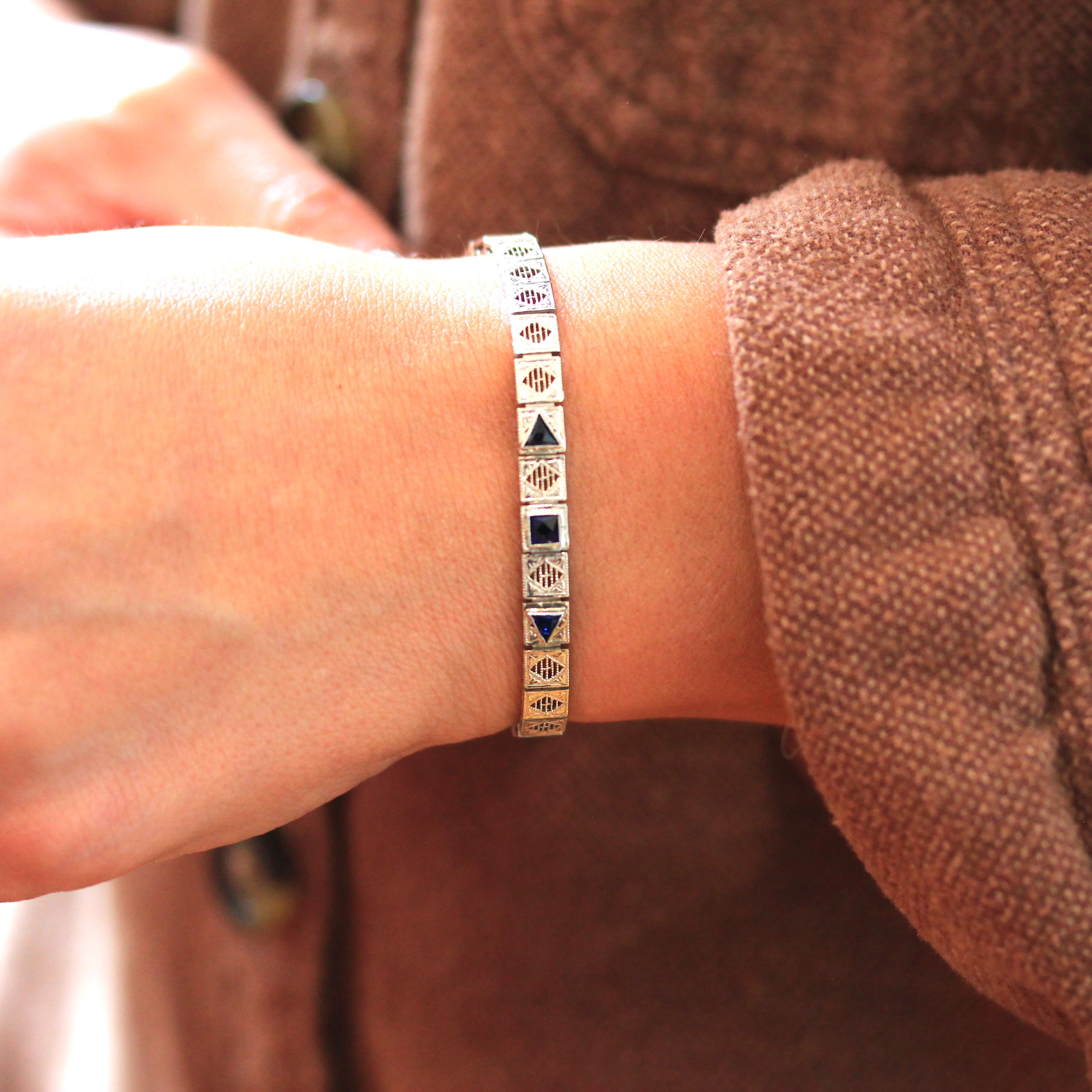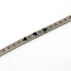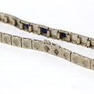 Art Deco Bracelet - Vintage 14k White Gold Created Sapphires - Circa 1930s Era Flexible Line Tennis Fashion Accessory Fine 7 Inch Jewelry