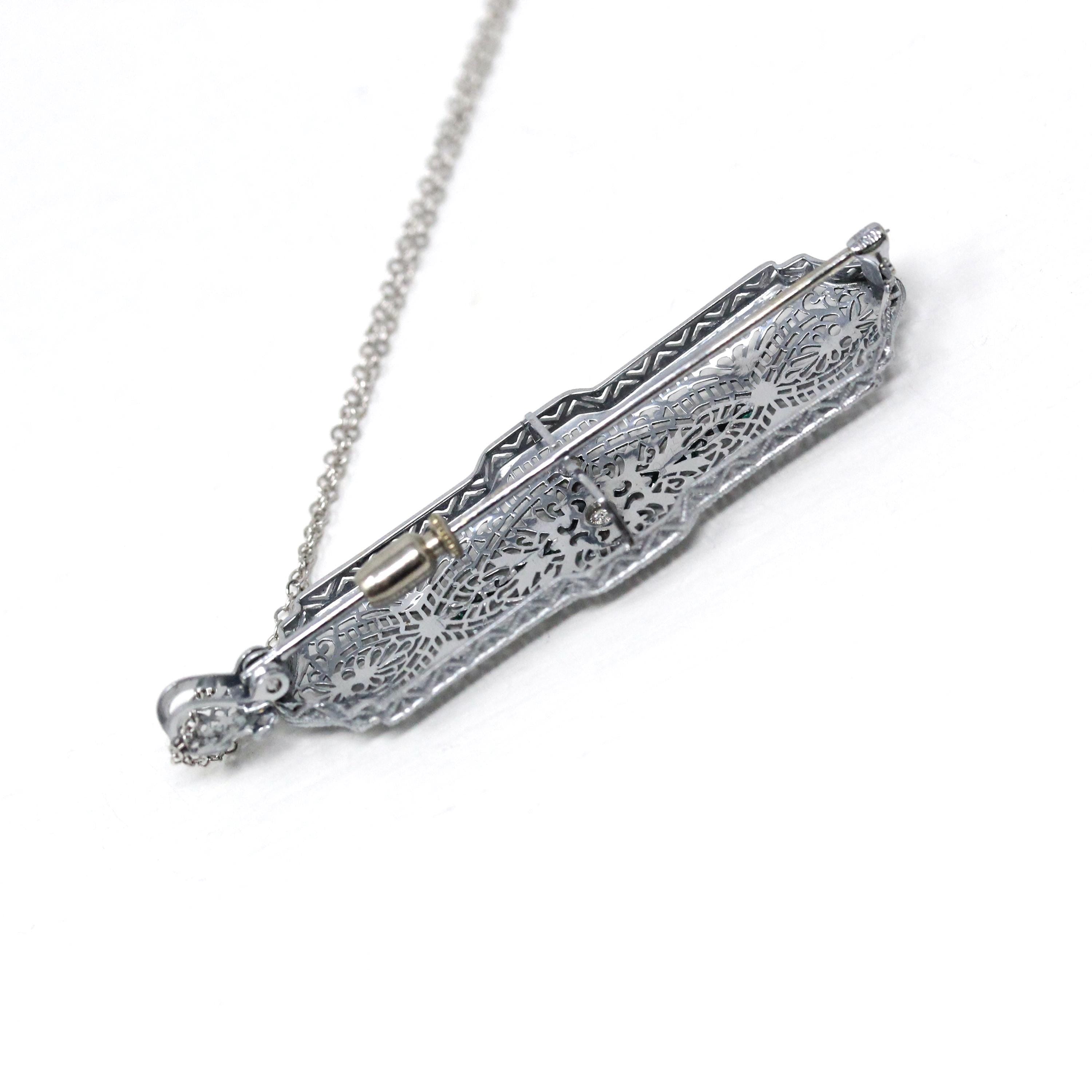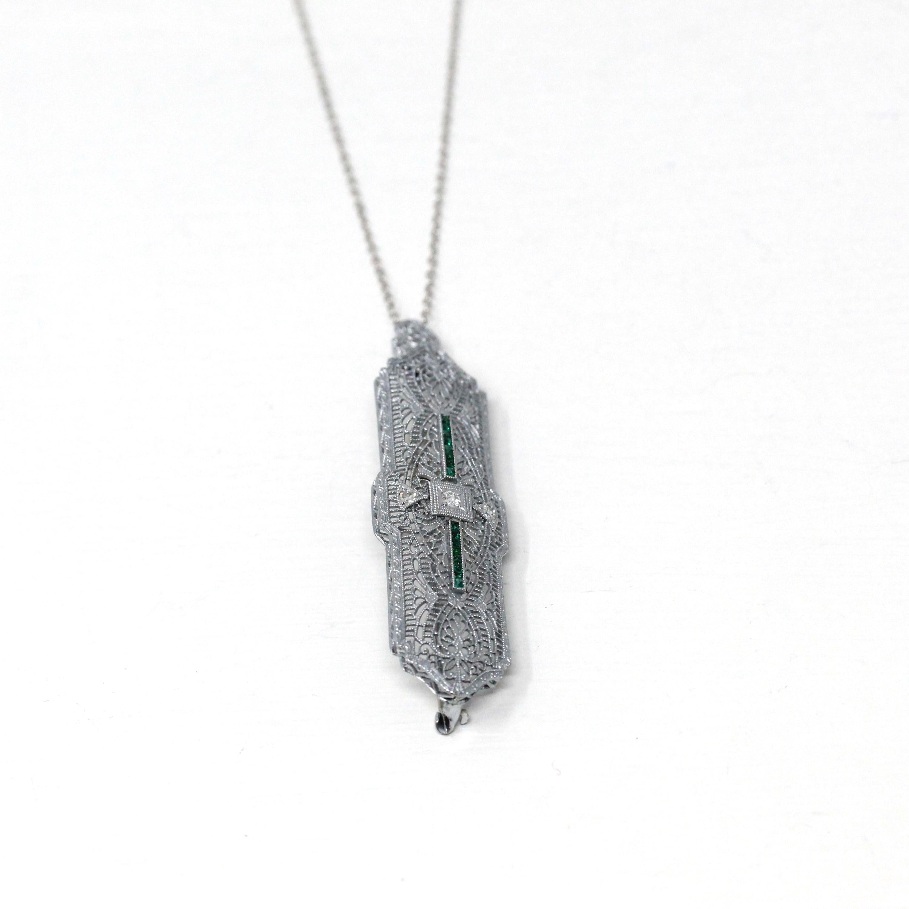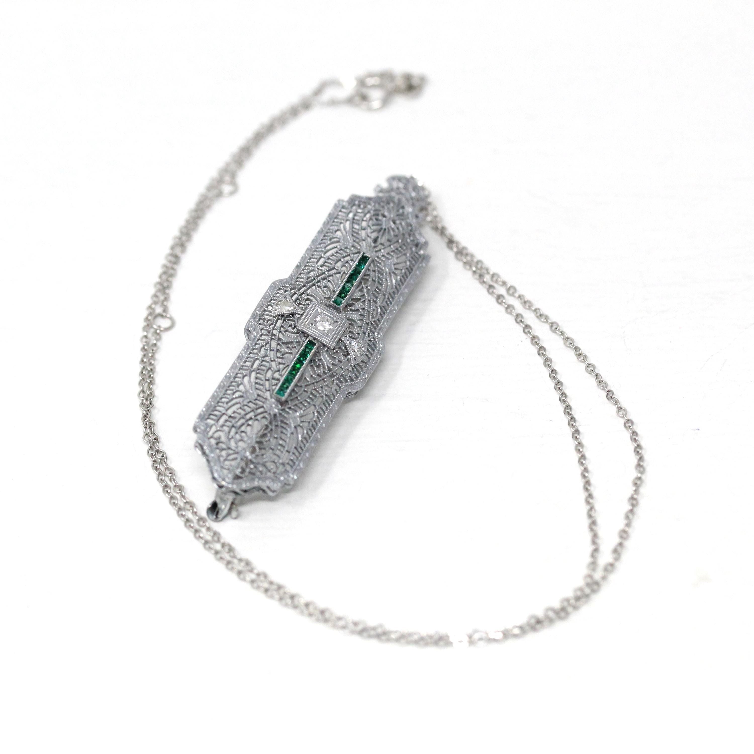 Art Deco Necklace - Vintage 14k White Gold Flower Filigree Diamond Simulated Emerald Pendant - Circa 1930s Brooch Conversion Fine Jewelry