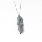 Lovely vintage circa 1930s era Art Deco 14k white gold flower pendant! Three diamonds are set toward the center of the pendant, with square cut green glass stones channel set in a line on either side. This beautiful pendant features intricate floral filigree, and is shown modeled on a brand new adjustable 14k white gold chain. This elongated pendant was originally a brooch that was converted into a necklace. A fantastic piece of fine Art Deco era jewelry!