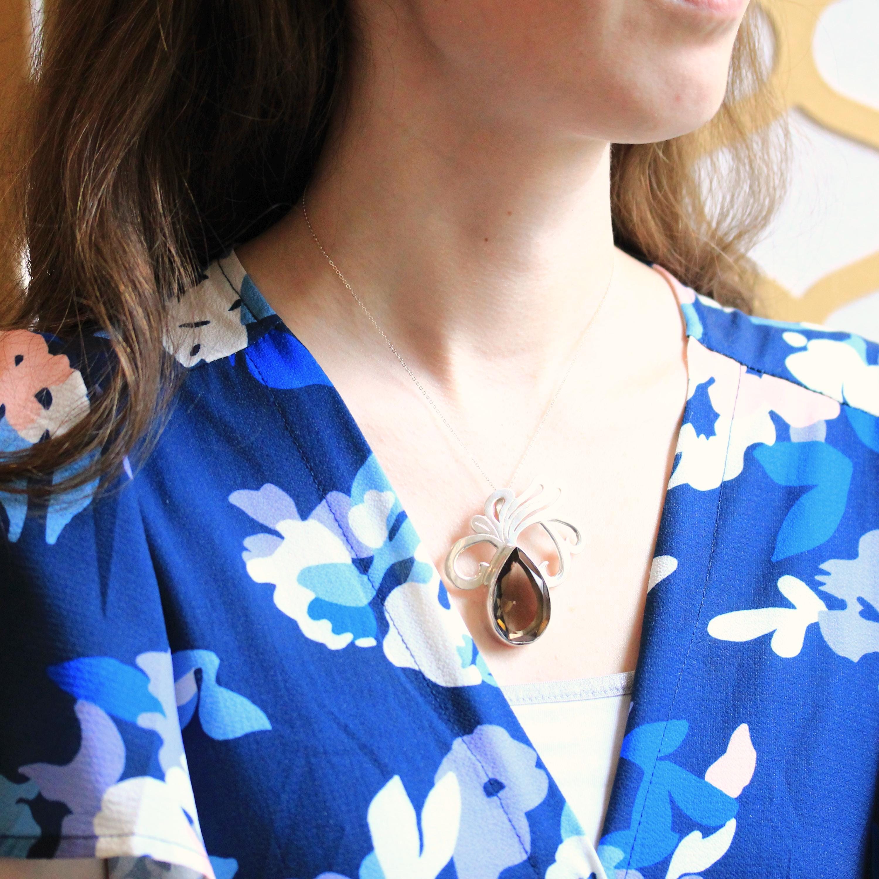 Artisan Silver Pendant - Modern Estate Pierced Scroll Metalwork - Circa 2000's Faceted Smokey Glass Teardrop Gem Amulet Fashion Jewelry