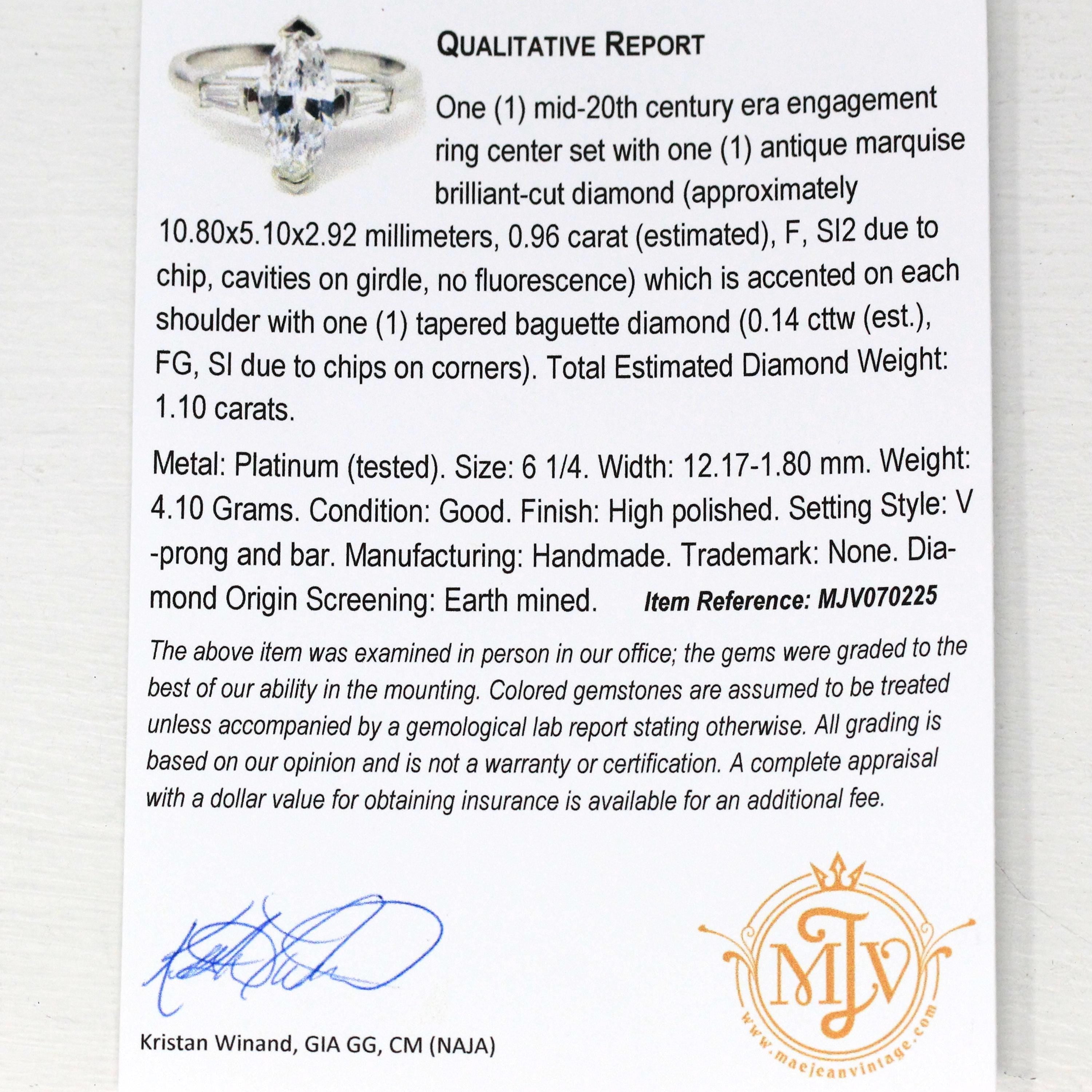 Stunning mid-century retro era vintage platinum and marquise diamond engagement ring! This statement ring features a marquise brilliant cut center diamond, accented on either side by two genuine step cut tapered diamond baguettes. All three stones are set securely in place in an unadorned mounting. The ring would make a beautiful engagement ring and comes with a qualitative report from our in house gemologist! Unique piece of fine, retro era diamond jewelry!