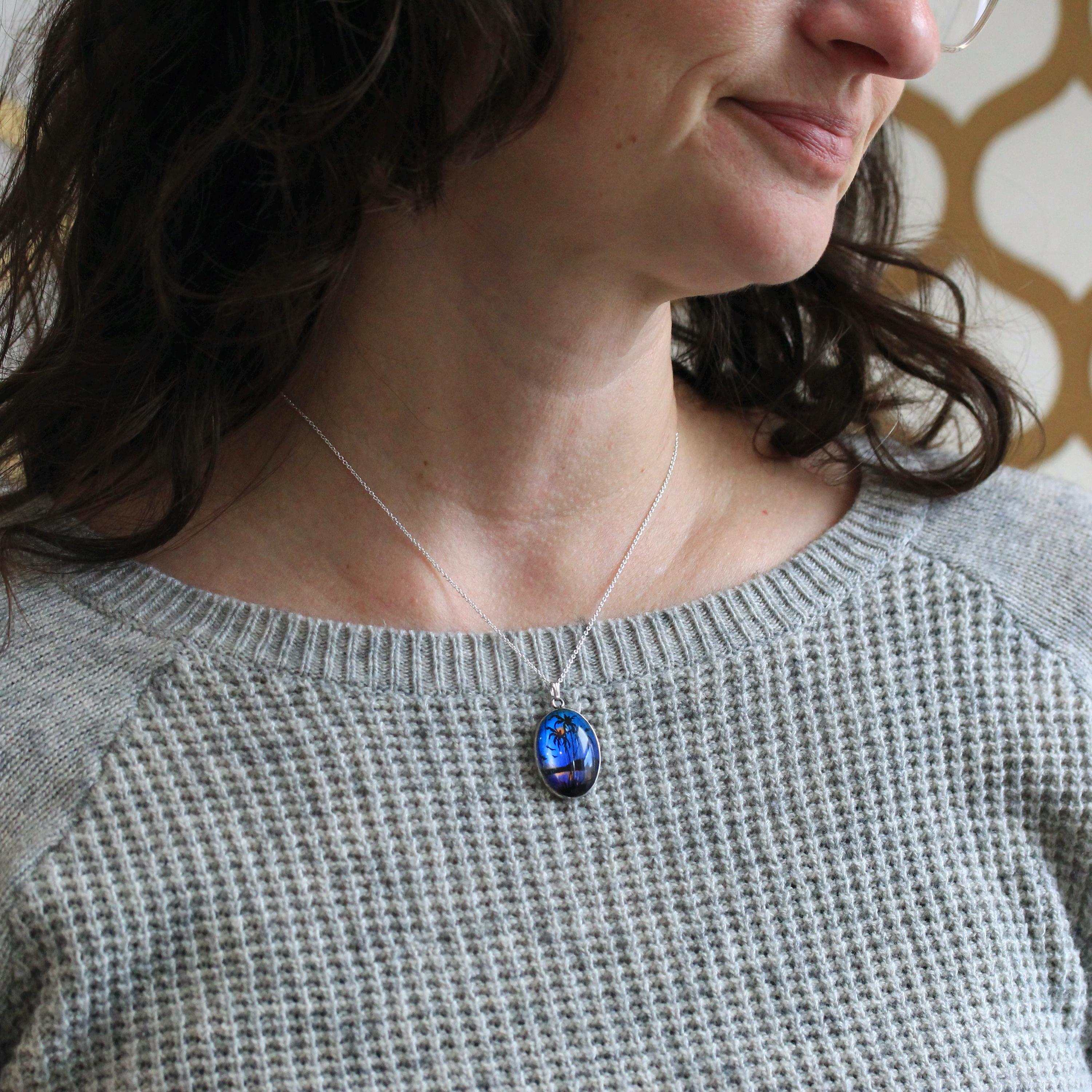 METAL / MATERIAL - Sterling silver pendant, sterling silver chain, morpho butterfly wing, lucite