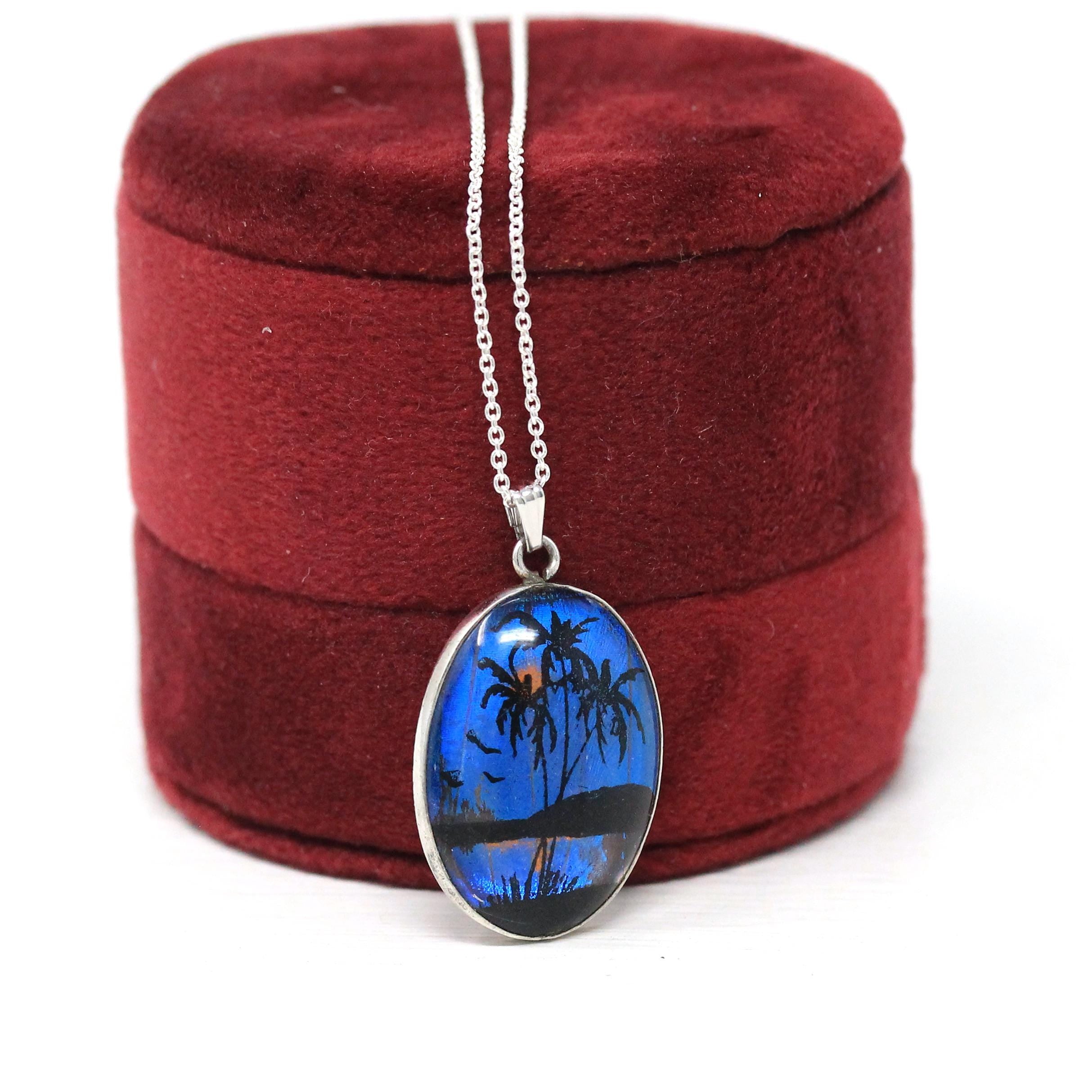 Gorgeous vintage circa 1950s Mid Century era sterling silver morpho butterfly wing pendant! This whimsical pendant features an oval shaped iridescent blue morpho butterfly wing, preserved under a clear lucite cover. Depicted on the blue wing is a tropical beach scene with three palm trees. The vintage statement charm has a bail and is shown modeled on an original sterling silver 16" chain. An incredible piece of collectible vintage souvenir jewelry from the 1950s!