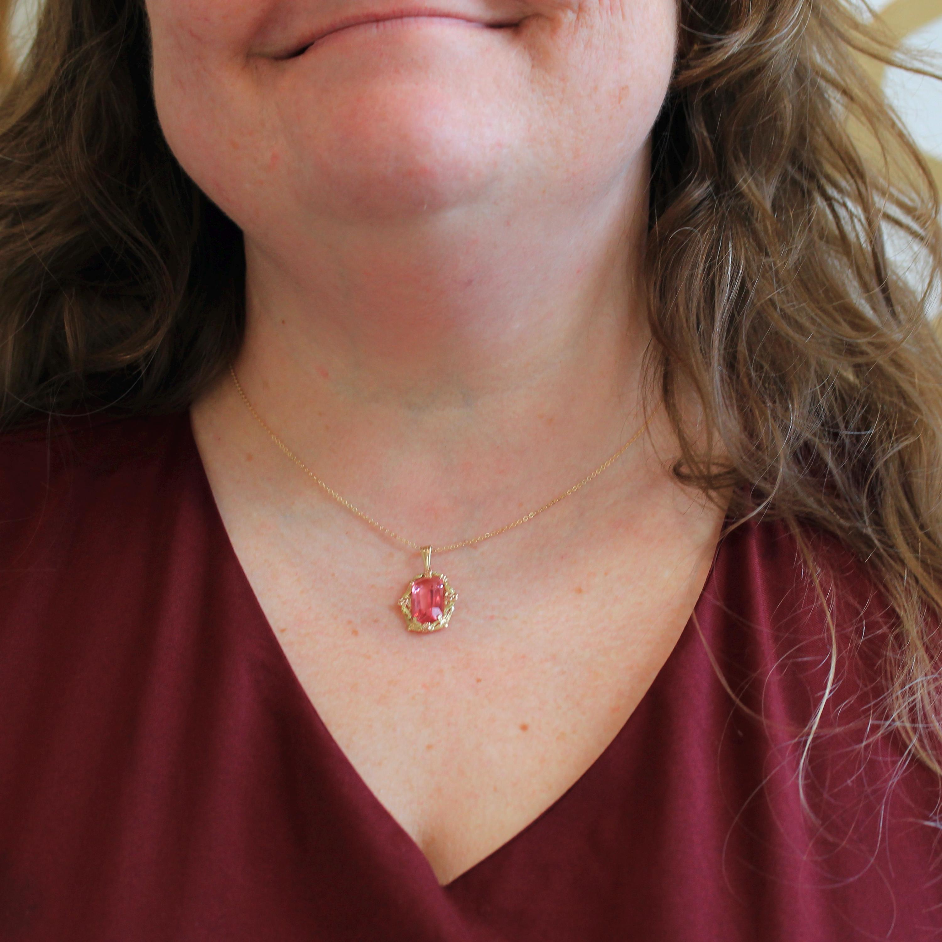 Lovely vintage circa 1940s era 10k yellow and rose gold simulated pink sapphire necklace! This pretty pendant features a rectangular faceted pink glass stone in a two tone Retro style frame with pretty rose gold flower motifs. The retro pendant is shown modeled on a brand new 14k gold filled 18" chain. A beautiful two tone necklace, featuring one of September's birthstone colors!