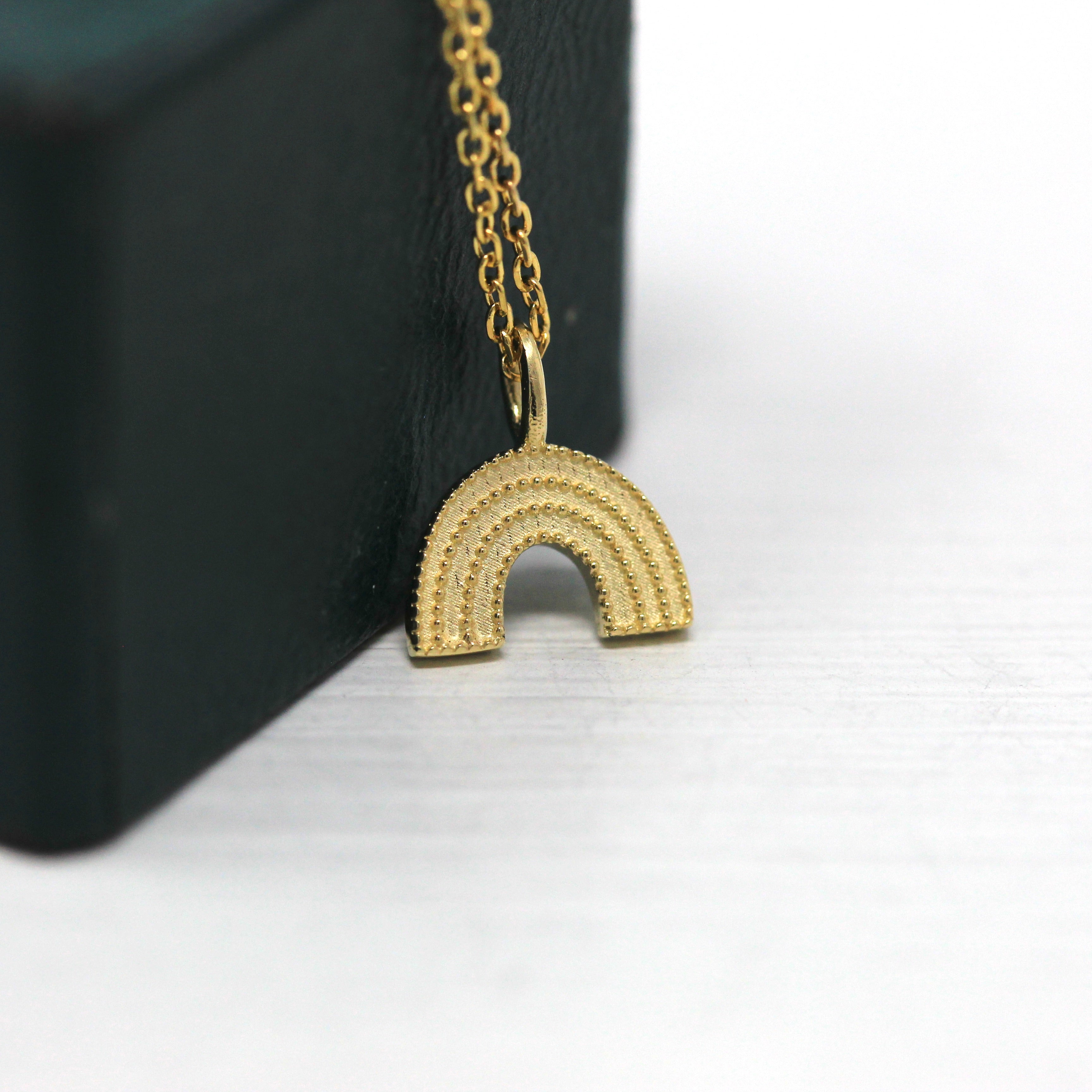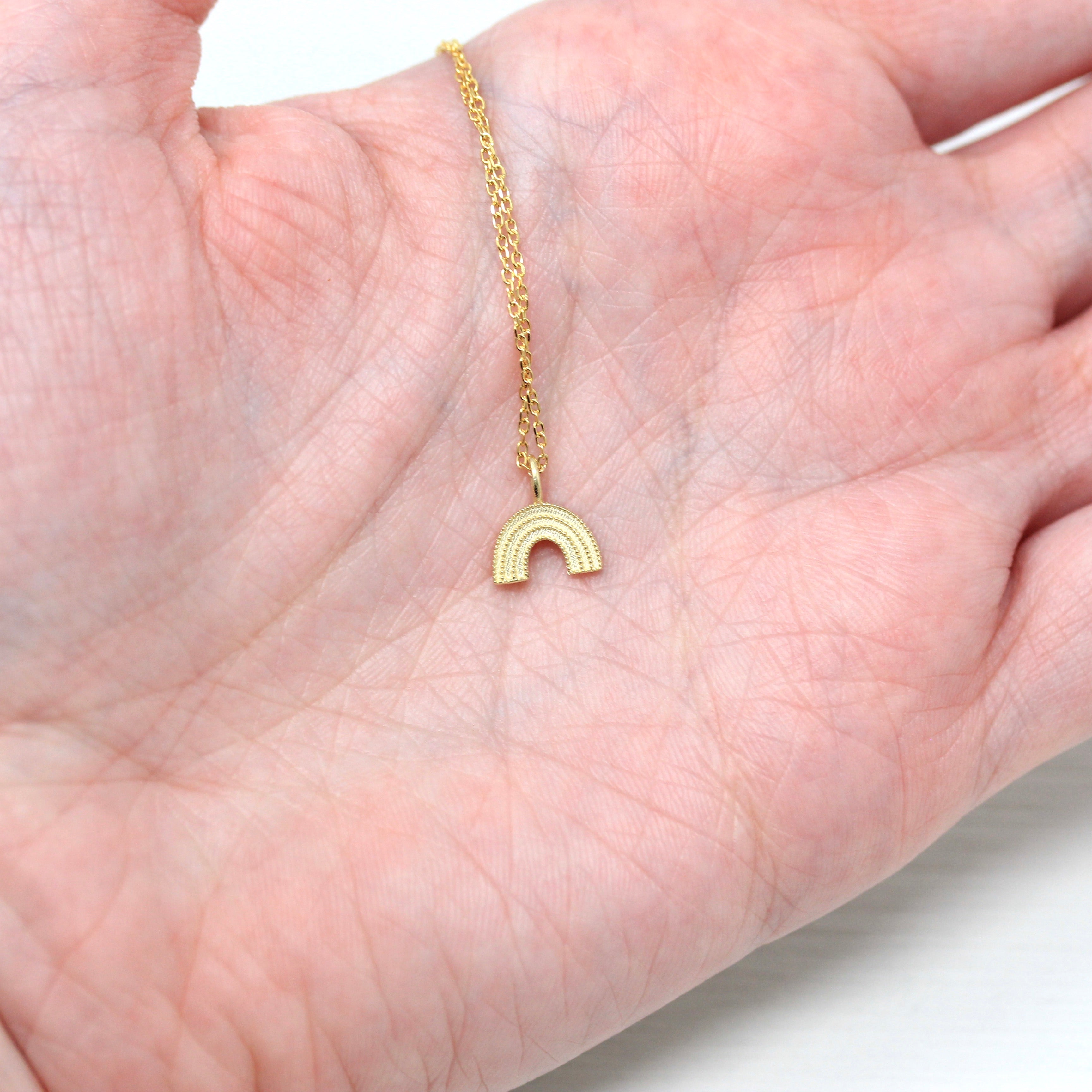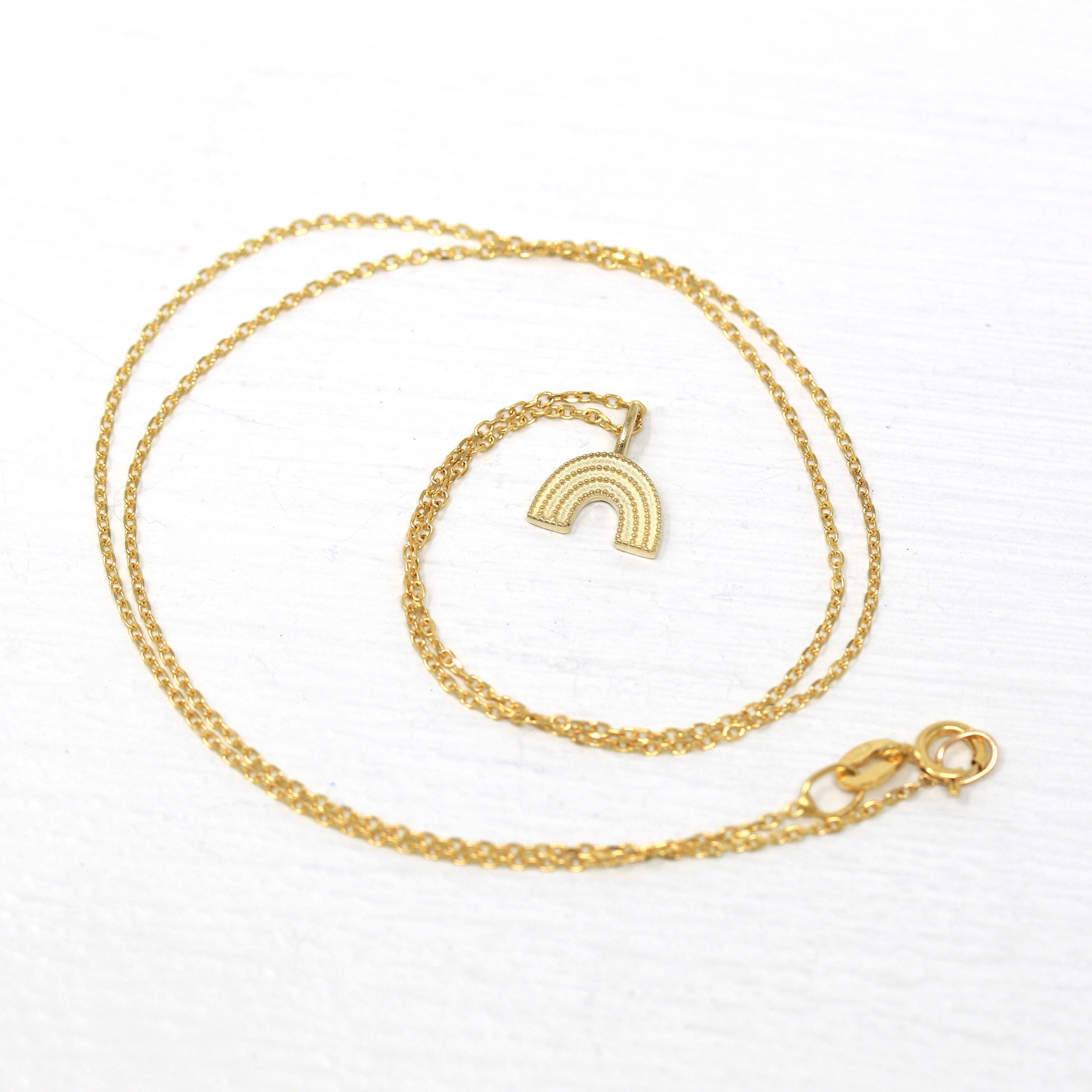 The sweetest little solid 14k rainbow charm, with milgrain detail! The rainbow pendant hangs from a 16 inch 14k chain that secures with a spring clasp.