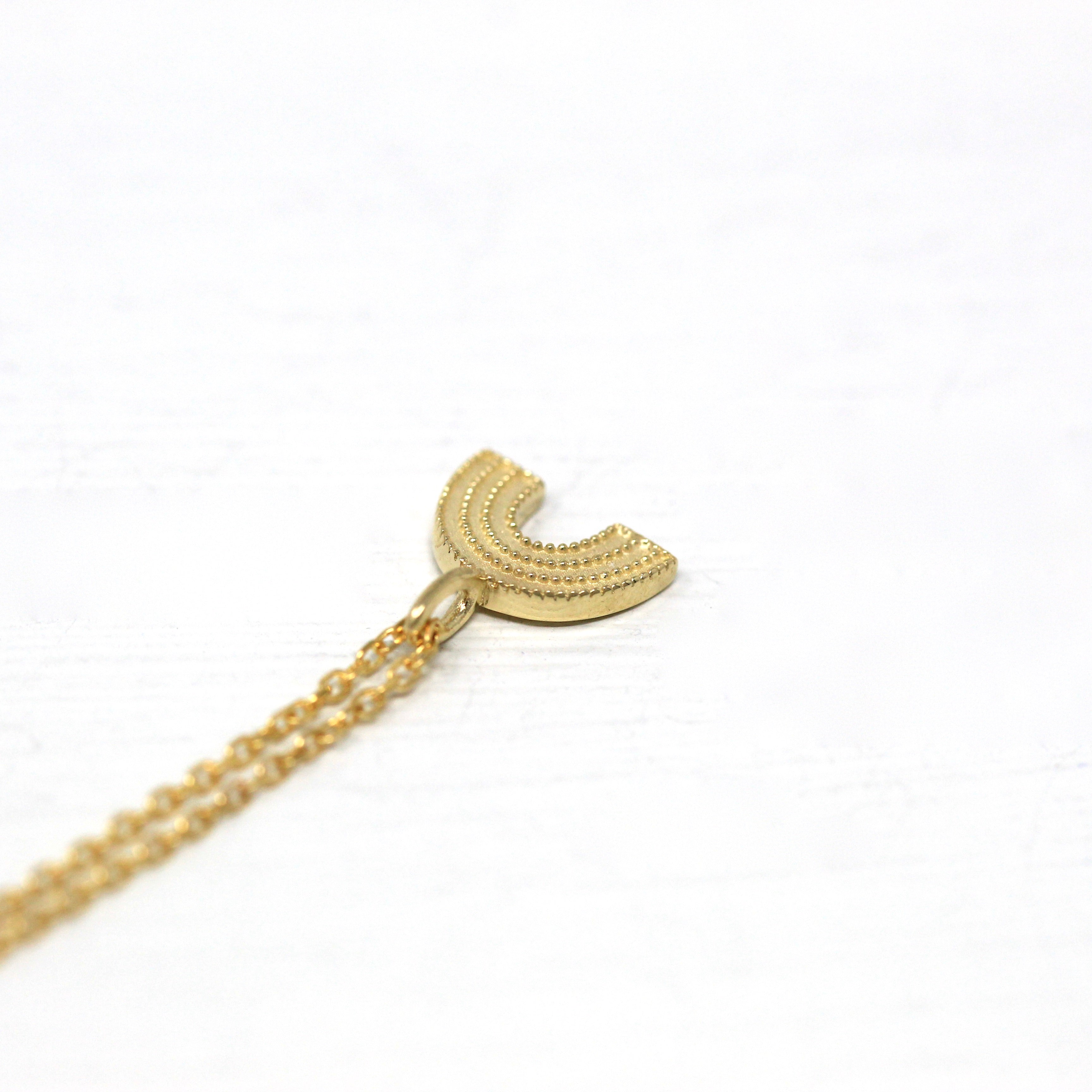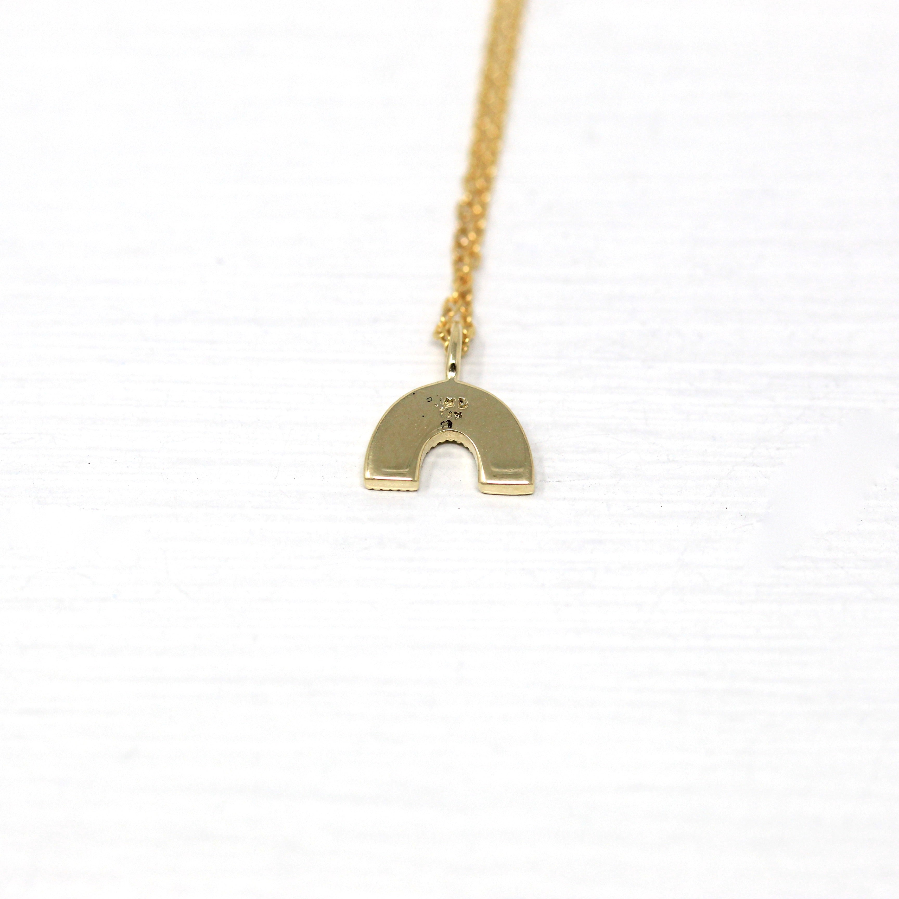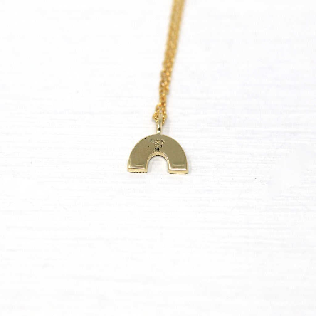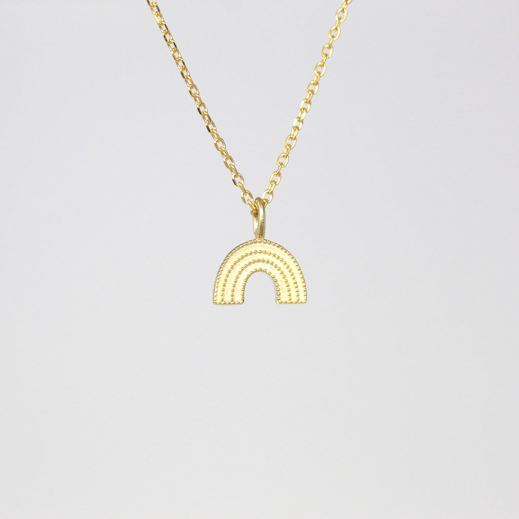 The sweetest little solid 14k rainbow charm, with milgrain detail! The rainbow pendant hangs from a 16 inch 14k chain that secures with a spring clasp.