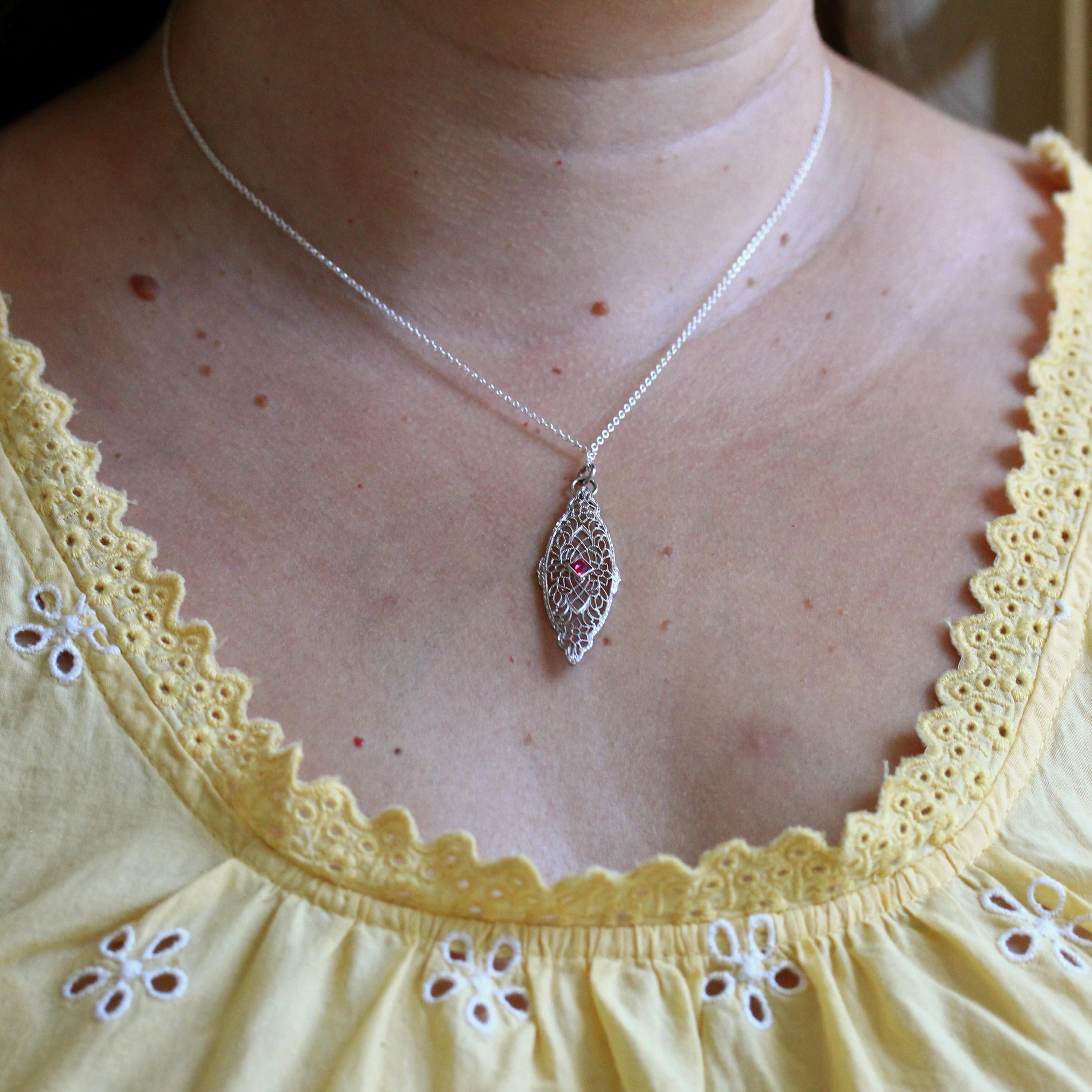 Beautiful vintage circa 1930s era Art Deco 10k white gold created ruby necklace! This stylish pendant has an elongated oval shape, that features intricate floral filigree. The piece is further embellished with a created ruby, and is shown modeled on a brand new sterling silver chain. A fantastic piece of fine Art Deco era jewelry, featuring July's birthstone!