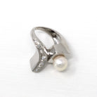 Phenomenal vintage circa 1950s era Mid Century 14k white gold cultured pearl & diamond ring! This fabulous modernist style pinky ring features a beautiful cultured pearl, along with six sparkling diamonds. The unique Avant garde setting is free of design, and has stylish geometric bold swirling construction. A fun & funky Mid Century pinky ring, featuring June's birthstone!
