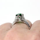 Simulated Emerald Ring - Vintage 1930s 14k White Gold Green Faceted Glass Gem Solitaire - Art Deco Sz 5 3/4 Fine Filigree Birthstone Jewelry